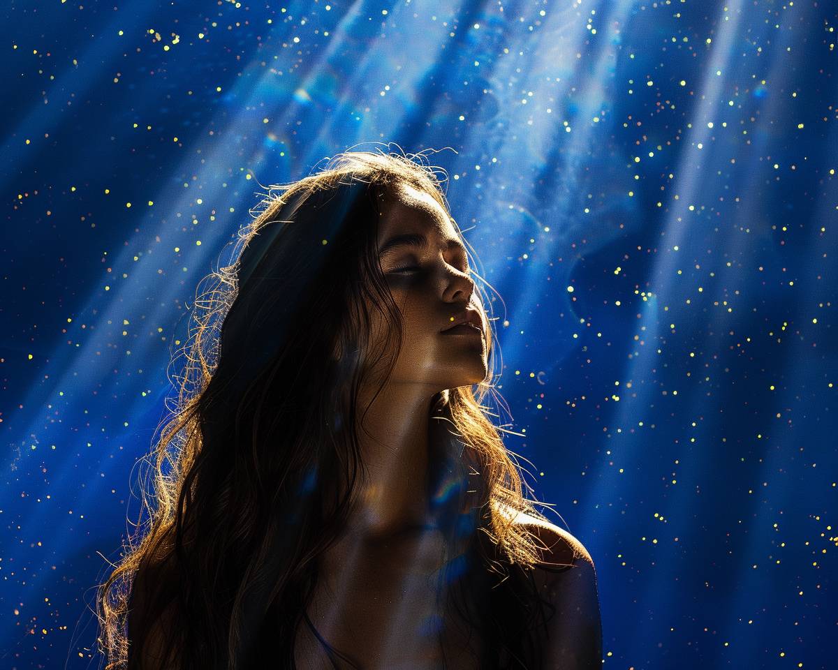 high contrast photo of a Summer tanned Girl with long hair, her skin is illuminated by sun rays. Deep blue background represents the infinite space filled with star. --ar 5:4 --no hat --v 6.0