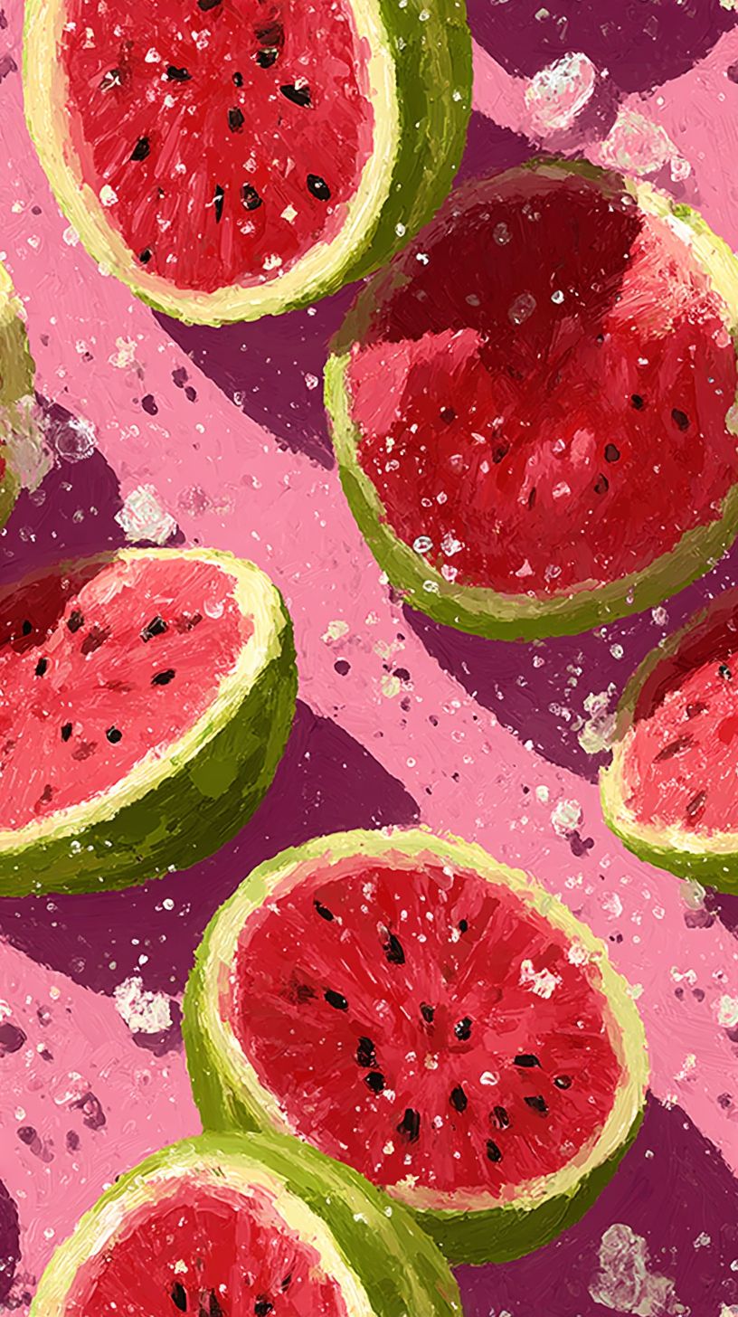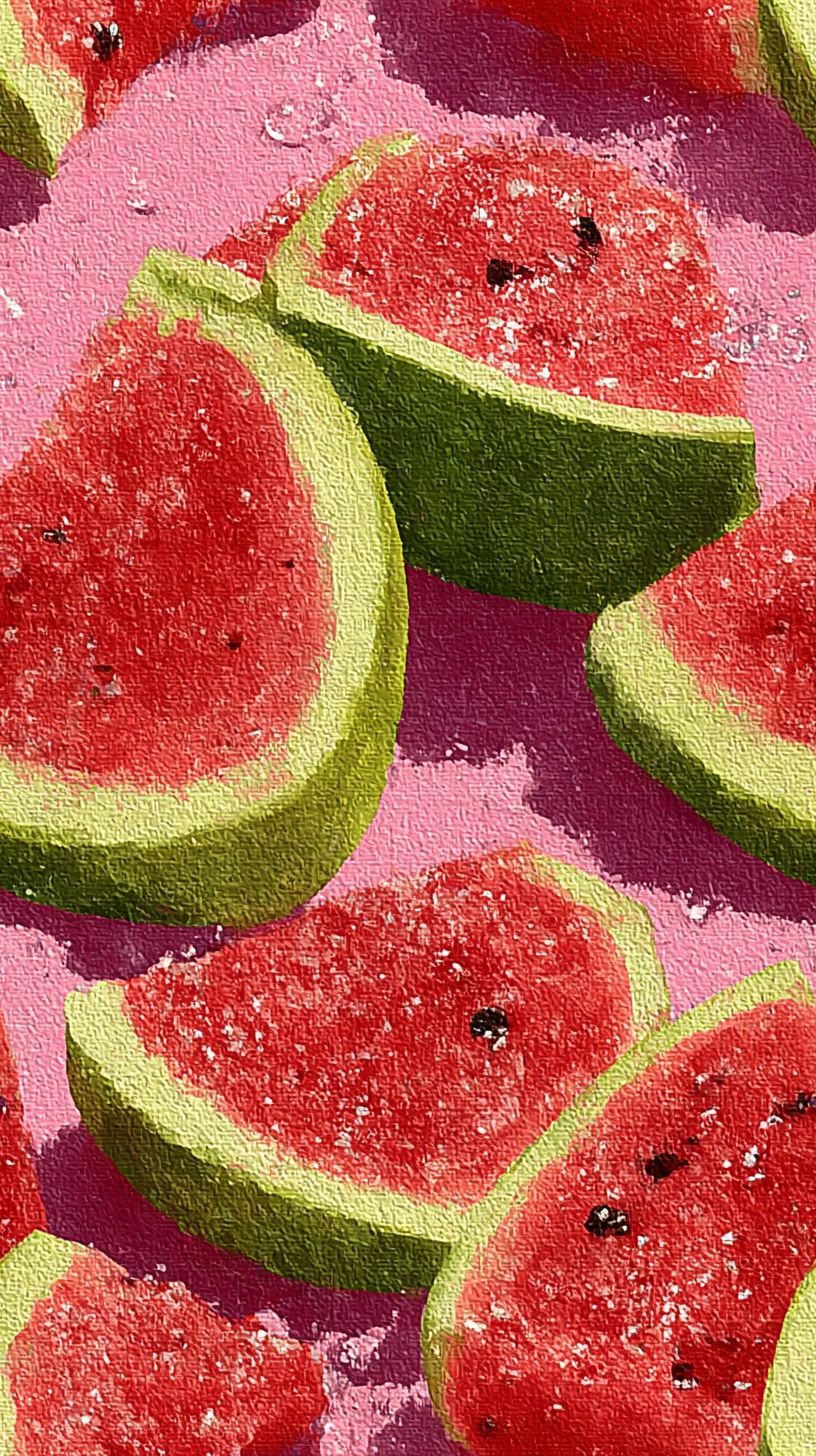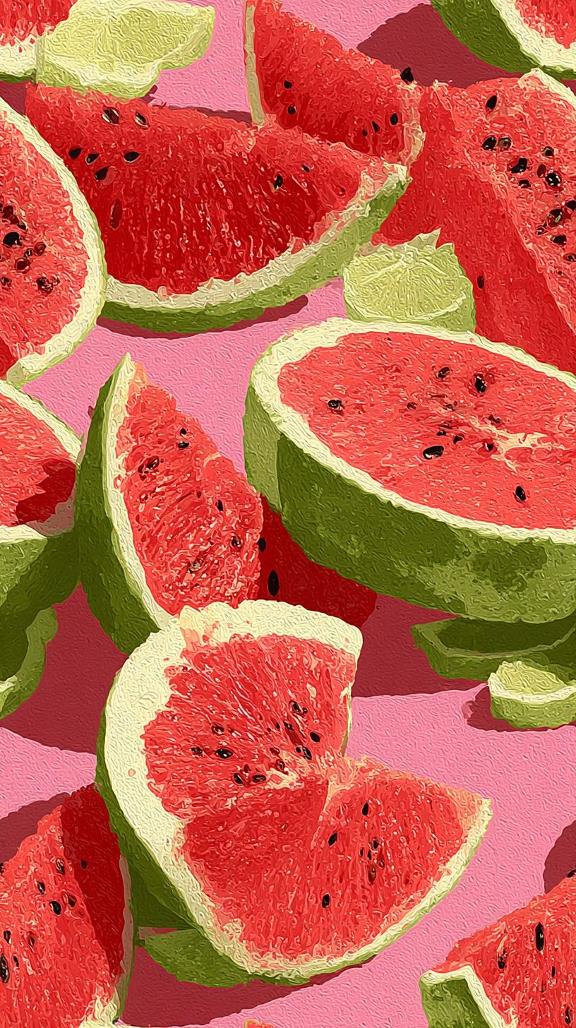 A seamless pattern with watermelon, A seamless pattern with watermelon slices, Pink background with a pink watermelon pattern, Pink background with a watermelon pattern, cute, cute illustration, cute pink and green colors, perfect for adding color to your scrapbooking pages or junk journal designs. The background is a single pastel color with no text., their pink and green hues evoking the essence of summer. Impressionism meets illustration in this vibrant wallpaper design. The soft brushstrokes capture light playfully dancing on the fruit's surface, their vibrant pink and green hues creating an eye-catching design. The artwork captures the essence of summer in a playful way, while subtle details like tiny seeds add depth to each slice in a flat --tile --v 7.0 --ar 9:16 --s 750