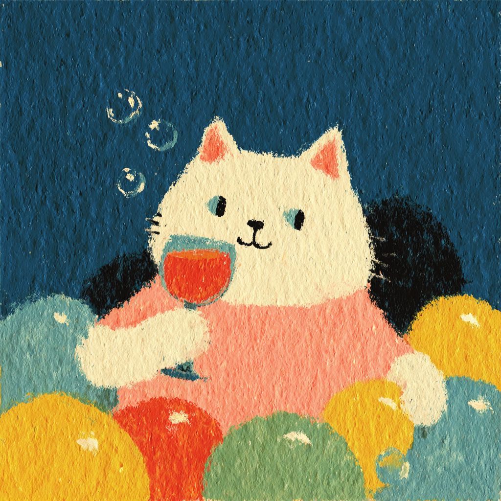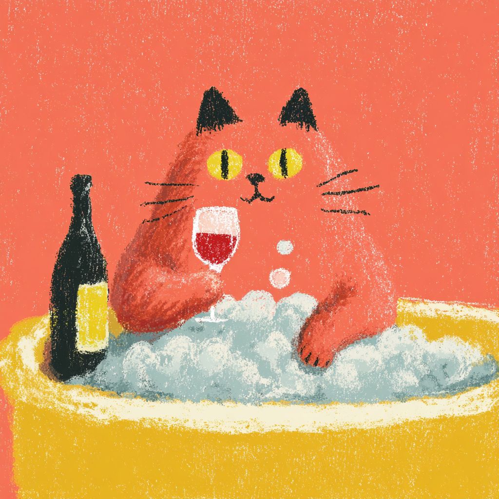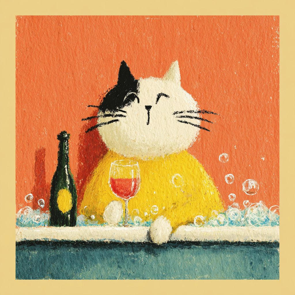 뚱뚱한 고양이가 거품으로 가득 찬 욕조에서 여유롭게 레드와인을 마시고 있으며, 관객을 바라보고 있습니다. 깨끗하고 단단한 네온 대비 색상 배경, 전체 디자인은 추상적으로, 손으로 그린 일러스트, 미니멀리스트 그래픽, 선 아트, 단색, 굵은 윤곽선, 굵은 붓질, 선화 및 미니멀리즘을 특징으로 합니다. 초상화를 윤곽짓고, 슈퍼 디테일, 고와시와 아크릴을 혼합하고, 네온 대비 색상의 단색 배경, wwnmemo 스타일, 초현실주의, 전체 몸이 연한 금색 글리터로 덮여 있습니다.
