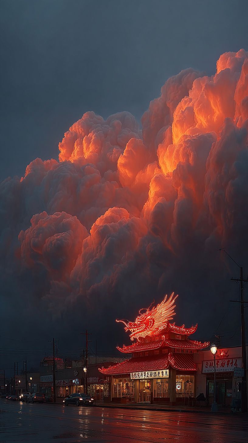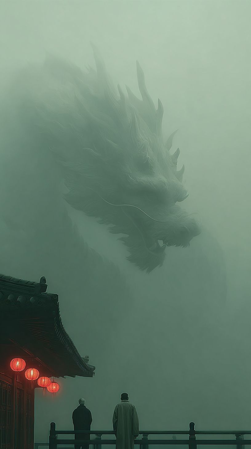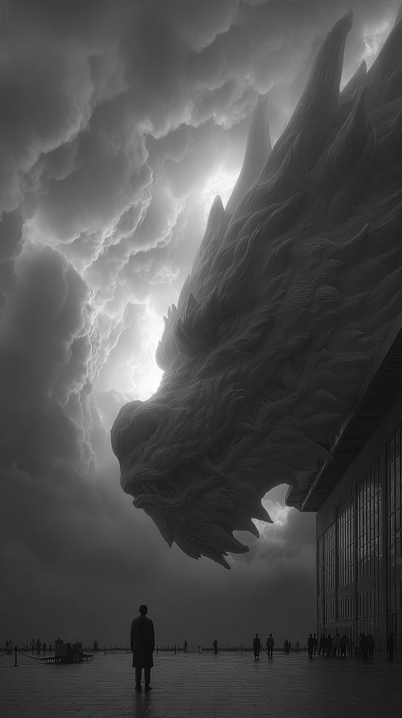 거대한 중국용이 어두운 구름 속에서 희미하게 떠오른다