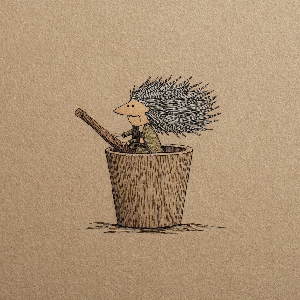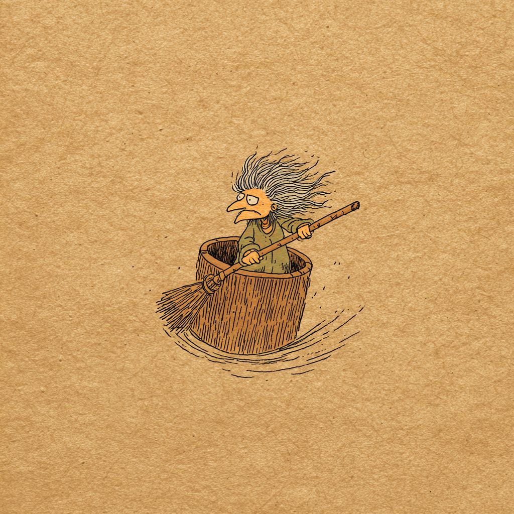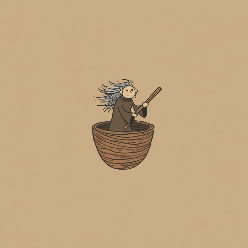 Minimalist drawing, Баба-Яга летит в ступе, русские сказки, russian folklore, she stands inside the stupa - a large and tall wooden cup-shaped mortar. Baba Yaga, a wizened crone of Slavic legend. Her tangled grey hair streams wildly behind her as she grips the pestle, using it as a rudder to navigate the turbulent winds. simple lines, she is an old slavic woman, brown paper background, cartoon style, drawn by hand, children's book illustration style, simple, cute, doodle style. --ar 1:1 --v 7.0