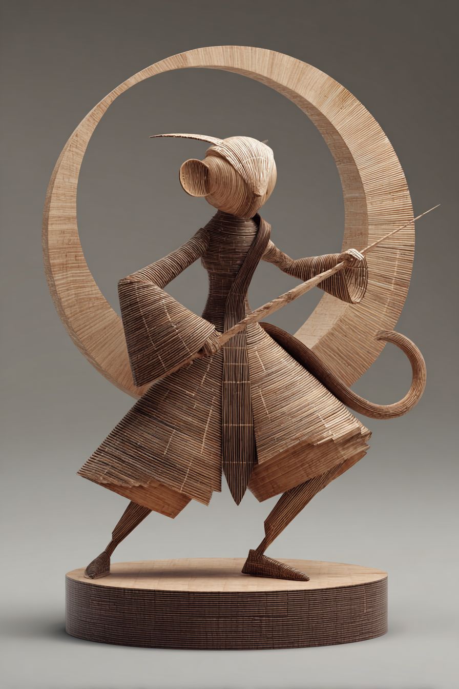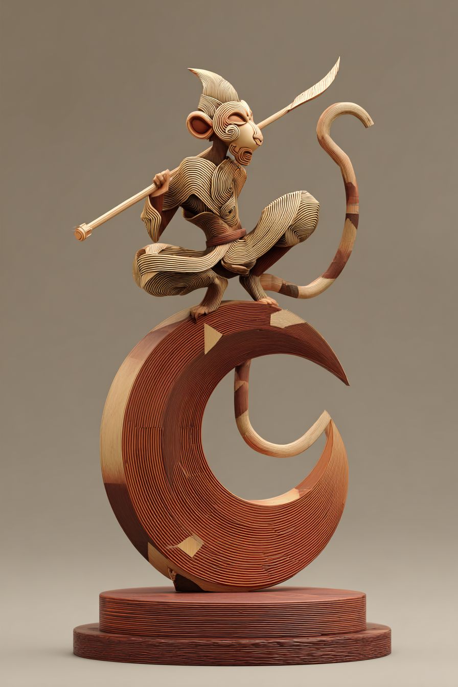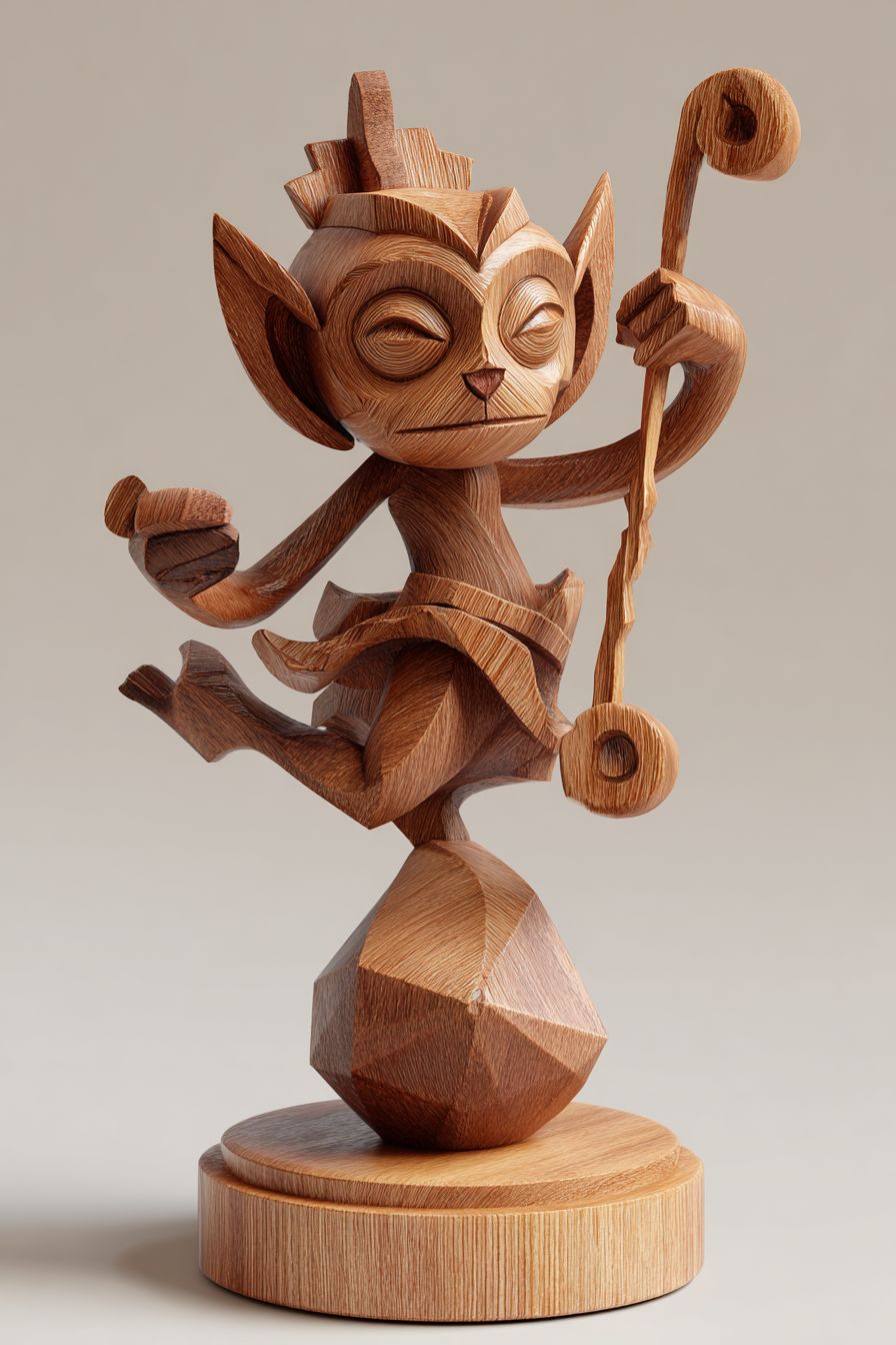 Blind box wood carving, anthropomorphized IP of Sun Wukong, geometric shape, smooth curves, standing on a circular base with a simple and elegant design, created using C4D, Blender, and OC Renderer, high definition, masterwork, solid color background. --v 7.0 --ar 2:3