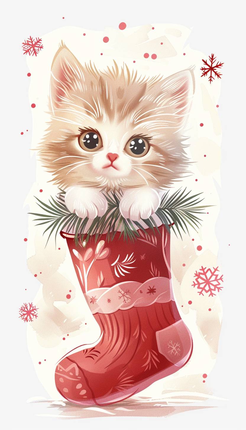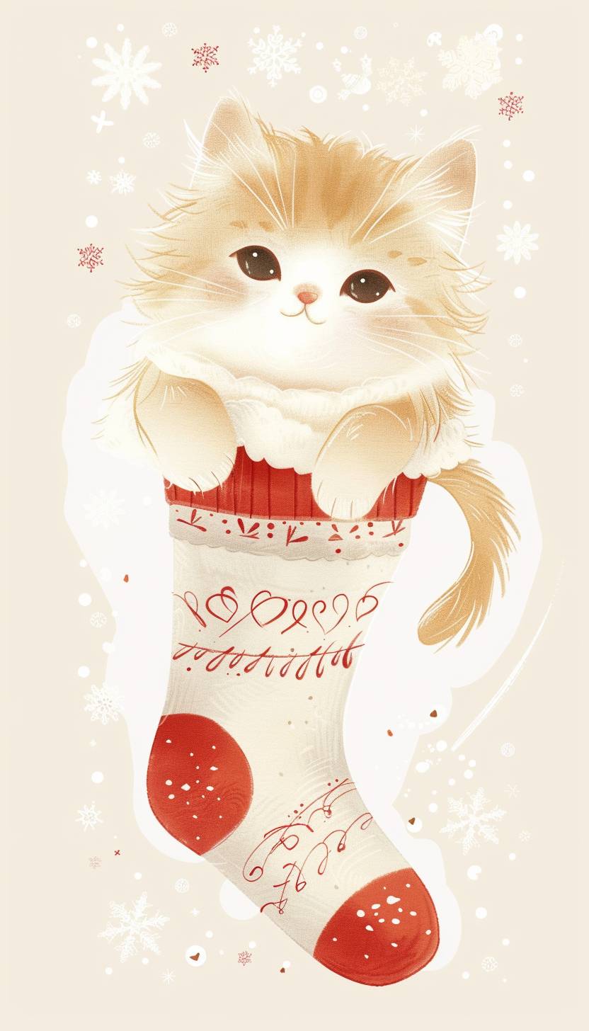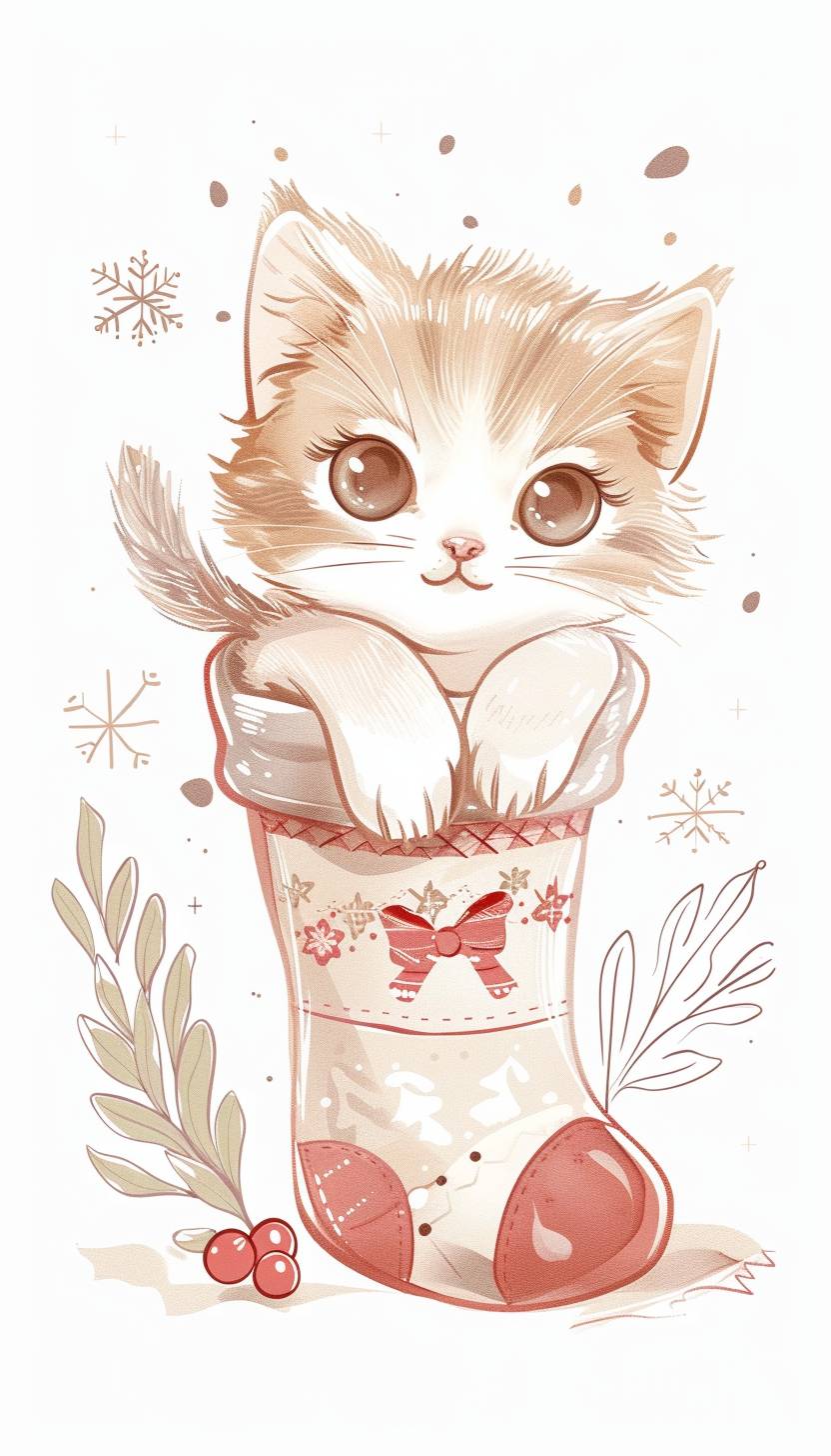 minimalistic cute adorable kawaii shiny baby kitty , peaking from a Christmass sock with subtile Christmas details on it, white background with subtile Christmass details around the kitty, soft pastel , beige, soft light red and milky colours, cartoon , smooth shading, chalk style isolated, --ar 4:7 --v 6.0