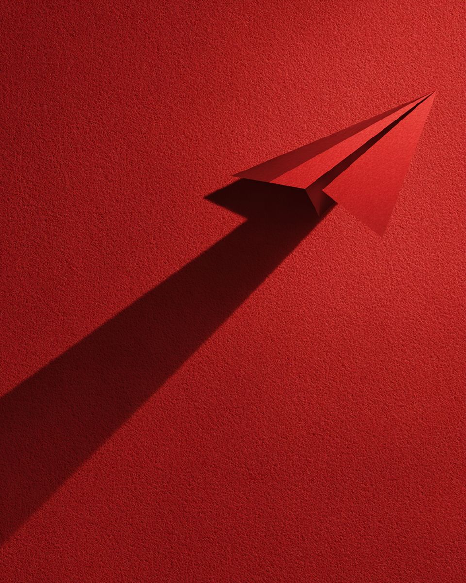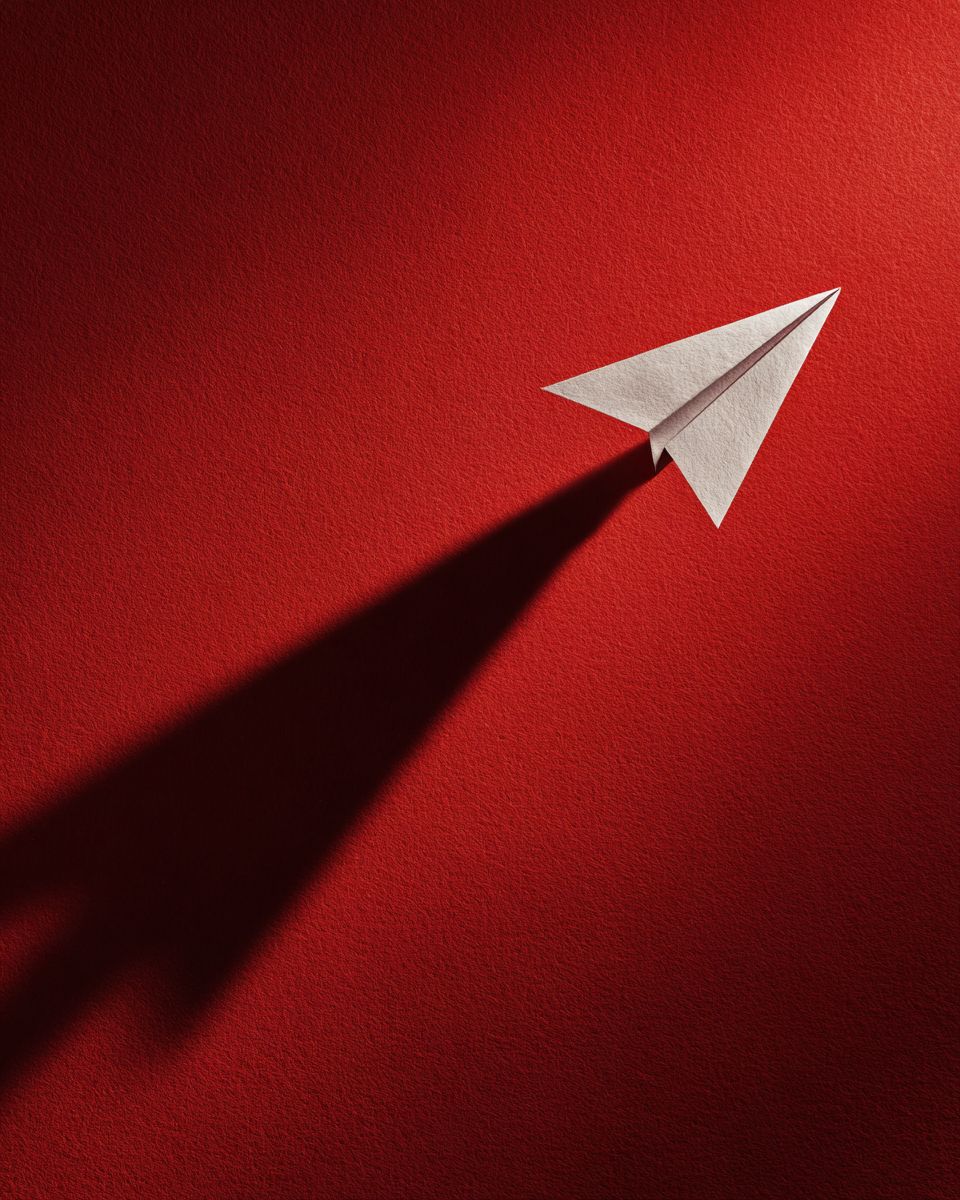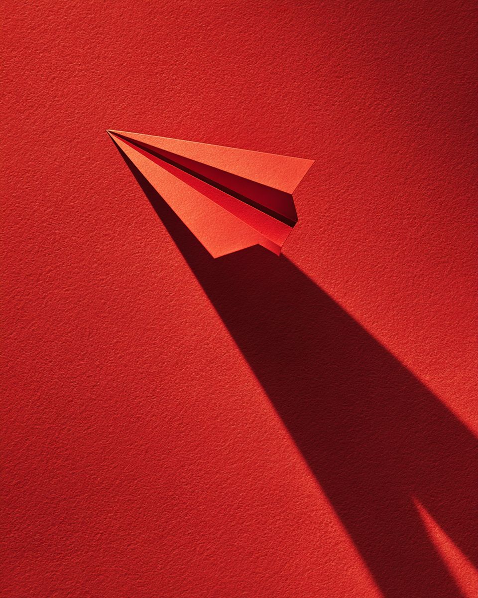 Isolated red background with paper airplane, shadow play, --ar 4:5 --raw --v 7.0