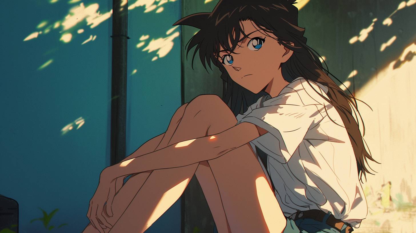 명탐정 코난의 레이첼 무어는 긴 검은 머리를 가진 귀여운 소녀로, 열린 흰 셔츠를 입고 벽에 기대고 있으며, 뒤에는 빛줄기가 있습니다. 이것은 황금 시간에 촬영된 전신 초상화이며, 단색으로 만화 스타일로 렌더링되어 있으며, 신카이 마코토의 스타일과 유사합니다.
