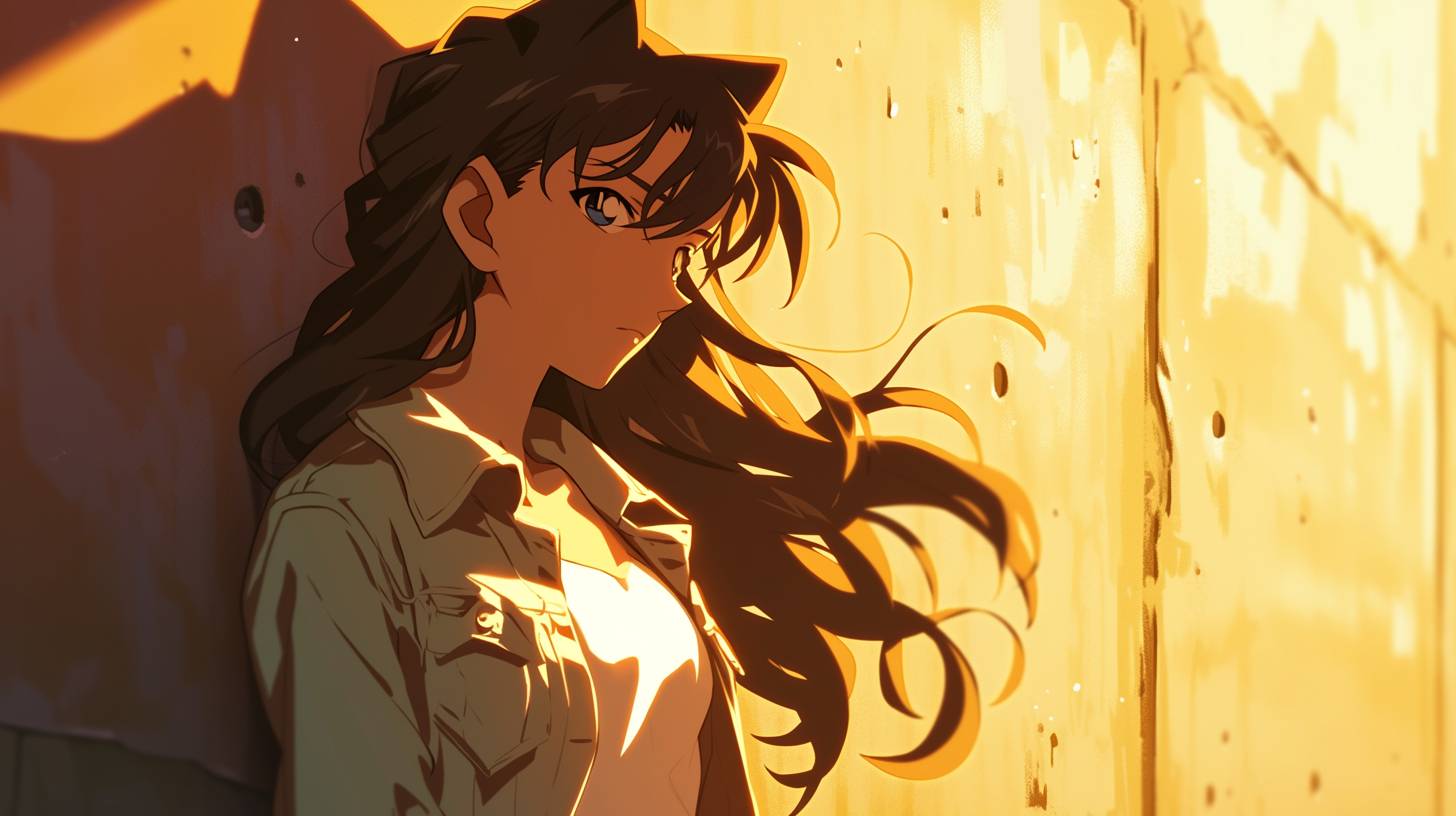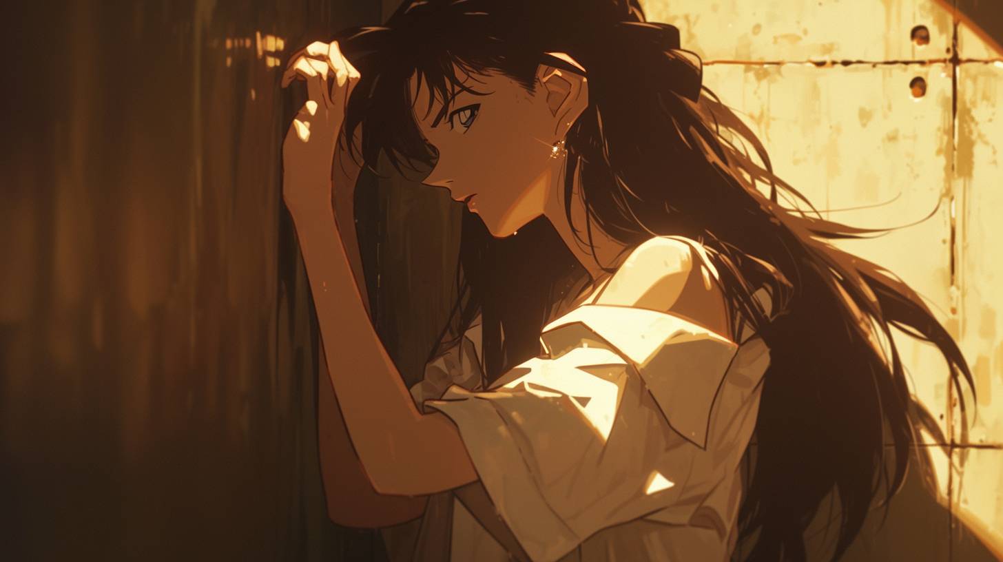 Rachel Moore in Detective Conan, a cute girl with long black hair, wearing an open white shirt, leaning against a wall, with a ray of light behind her. This is a full-body portrait, in the golden hour, with a single color and cartoon rendering, similar to the style of Makoto Shinkai --ar 16:9 --stylize 180 --niji 6