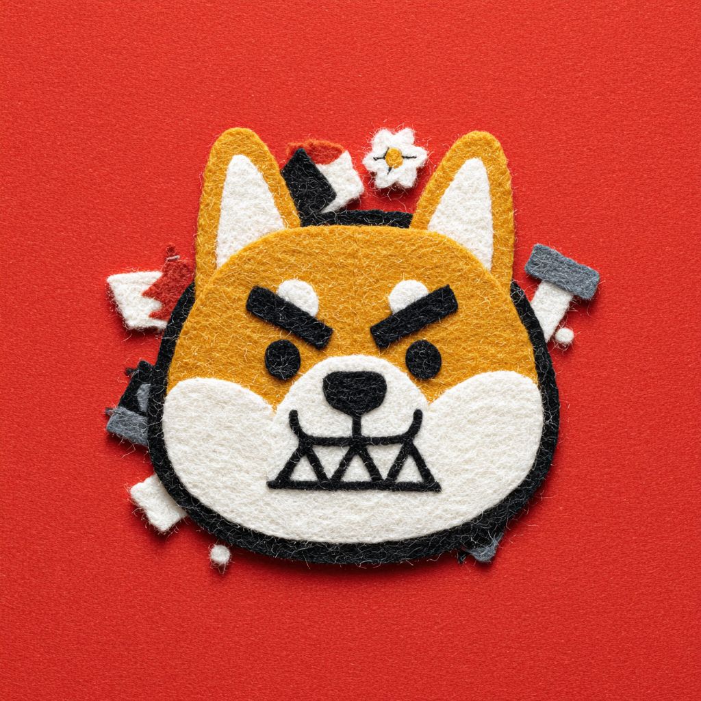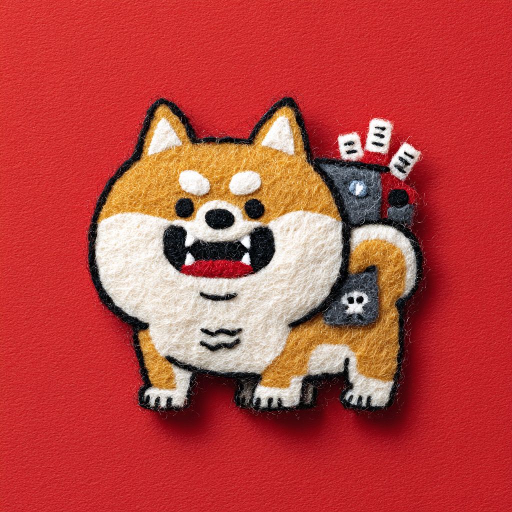 귀엽고 엉뚱한 픽사 스타일의 시바 이누, 큰 눈, 반짝이는 몸, 사악한 표정, 만족스러운 악당의 미소, 빨간 배경에서의 클로즈업 샷, 카메라를 3/4 측면에서 바라보는 머리, 픽사 및 아동 도서 일러스트 스타일, 울 펠트 직물 예술, 모 윌렘스 스타일.