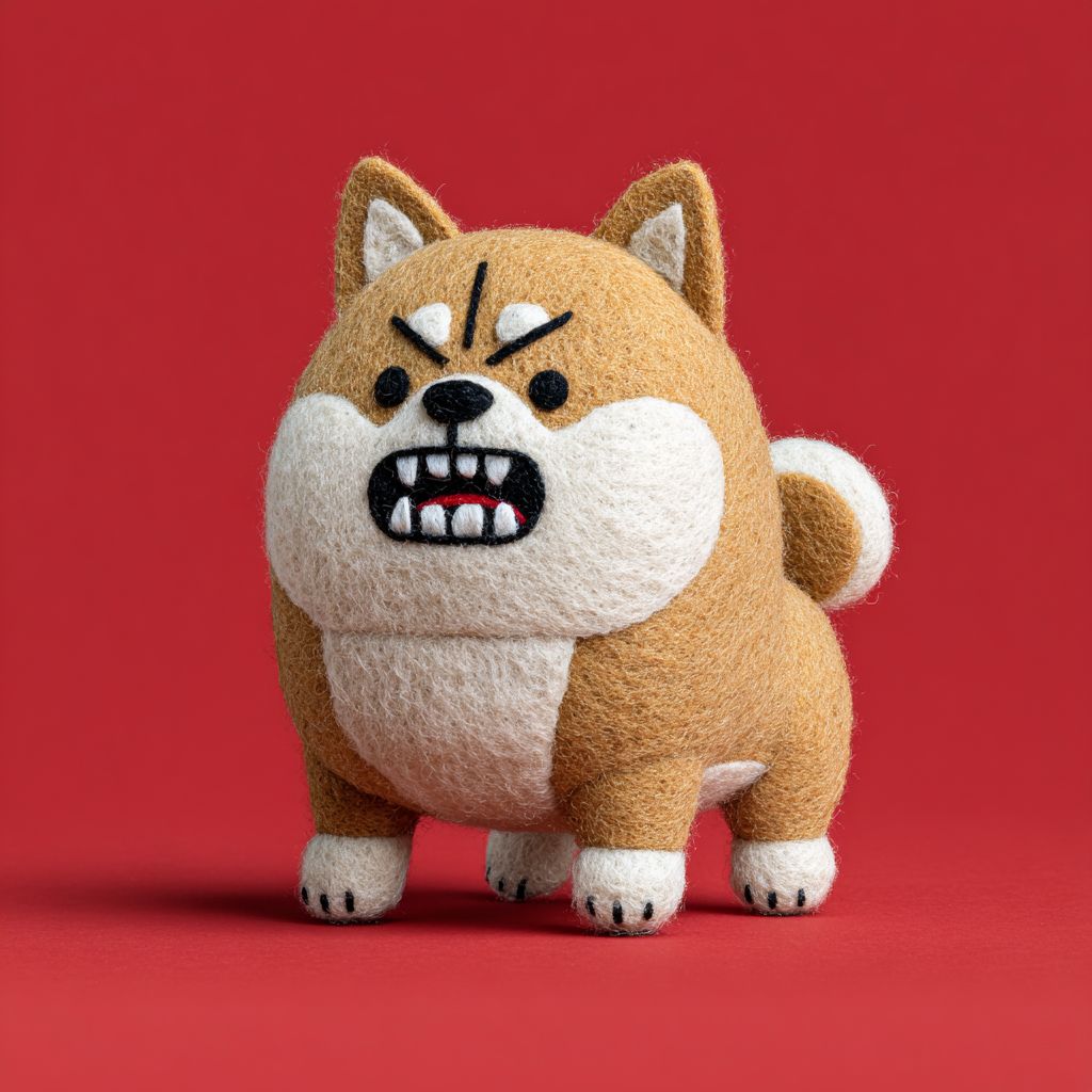 A cute, silly Pixar-style cartoon Shiba Inu with big googly eyes, shiny body, Evil expression, Grinning, evil smile, close-up shot on a red background, head looking at the camera in a 3/4 side view, Pixar and children's book illustration style, wool felt fabric art, Mo Willems style. --chaos 10 --ar 1:1 --raw --profile gcw88m7 --s 750