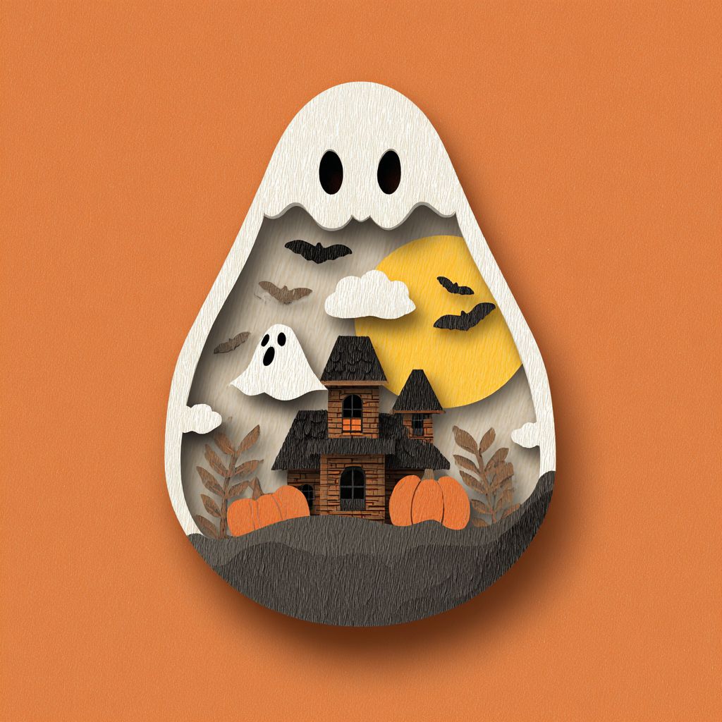 A simple, cute, flat, wooden, 3 Layer laser-cut sculpture of an BOO-shaped BOO with a Halloween scene inside. In the middle, there is haunted house surrounded by ghosts and pumpkins, against a orange background, a white wall, a dark grey clouded sky, a yellow moon, and black bats flying around. This artwork is in the style of vector, wood carving, grayscale, with deep shadows, and a white background, in a logo style. --stylize 50