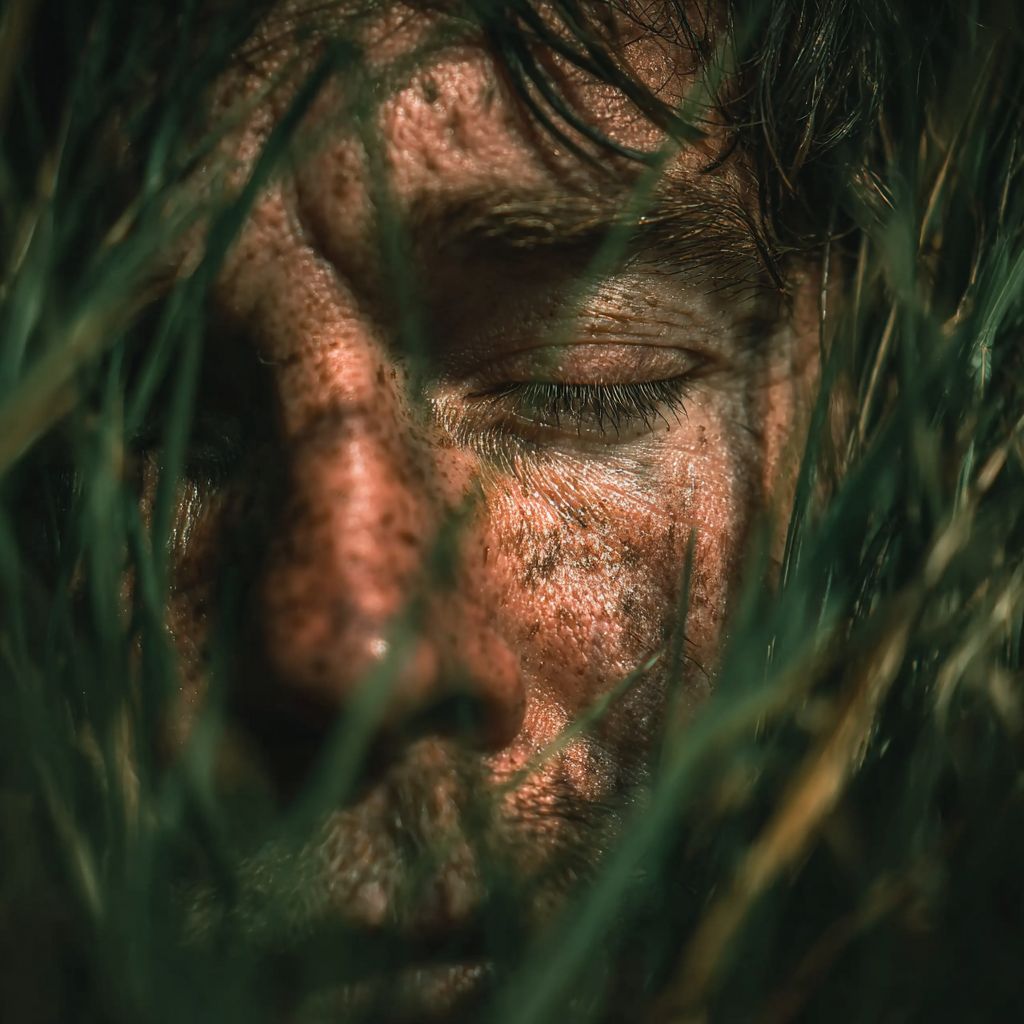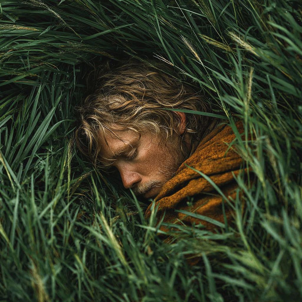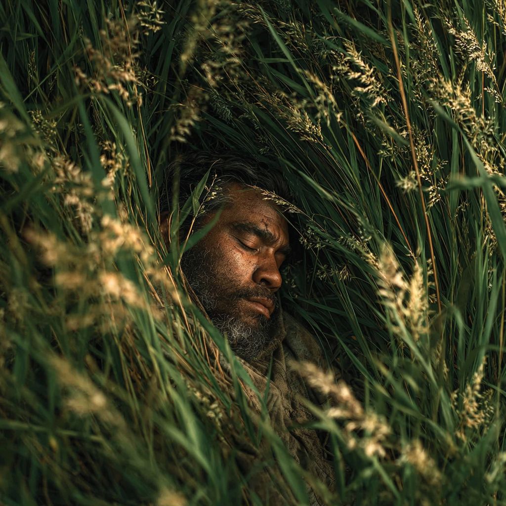 남자가 높은 녹색 풀밭에 엎드려 있으며, 그의 얼굴은 보이지 않는다