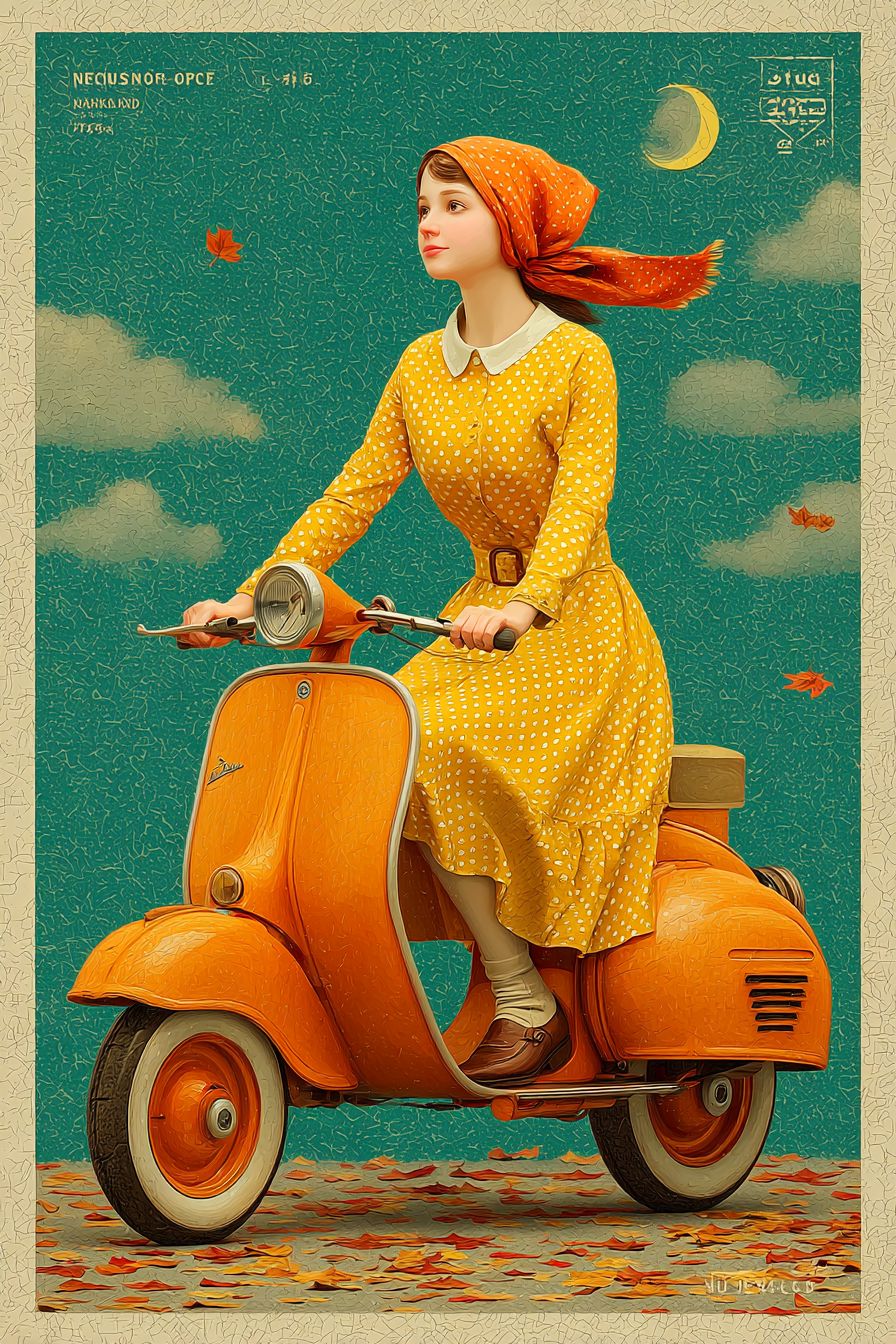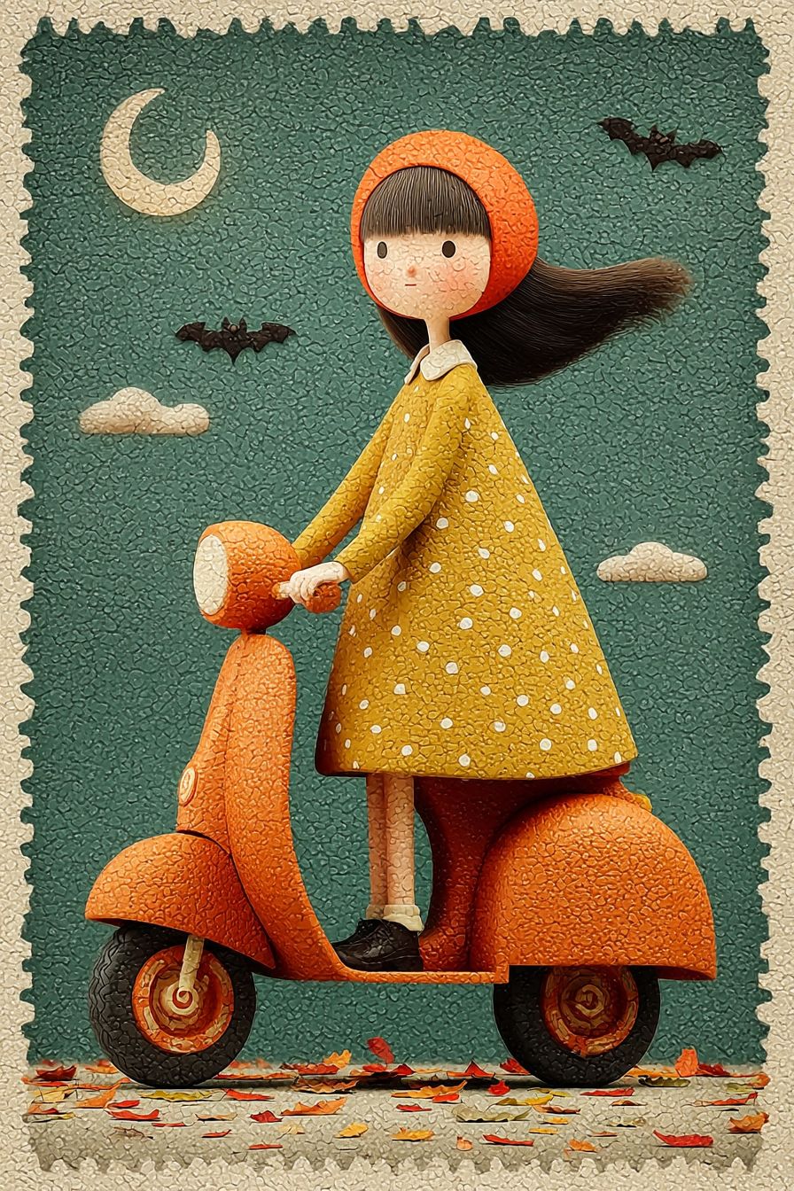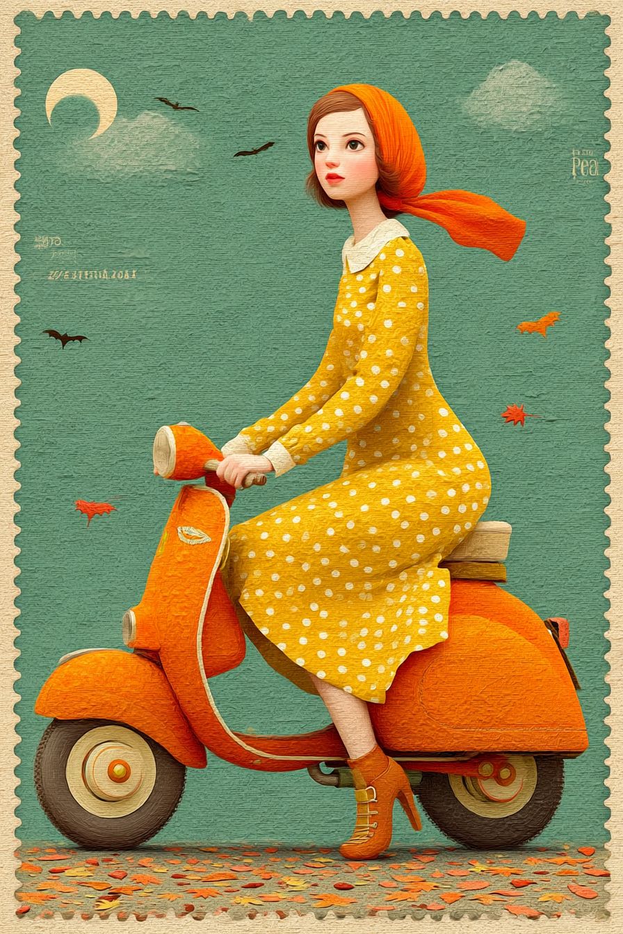 복고풍의 만화 스타일의 일러스트로, 적당한 레트로 소녀가 호박 모양의 스쿠터를 타고 있는 중심에 있는 빈티지 할로윈 우표 스타일의 일러스트입니다. 1960년대 스타일의 긴 소매 A라인 드레스를 연한 겨자색과 흰색 물방울 무늬로 입고 있으며, 무릎 길이로 끝나는 헴, 퍼프 소매, 피터팬 칼라가 돋보입니다. 그녀는 머리 뒤편에서 깔끔하게 묶인 버건디 색의 짧은 스카프를 쓰고 있으며 바람에 살짝 흔들리고 있습니다. 신발은 초콜릿 브라운의 둥근 발가락 메리 제인입니다. 스쿠터의 본체는 부드러운 곡선과 오래된 황동 장식이 있는 차분한 오렌지색으로 조각되어 있습니다. 시트 뒤쪽에는 호박 하나가 있습니다. 바퀴는 크림색과 녹슨색의 사탕 소용돌이 모양입니다. 그녀는 낙엽이 덮인 길을 타고 가고 있으며, 여기저기 흩어져 있는 단풍은 차분한 빨강, 올리브, 베이지색입니다. 배경은 부드럽게 Fade된 청록색 하늘에 빈티지 스타일의 구름 몇 점, 검은색 박쥐가 날아다니고 있고 왼쪽 상단에 희미한 초승달이 있습니다. 일러스트는 빈티지 우표 텍스처를 모방하기 위해 부드러운 곡물과 미세한 인쇄 반점이 텍스처화되어 있으며. 진한 크림색의 가장자리가 있는 점선 테두리가 있어 실제 우표처럼 보입니다. 전체 장면은 따뜻한 복고 팜플렛 색조를 사용합니다: 호박 오렌지, 바랜 올리브 그린, 타르타르, 크림색, 먼지 결이 있는 청록색과 겨자 노란색으로 그려져 있습니다. 오싹한 마법적인 요소 없이 아늑한 가을과 향수를 불러일으키는 할로윈의 분위기만 존재합니다. 전면 구성, 그림자 없음, 깨끗한 배경, 광택 있는 어두운 갈색 눈, 10개의 손가락이 완전히 보이고, 부드러운 수채화 텍스처, 미세한 연필 스케치 윤곽, 빈티지 어린이 도서 일러스트 스타일, 부드러운 조명, 흰색 배경에 고립되어 있으며, 평면 3D 카와이 만화 스타일입니다.