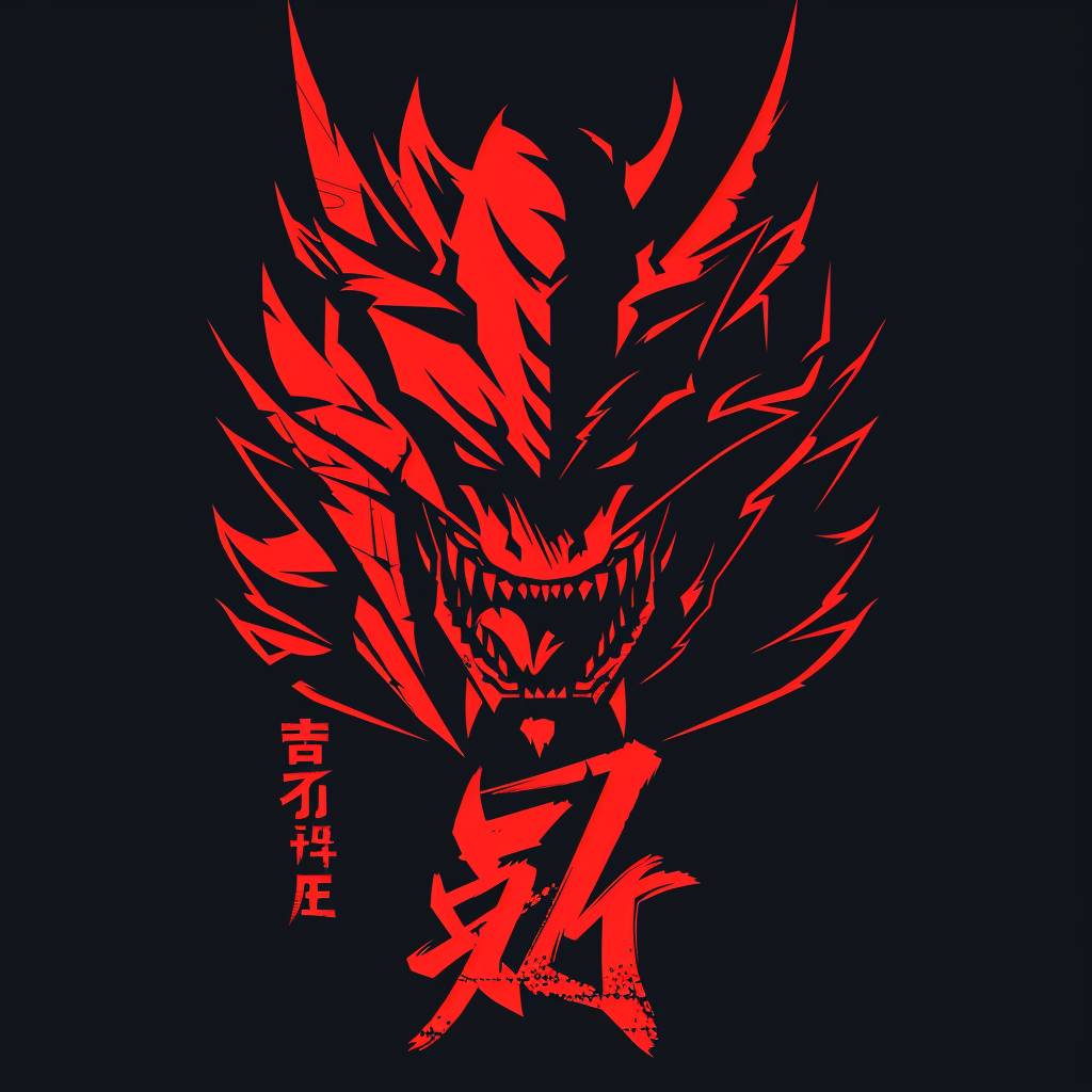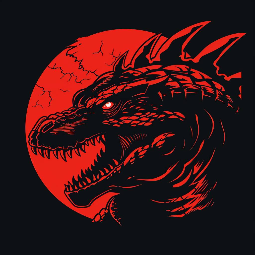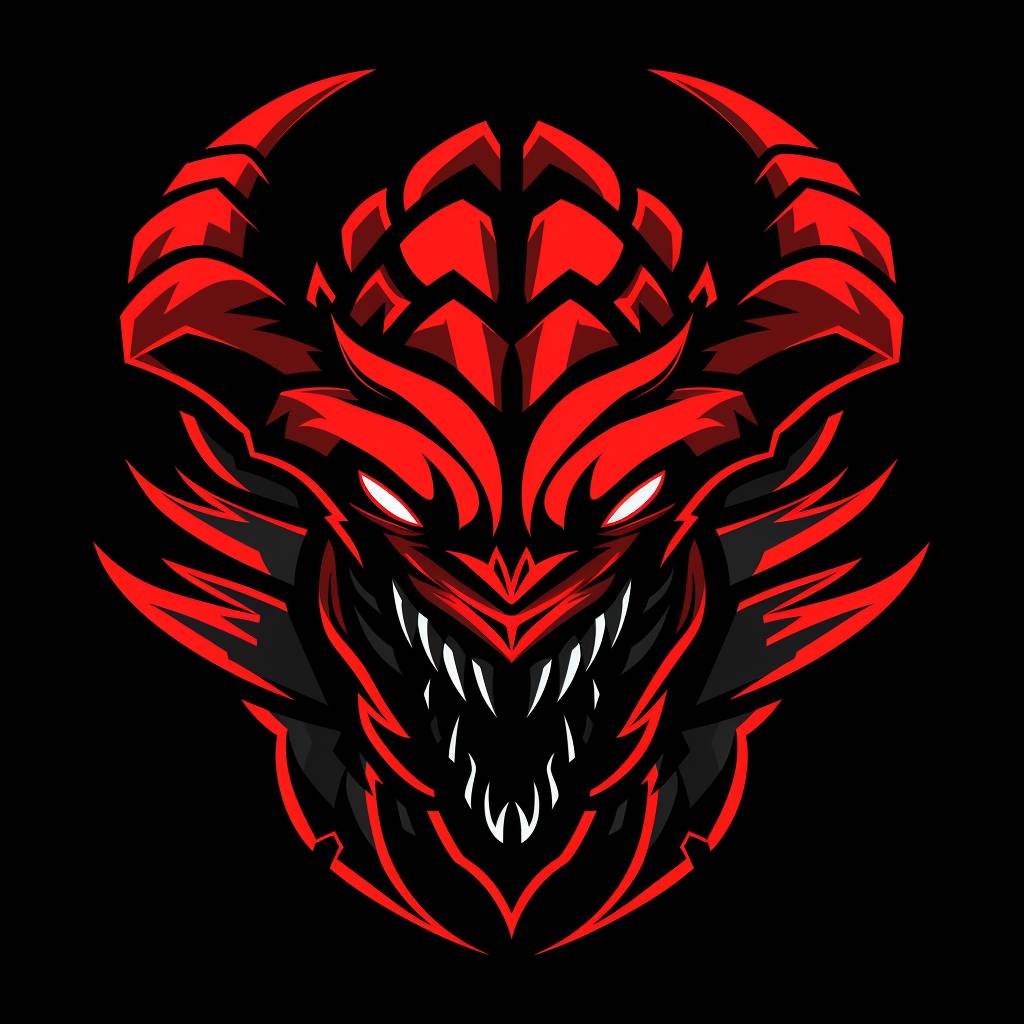 빨간색과 검은색의 평면 로고로, 정면에서 바라본 괴수 머리, 평면 음영 및 공격적인 디자인, 음수 공간 활용.