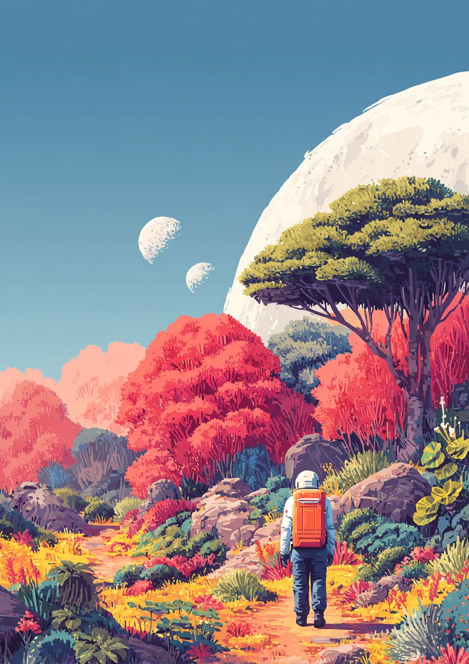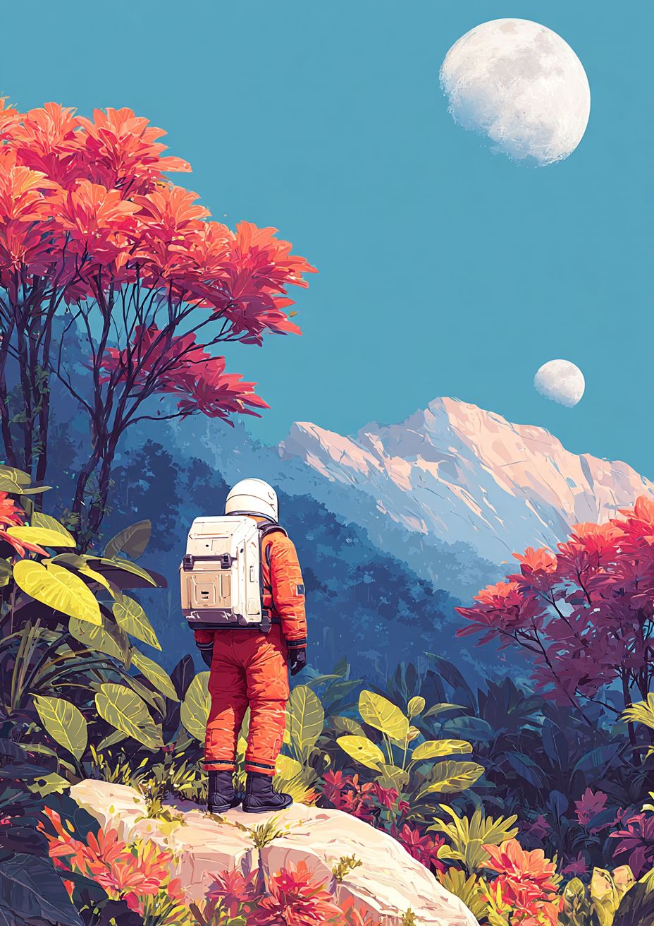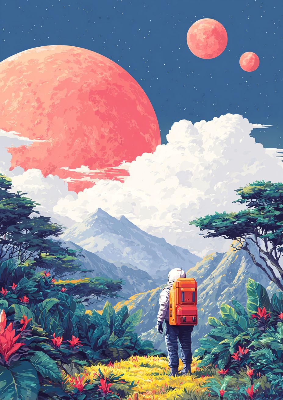 레트로퓨처리즘 우주비행사가 외계 정글을 탐험하며, 생물 발광 식물이 빛나고 하늘에는 두 개의 달이 있으며, 1960년대 공상과학 미학, 생생한 청록색과 주황색 팔레트, 영화 같은 구성, 하이퍼 디테일.