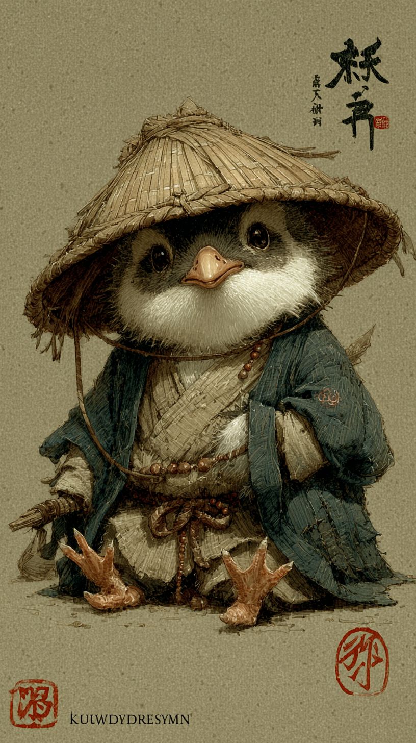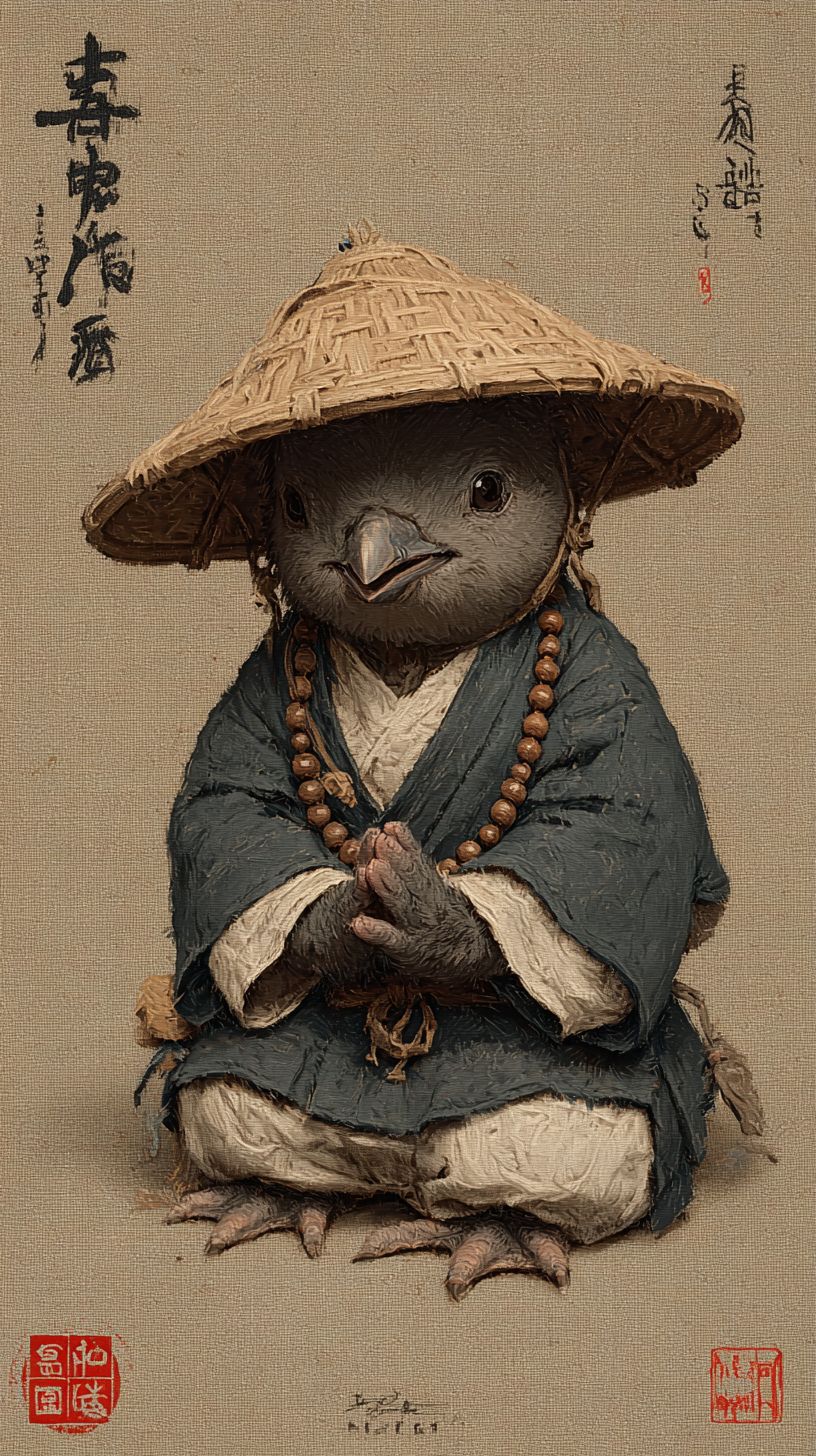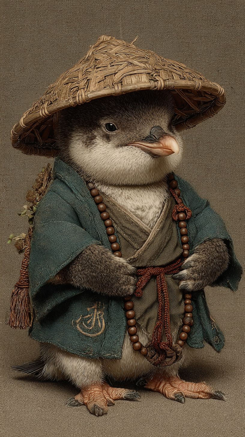 작은 펭귄이 스님 옷을 입고 다리를 꼬고 앉아 있으며, 대나무 모자를 쓰고 두 손을 모으고 있다