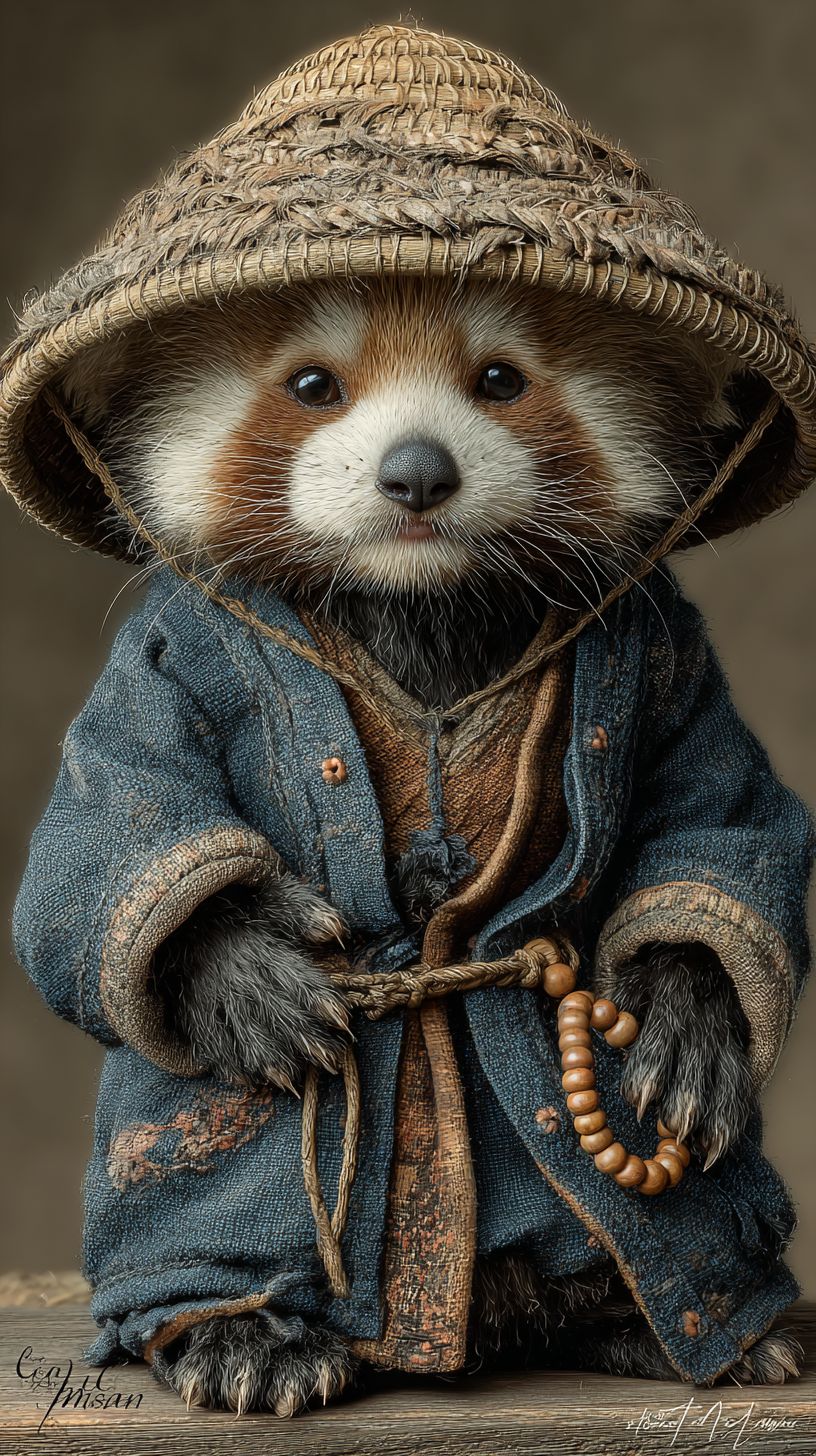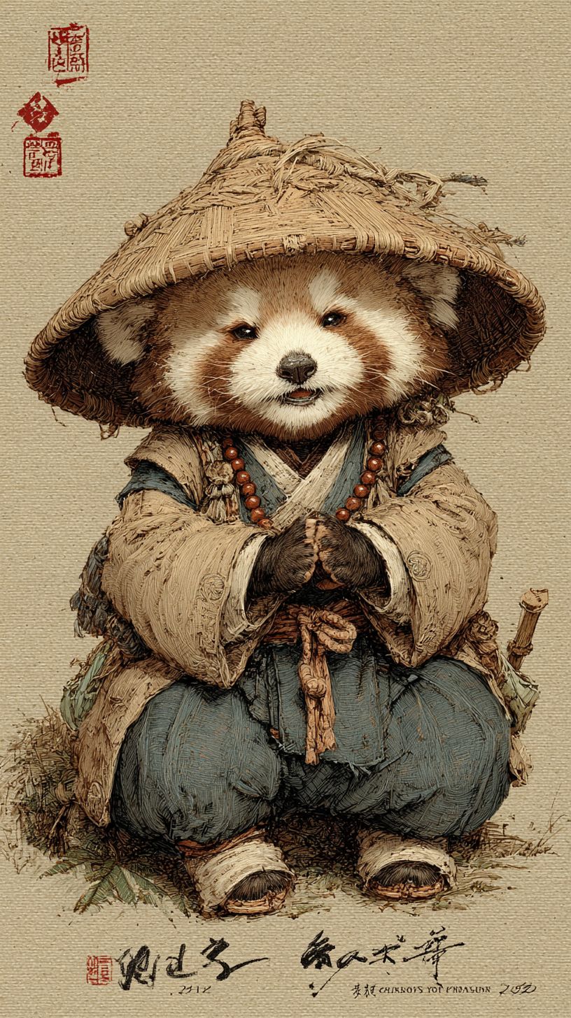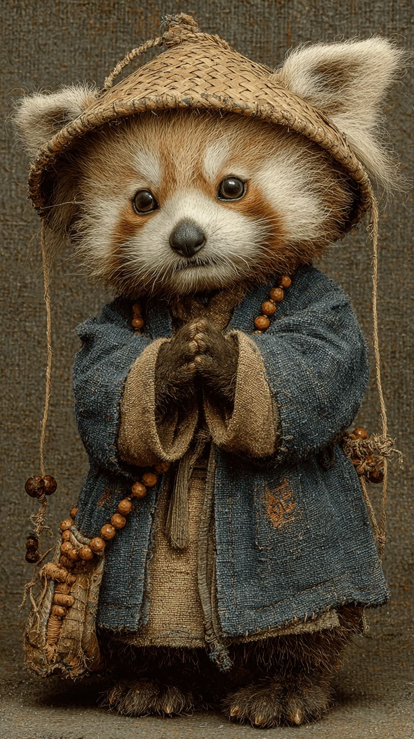 세밀한 붓질, 귀여운 레서판다, 정면 모습, 대나무 모자를 쓰고, 전신 클로즈업, 다리를 꼬고 앉아, 스님의 옷을 입고, 불교 구슬을 착용하고, 손을 모은, 귀여운, 고대 중국 스타일.