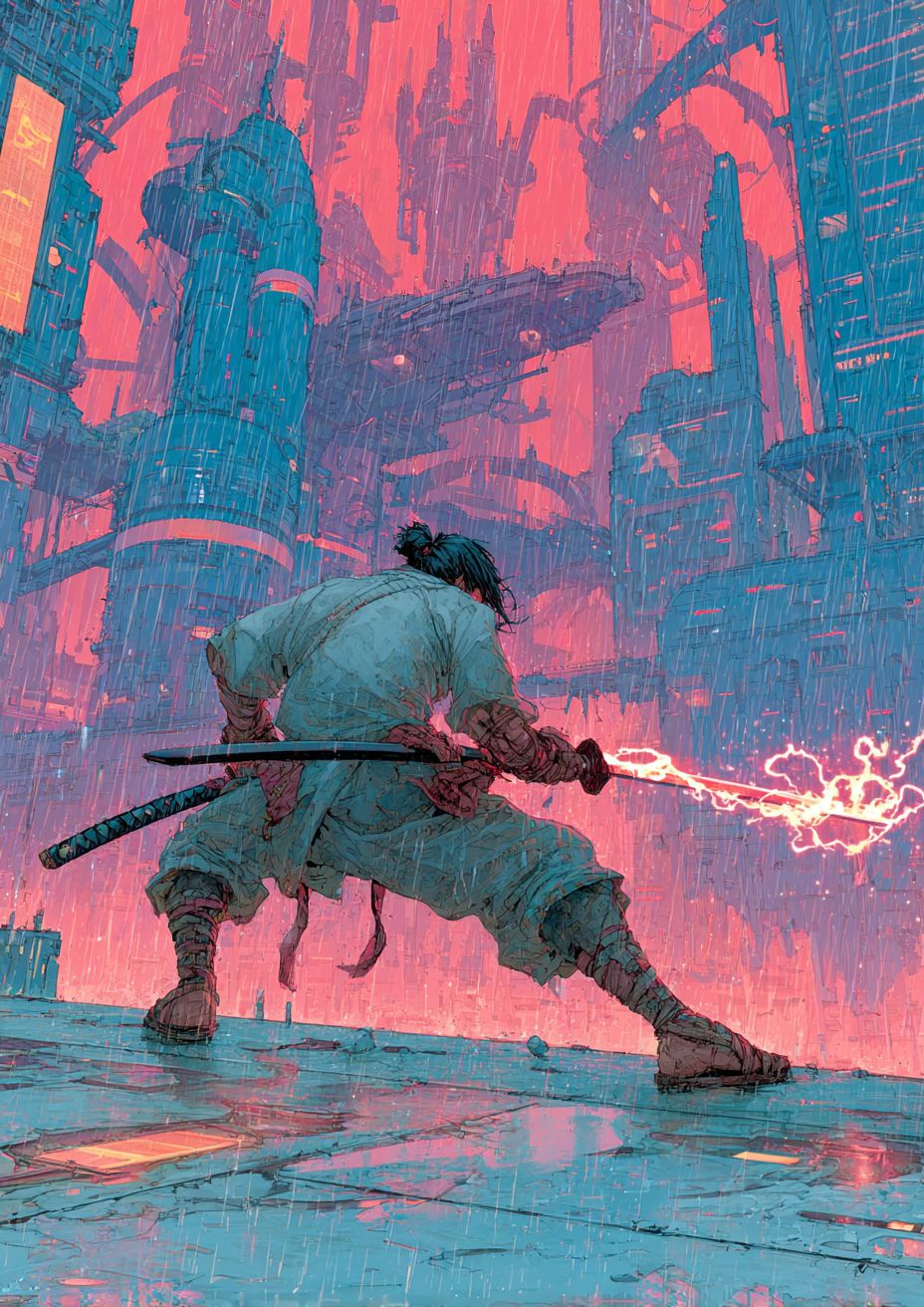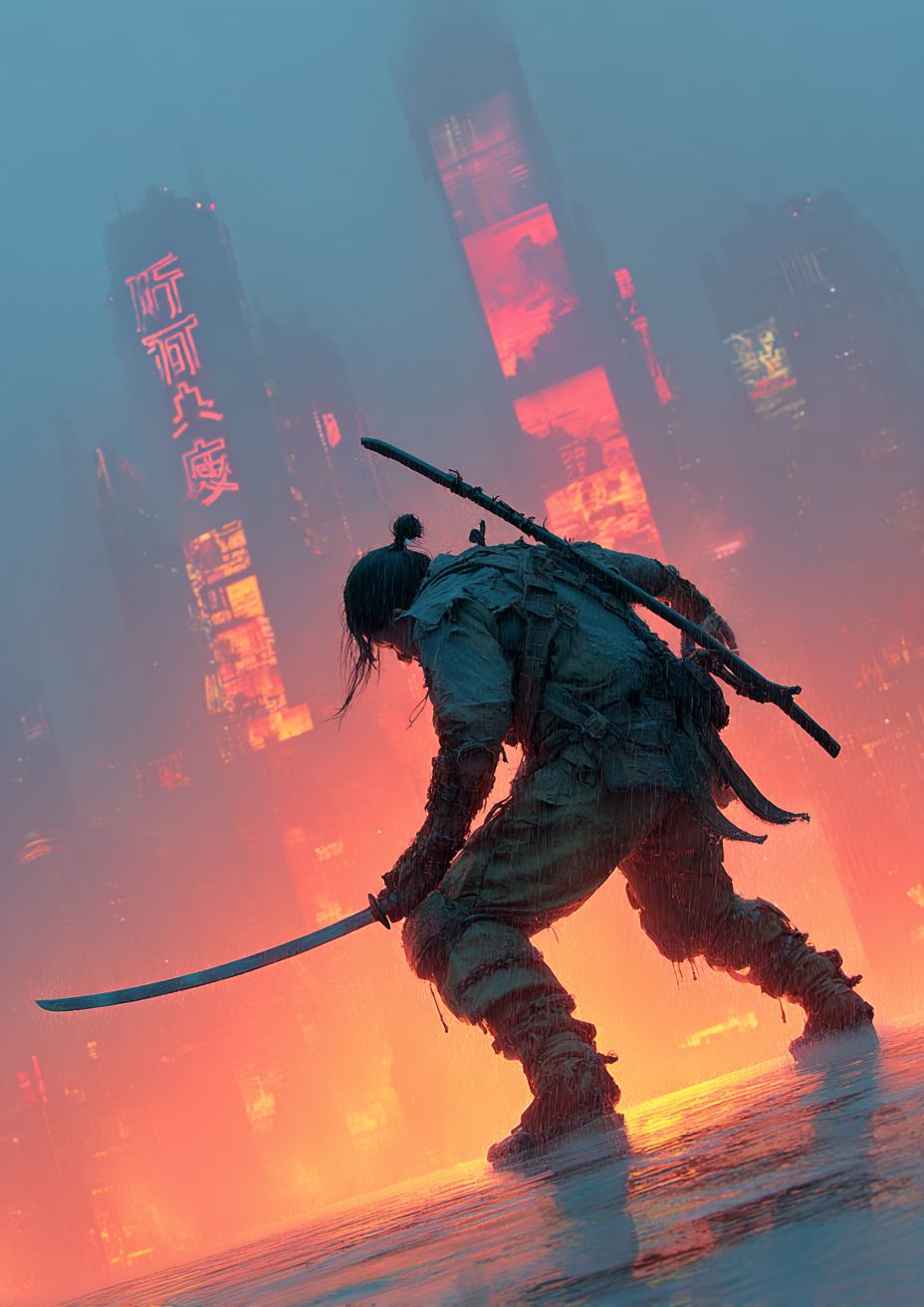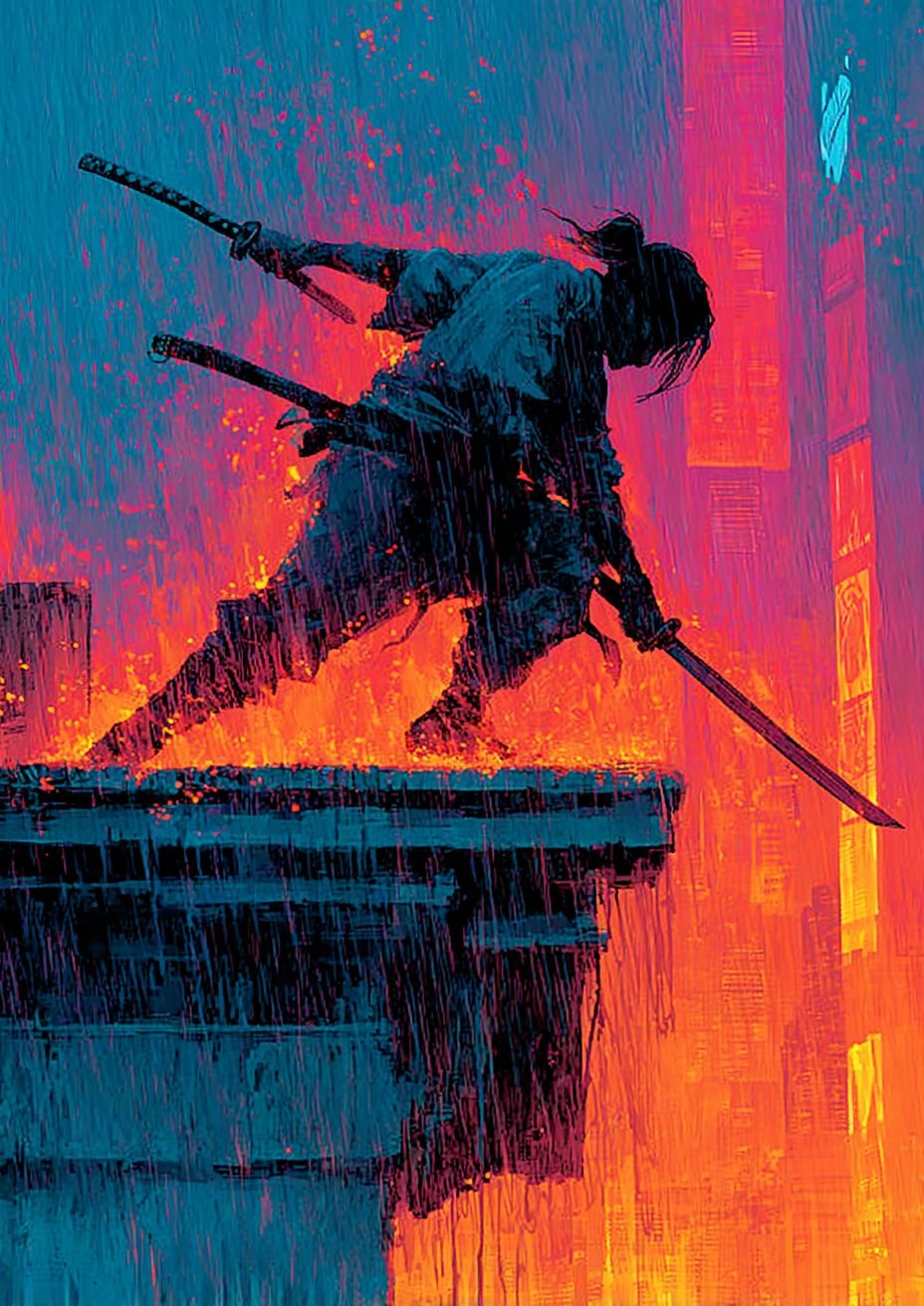 A futuristic samurai dueling on a neon-lit rooftop, katana sparking with electric energy, rain-soaked cityscape with towering holograms, dynamic action scene, cyberpunk aesthetic, hyper-detailed, vibrant blues and pinks --ar 5:7 --v 7.0 --s 750