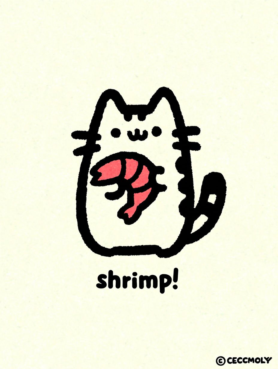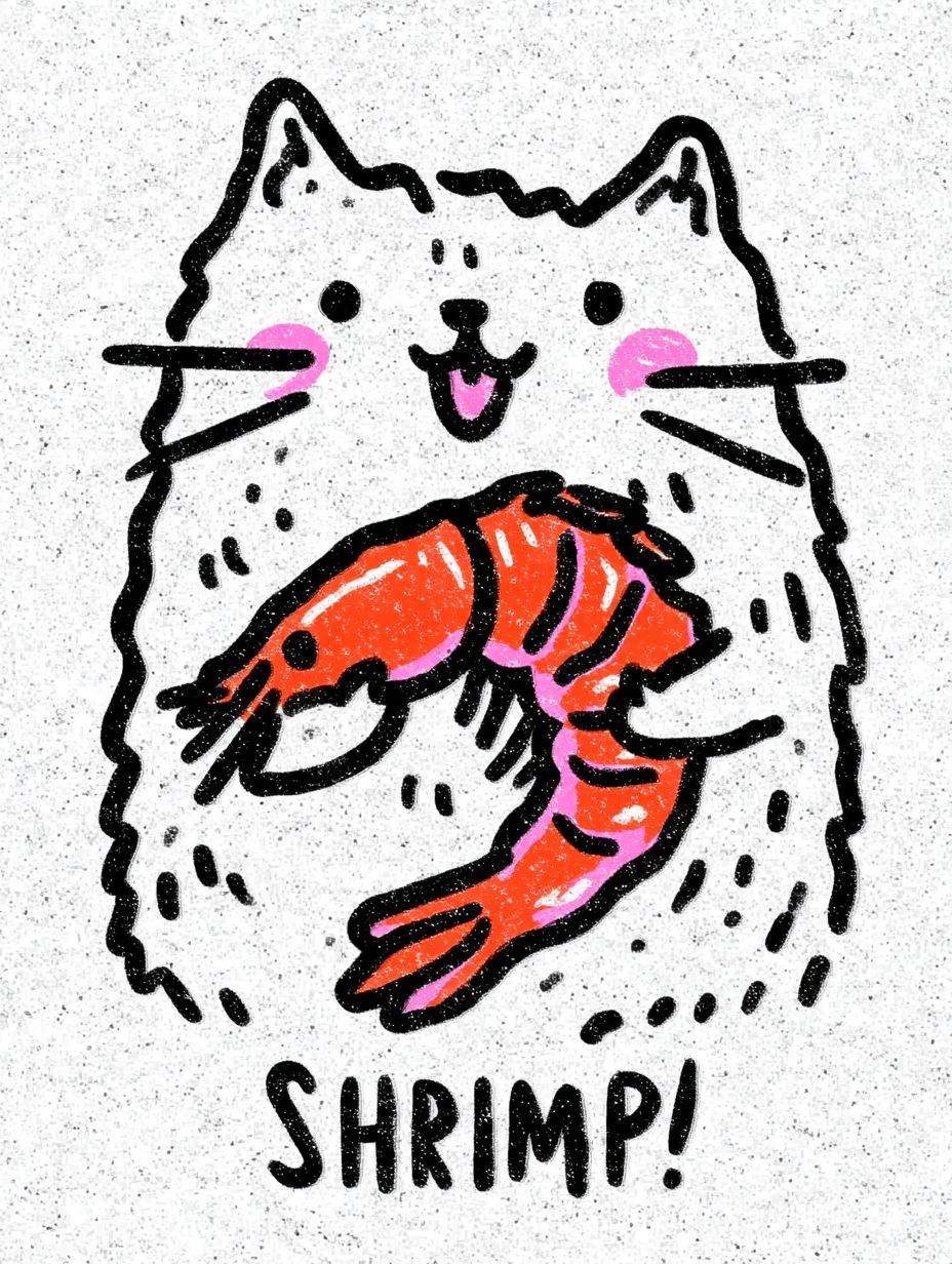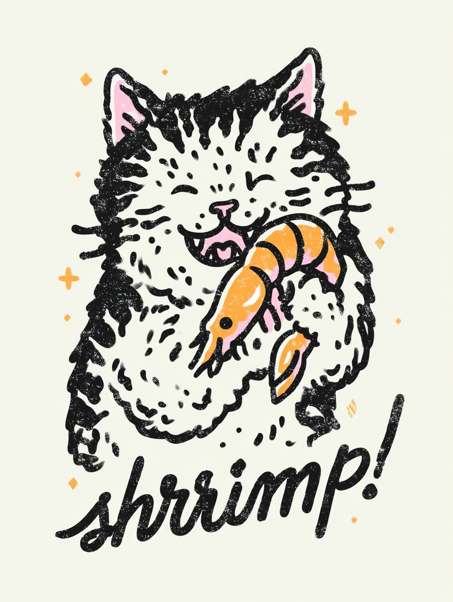 두껍고 스케치 같은 검은 선으로 그려진, 단순하고 장난기 넘치는 삐뚤빼뚤한 캐릭터 스타일의 고양이가 밝은 오렌지색의 줄무늬 새우를 행복하게 들고 갉아먹고 있는 일러스트; 고양이의 표정은 기쁨으로 가득 차 있으며 작은 만족스러운 미소와 점 같은 눈을 가지고 있다. 그 아래에는 '새우!'라는 단어가 캐주얼하고 아동적인 글꼴로 손으로 쓰여져 있으며, 따뜻한 손으로 그린 느낌을 주는 가벼운 질감이 있는 흰색 배경으로 설정되어 있다.