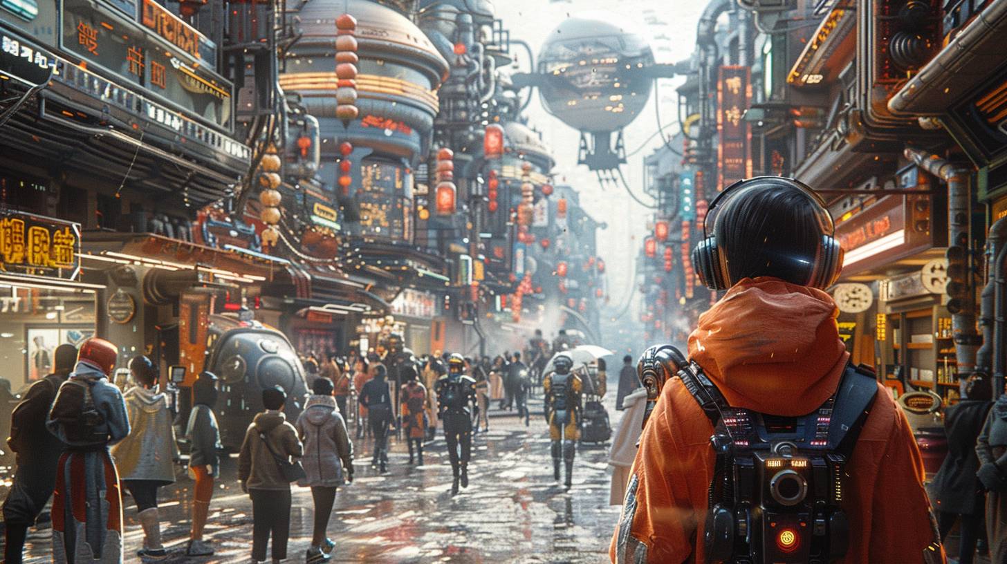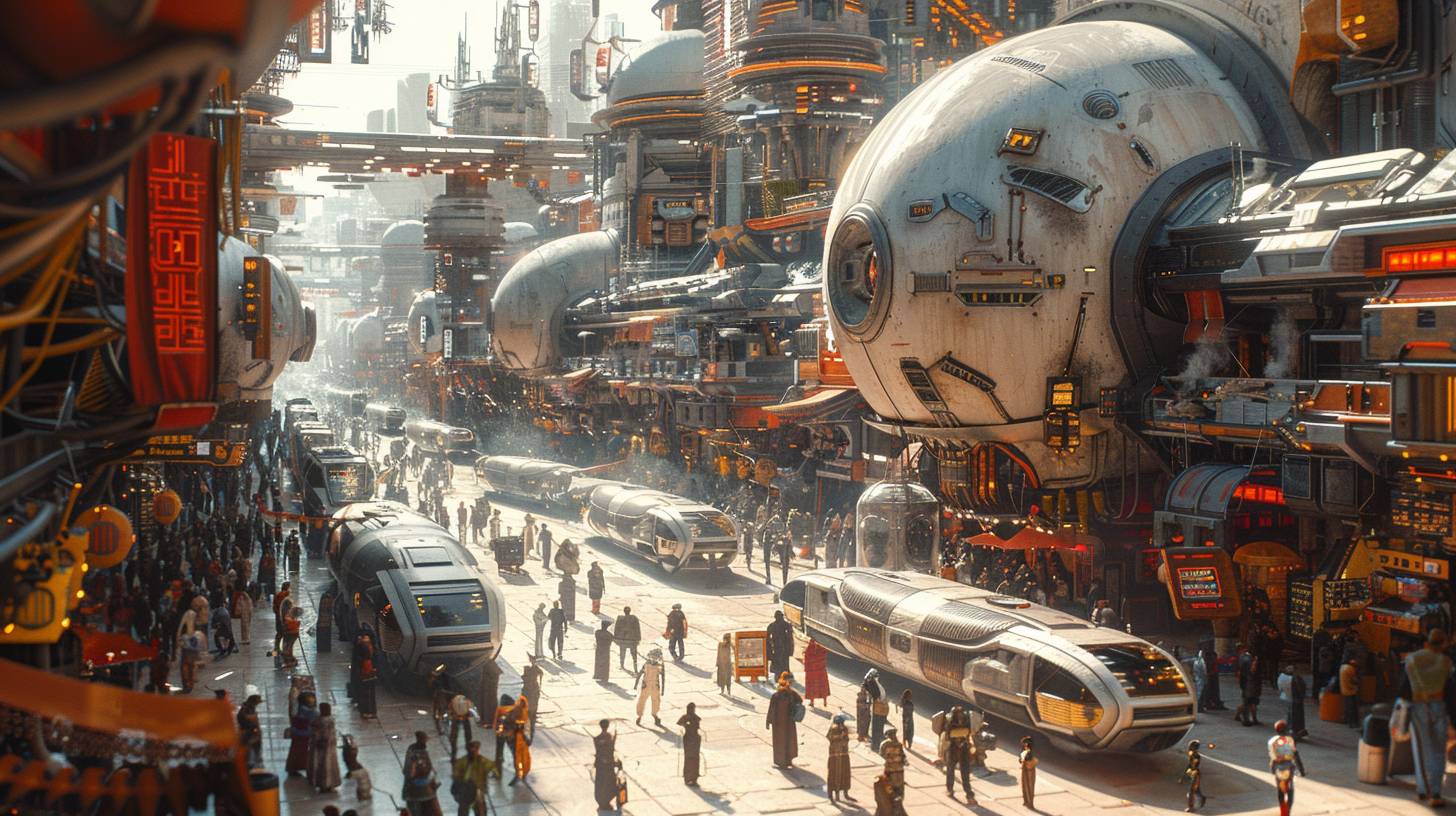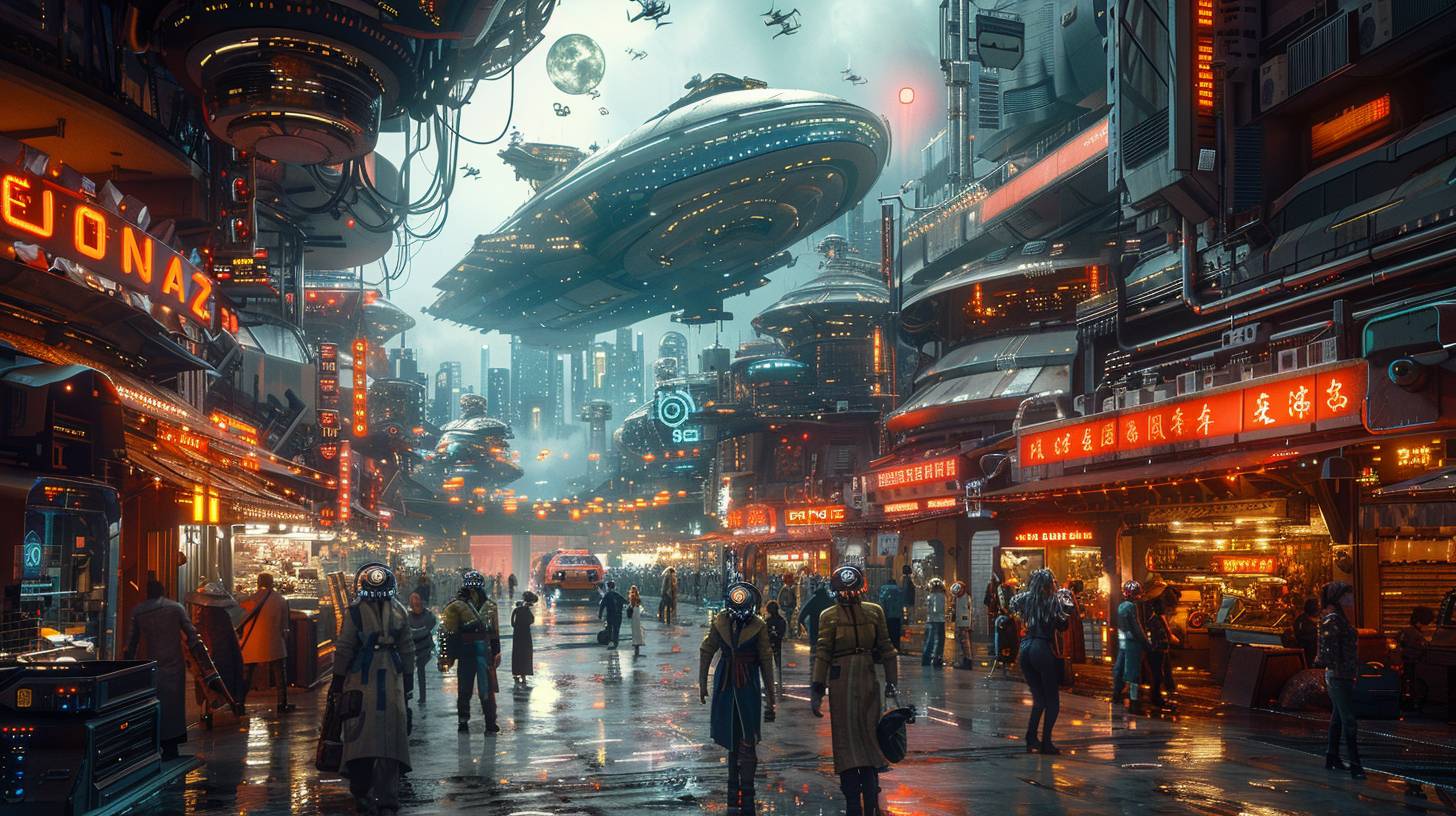 인간과 사이보그가 공존하는 미래 사회를 묘사한 번화한 도시 풍경입니다. H.R. 기거와 시드 미드의 작품에서 영감을 받아 현대적인 건물이 줄지어 있는 거리에서 유려한 미래적 건축과 생체 기계적 향상이 특징입니다. 사이버네틱 팔다리와 임플란트를 가진 사람들이 첨단 로봇 및 홀로그램 인터페이스와 상호작용하여 유기적 생명과 첨단 기술이 매끄럽게 융합됩니다. 네온 불빛, 날아다니는 차량, 분주한 활동으로 가득 찬 활기찬 도시 경관은 사이버네틱 미래 사회의 조화롭고 복잡한 비전을 구현합니다.