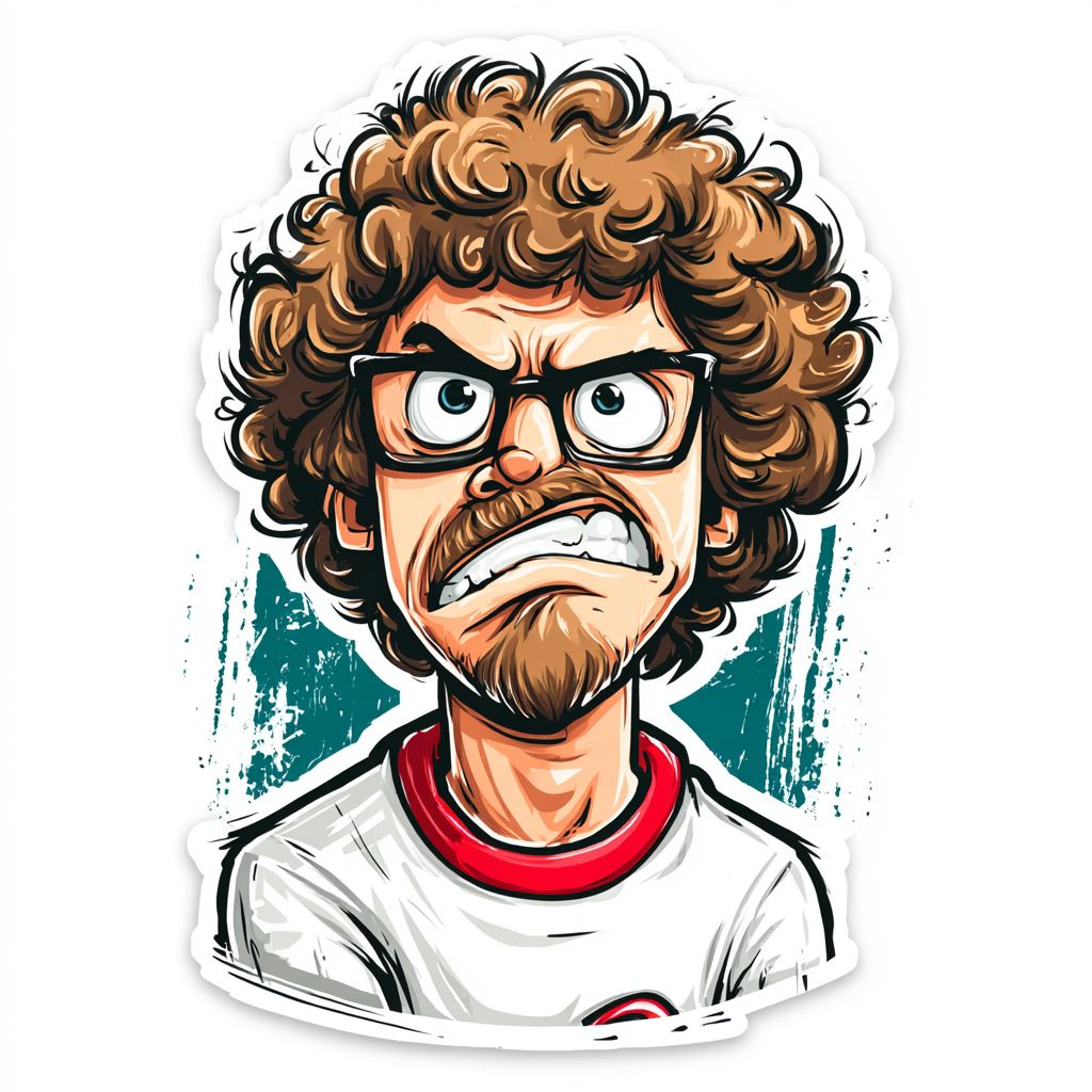 냅oleon 다이너마이트의 만화 일러스트. 그는 혐오감으로 눈을 돌리고, 빨간색 칼라가 있는 흰색 링 스타일의 티셔츠를 입고 있으며, 고립된 배경에 스티커 스타일의 윤곽선이 있습니다.