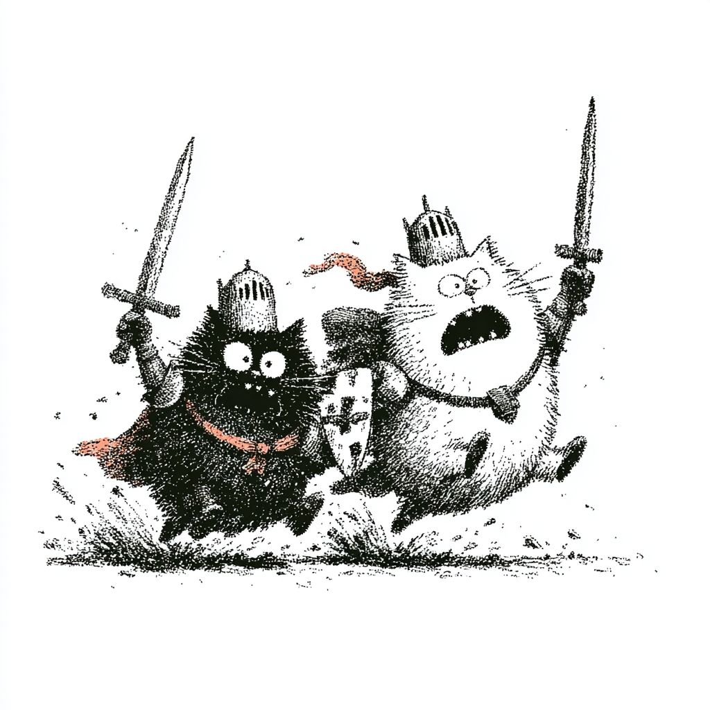 큰 푹신한 고양이를 타고 창 시합을 하는 두 기사, 간단한 선 아트, 최소한의 디테일, 깨끗한 검은 윤곽선, 손으로 그린 듯한 모습, 평면 2D, 흰색 배경, 중세 판타지 유머, 티셔츠 디자인