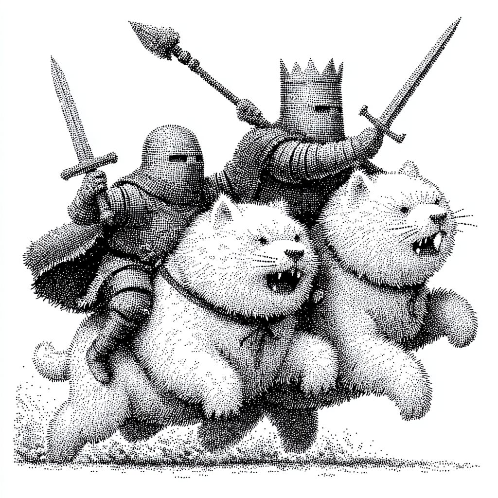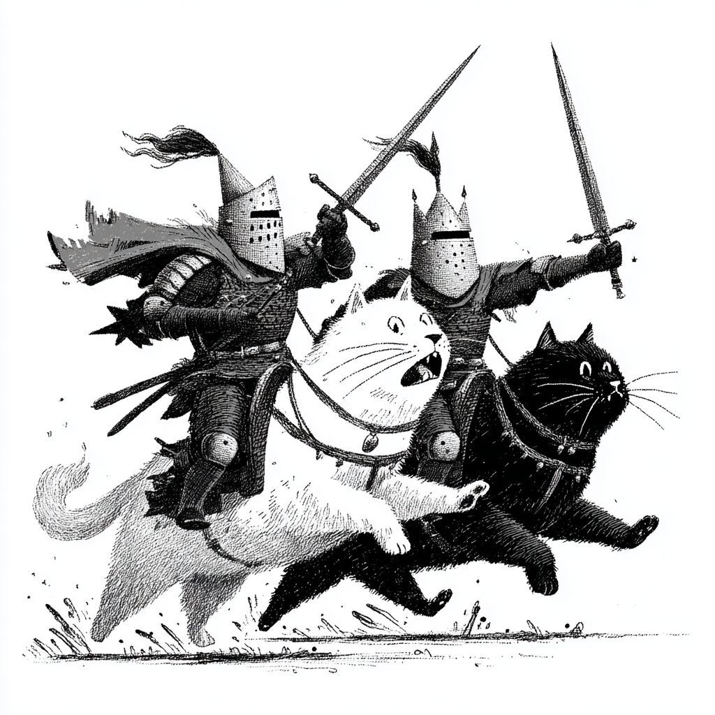 두 기사가 큰 고양이에 올라타 싸우는 중세 판타지 유머