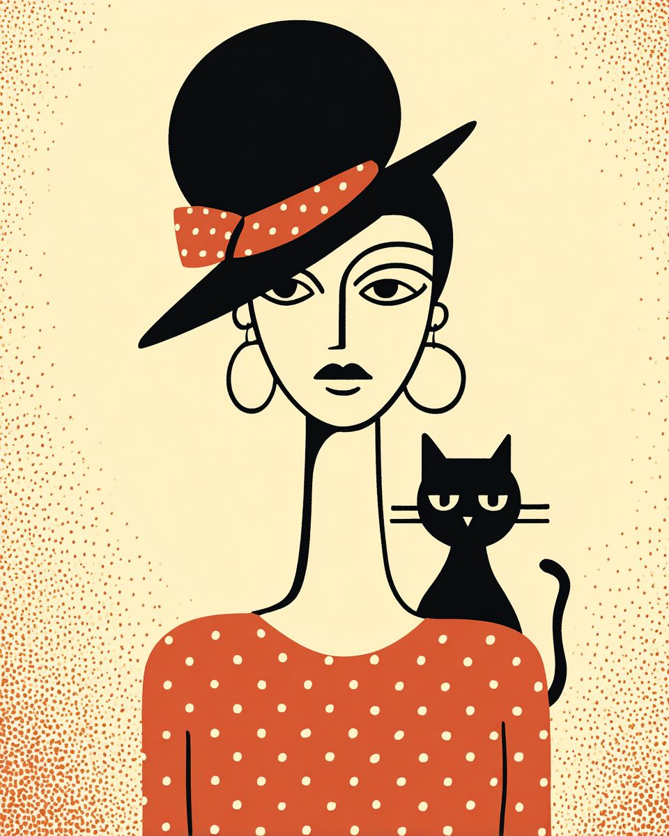 앙리 마티스의 컷아웃 스타일, 대담한 평면 색상, 그래픽 구성, 최소한의 선 작업으로 구성된 여성과 애완동물의 초상화, 마티스 스타일로.