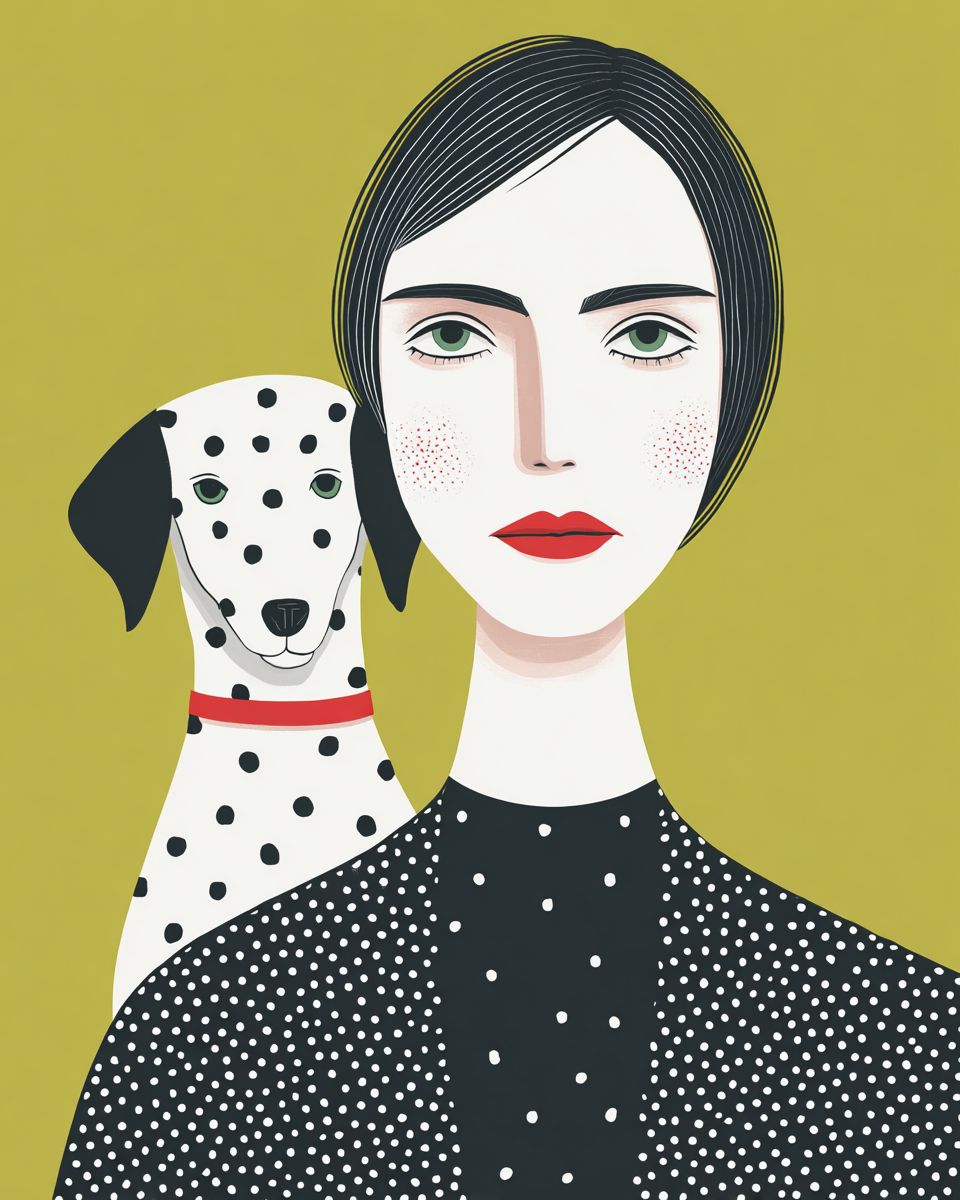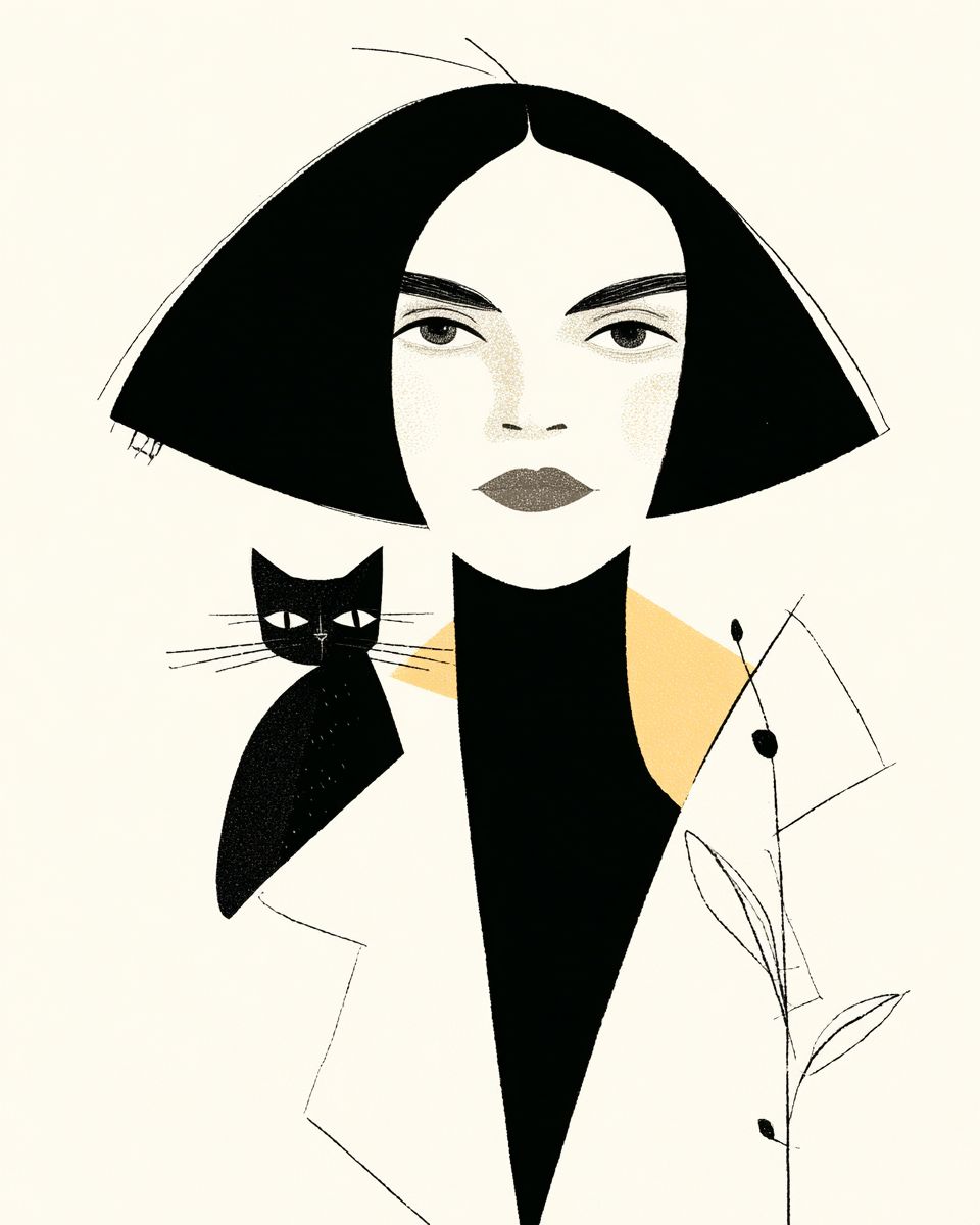Henri Matisse cut-out style, bold flat colors, graphic composition, minimalistic linework, of a portrait of a woman with a pet, in the style of Matisse. --ar 4:5 --raw --profile au2dtl7 --stylize 250
