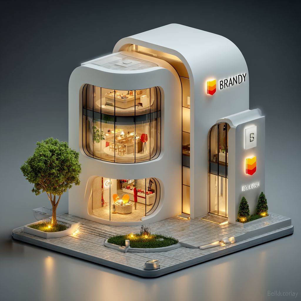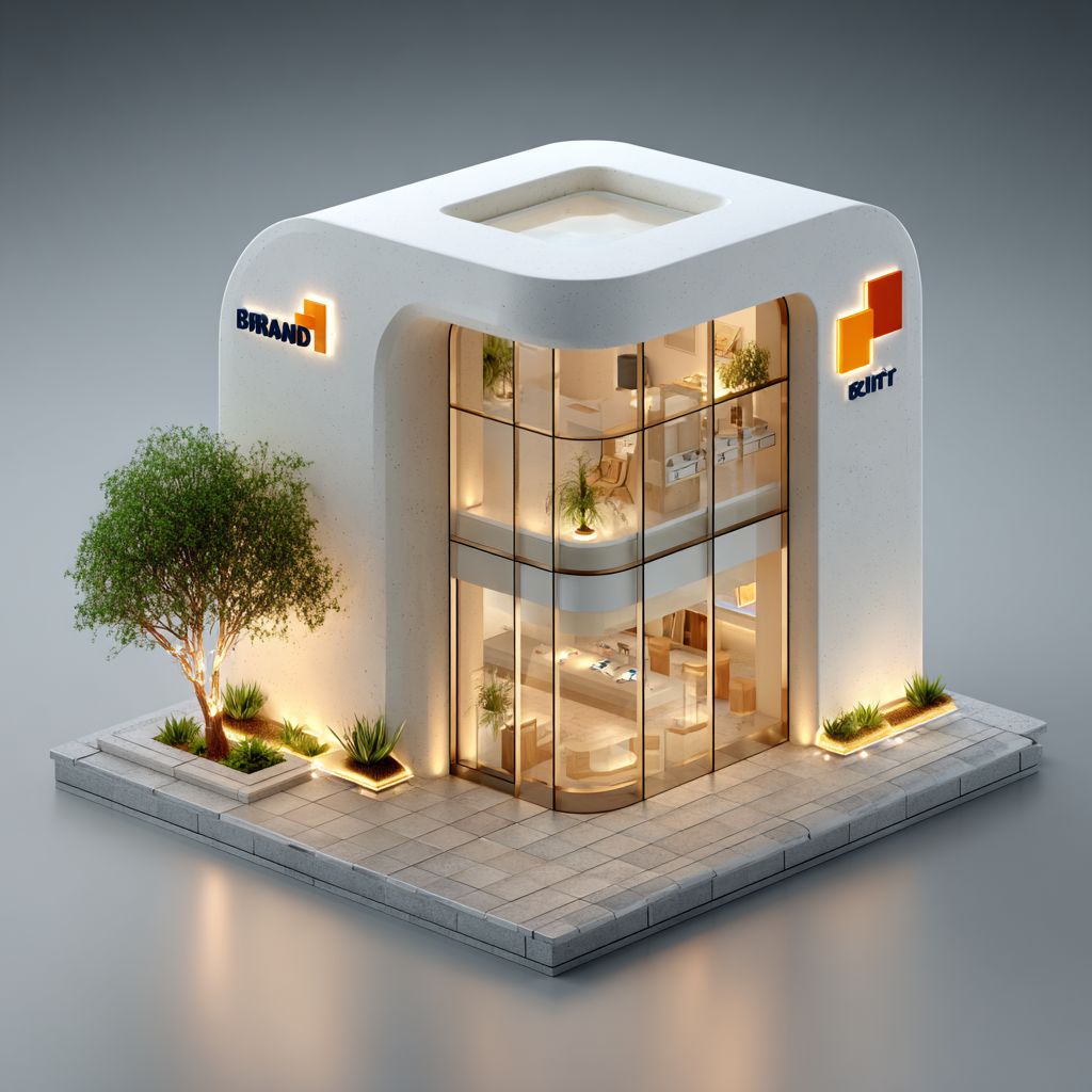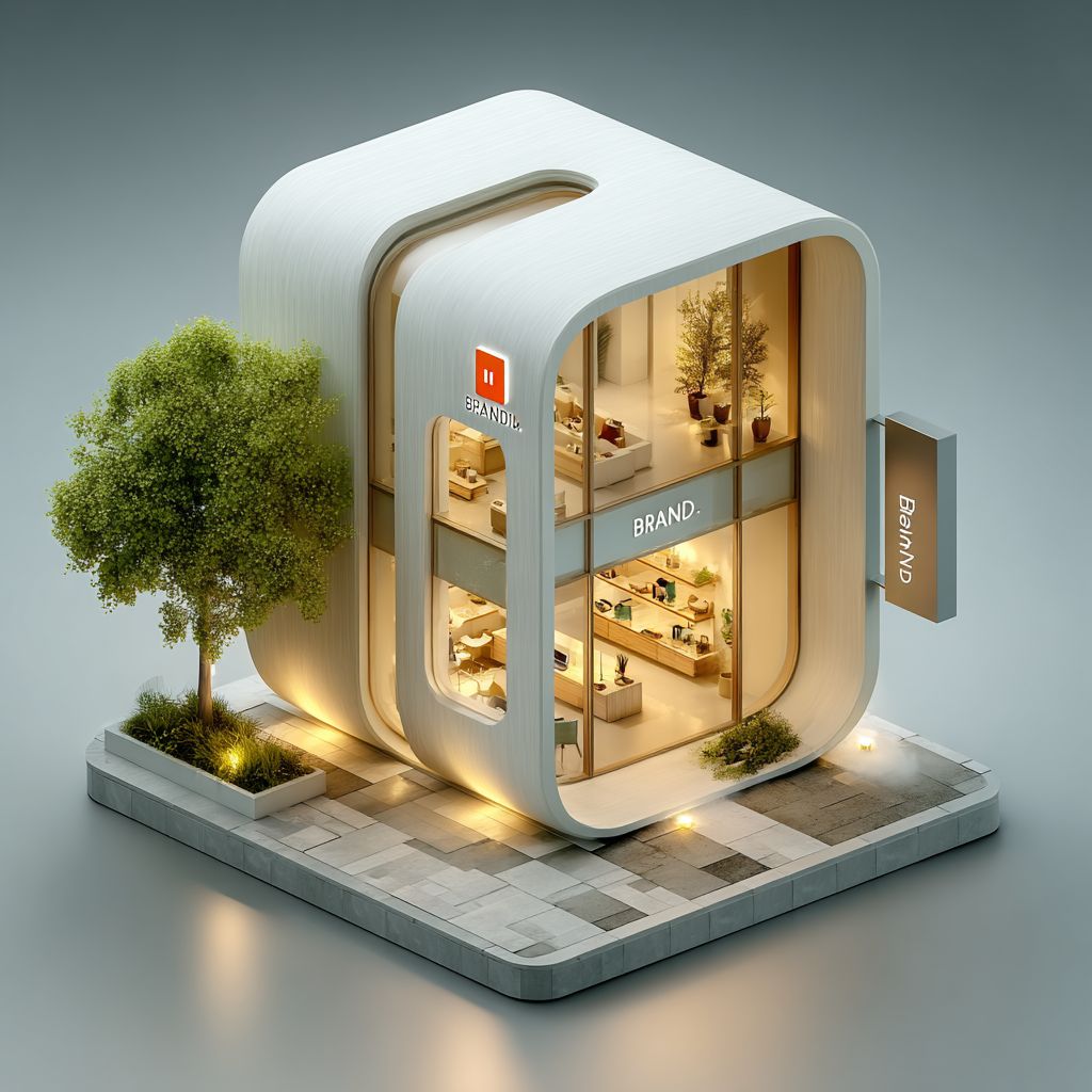 현대 상점의 3D 등각 일러스트레이션을 만드세요. [BRAND]를 위해 브랜드에서 영감을 받은 강조 색상을 가진 둥글고 캡슐 모양의 흰색 건물을 특징으로 합니다. 구조는 부드럽고 알약 모양 디자인이며, 큰 곡면 유리 창이 있습니다. [BRAND] 로고와 이름을 브랜드 서명 스타일로 보여주는 수직 간판 패널을 추가하세요. 모든 요소를 기하학적 타일 플랫폼에 배치하고, 미세한 그림자, 하나의 녹색 나무, 최소한의 야외 요소를 추가하세요. 따뜻한 환경 조명과 그라데이션 배경을 사용합니다. 크기는 1080x1080입니다.