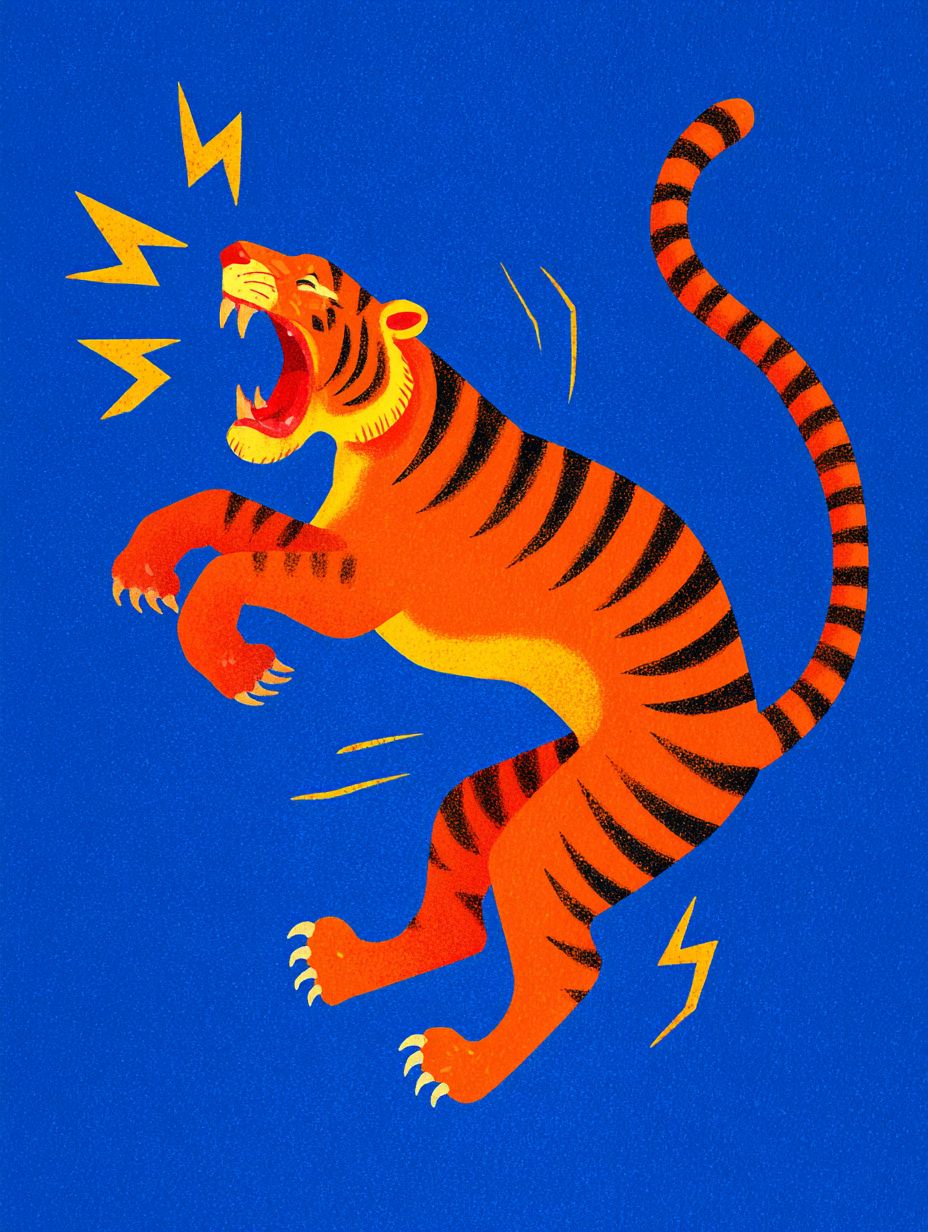 A vibrant, stylized illustration of a tiger leaping dynamically against a solid royal blue background; the tiger is depicted with bold orange fur and thick black stripes; its body is curved, with its front paws outstretched and claws extended, and its hind legs bent as if pushing off; its tail is long and curled upwards, also striped; the tiger's mouth is wide open, showing sharp teeth and a pink tongue, with three jagged yellow lines emanating outwards, suggesting a roar or energy; the style is flat and graphic, with bold outlines and solid colors, reminiscent of contemporary illustration or poster design; there are subtle curved yellow lines near the paws, possibly indicating movement or energy; the composition is energetic and dynamic, capturing the tiger in a moment of powerful action; flat, even lighting with no shadows --ar 3:4 --raw --profile rrri1ux --v 7.0