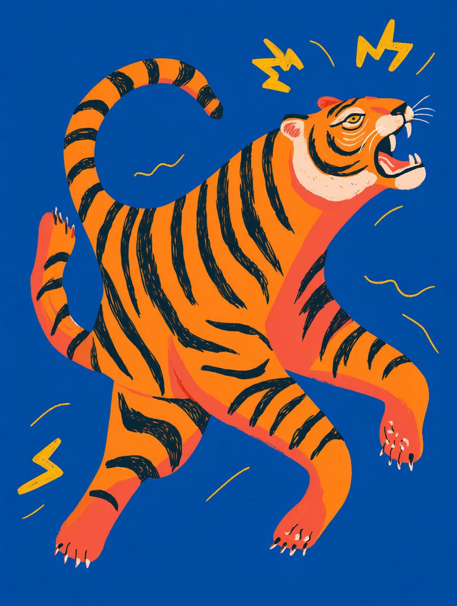 강렬한 로얄 블루 배경 앞에서 역동적으로 도약하는 호Tiger의 생동감 넘치는 스타일화된 일러스트입니다. 호Tiger는 대담한 오렌지색 털과 두꺼운 검은 줄무늬로 묘사됩니다. 몸체는 곡선으로, 앞발은 쭉 뻗고 발톱을 자랑하며, 뒷다리는 밀고 나가는 듯이 구부려져 있습니다. 꼬리는 길고 위로 말려 있으며, 줄무늬가 있습니다. 호Tiger의 입은 크게 벌어져 있으며, 날카로운 이빨과 분홍색 혀를 드러내고 있습니다. 바깥쪽으로 방사되는 세 개의 톱니 모양의 노란선이 있어 포효하거나 에너지를 보여주는 듯합니다. 스타일은 평면적이고 그래픽적이며, 대담한 윤곽선과 단색으로 현대 일러스트나 포스터 디자인을 연상시킵니다. 발가락 근처에는 미세한 곡선의 노란 선이 있어 움직임이나 에너지를 나타낼 수 있습니다. 구성은 에너지가 넘치고 역동적이며, 힘찬 행동의 순간을 포착합니다. 평평하고 고른 조명으로 그림자가 없습니다.