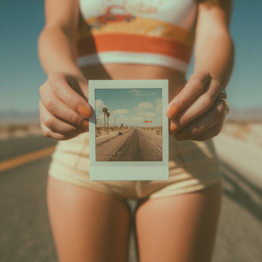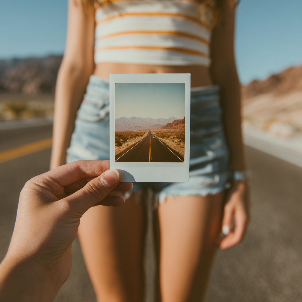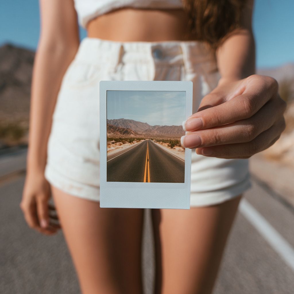 여성이 사막 고속도로에서 폴aroid 사진을 들고 있다