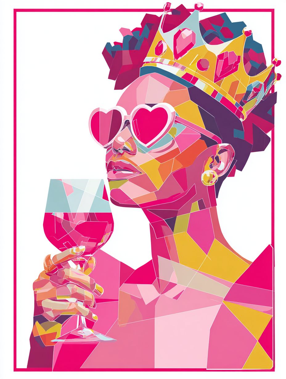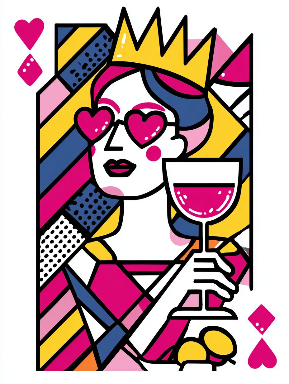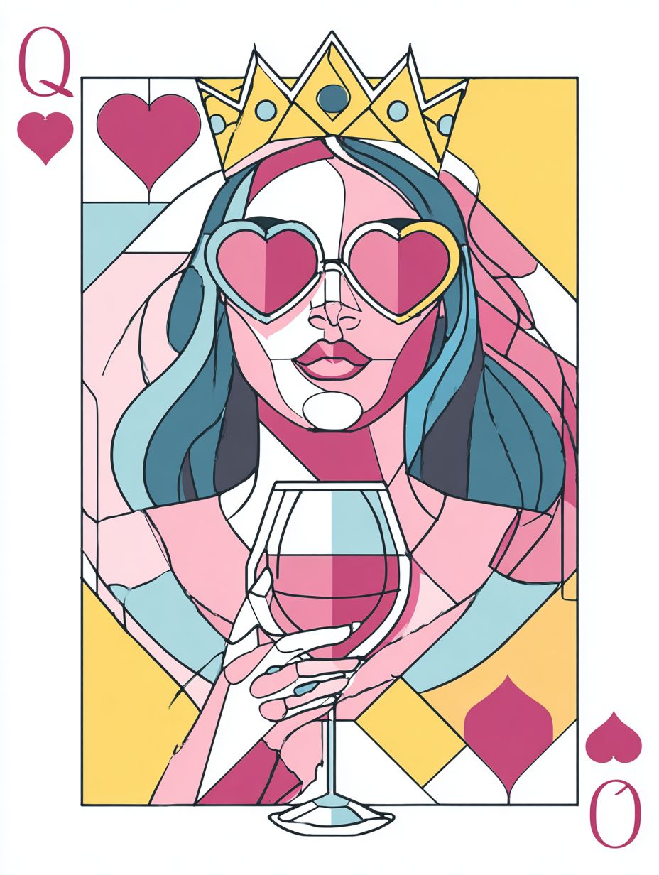 Vector illustration of a queen playing card featuring a beautiful woman wearing a crown and heart-shaped sunglasses, holding a wine glass, with pink hues on a white background. Colorful geometric shapes form the character's outline, creating a simple vector design with flat colors, bold lines, and a vibrant color palette. The high-contrast image has no shadows or gradient shading, and a white border around the edge for easy cutout, with white space on all four sides. This is a vector graphic with a white background and white borders. --ar 3:4 --v 7.0
