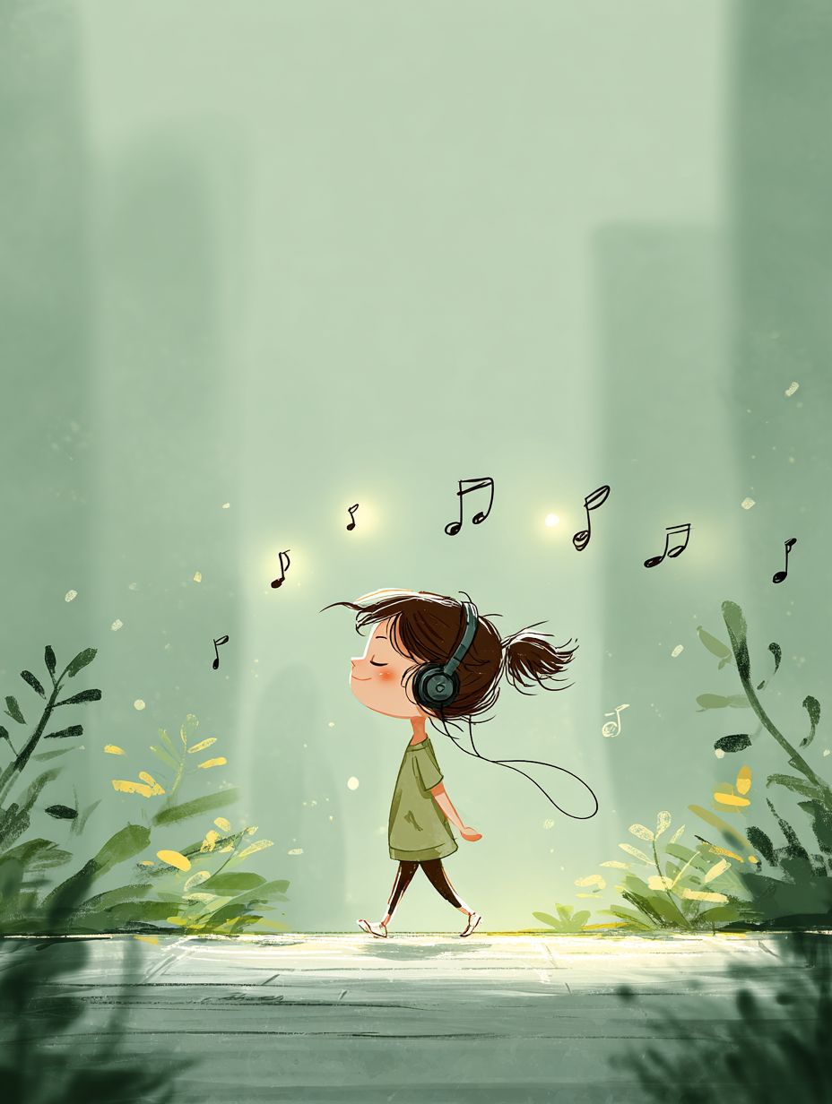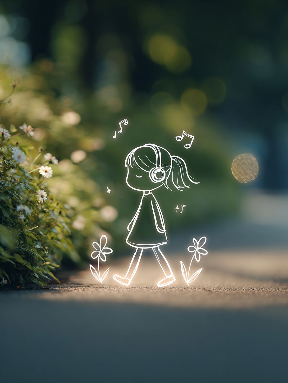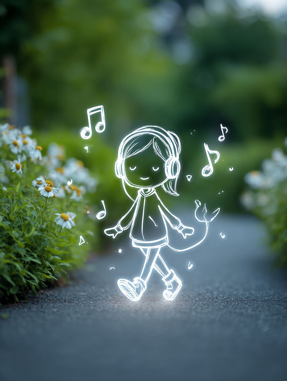 A cute little girl is walking on the road, listening to music with headphones and smiling happily. The background features blurred green plants and flowers. Children's simple drawings, minimalist lines, white lines, thick lines, brighter glowing outlines on the character. Musical notes are floating around her head, adding an artistic touch to the entire scene. Her whole body is depicted using a minimalist style, giving people warm feelings. --ar 3:4 --v 7.0