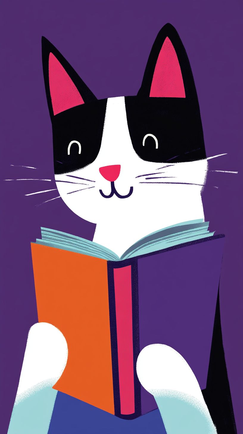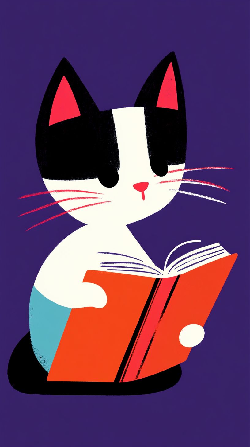 귀여운 새끼 고양이가 책을 읽고 있는 초극단적인 미니멀리즘 그래픽 구성