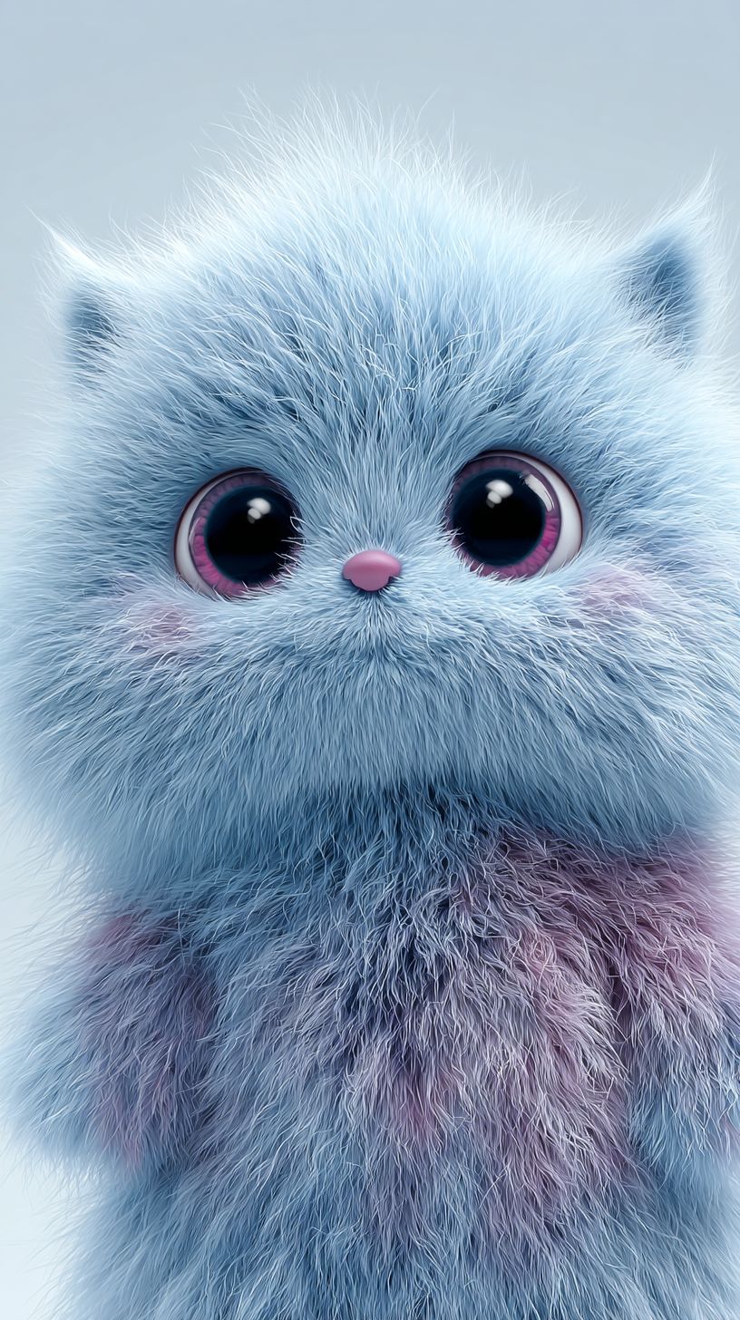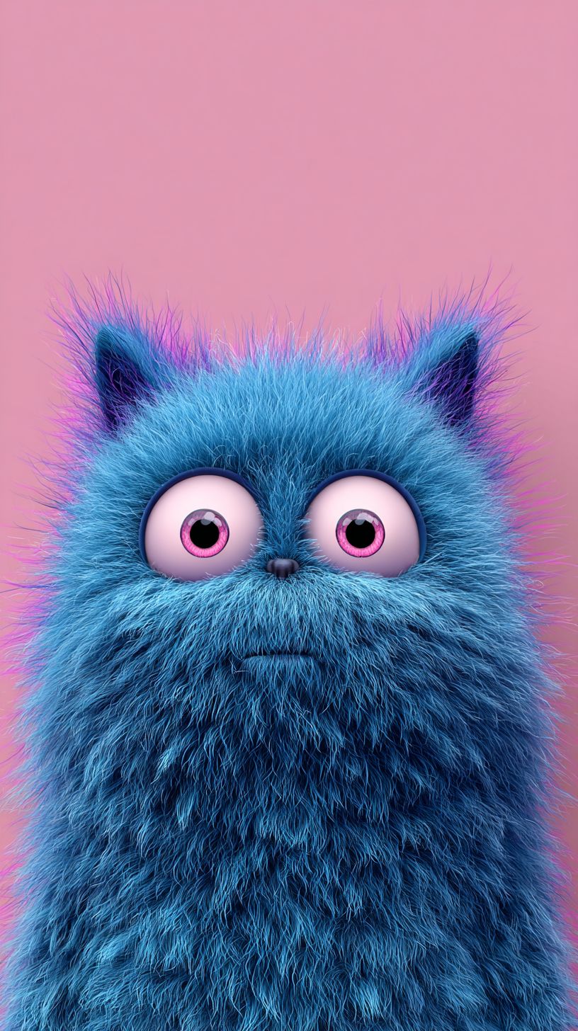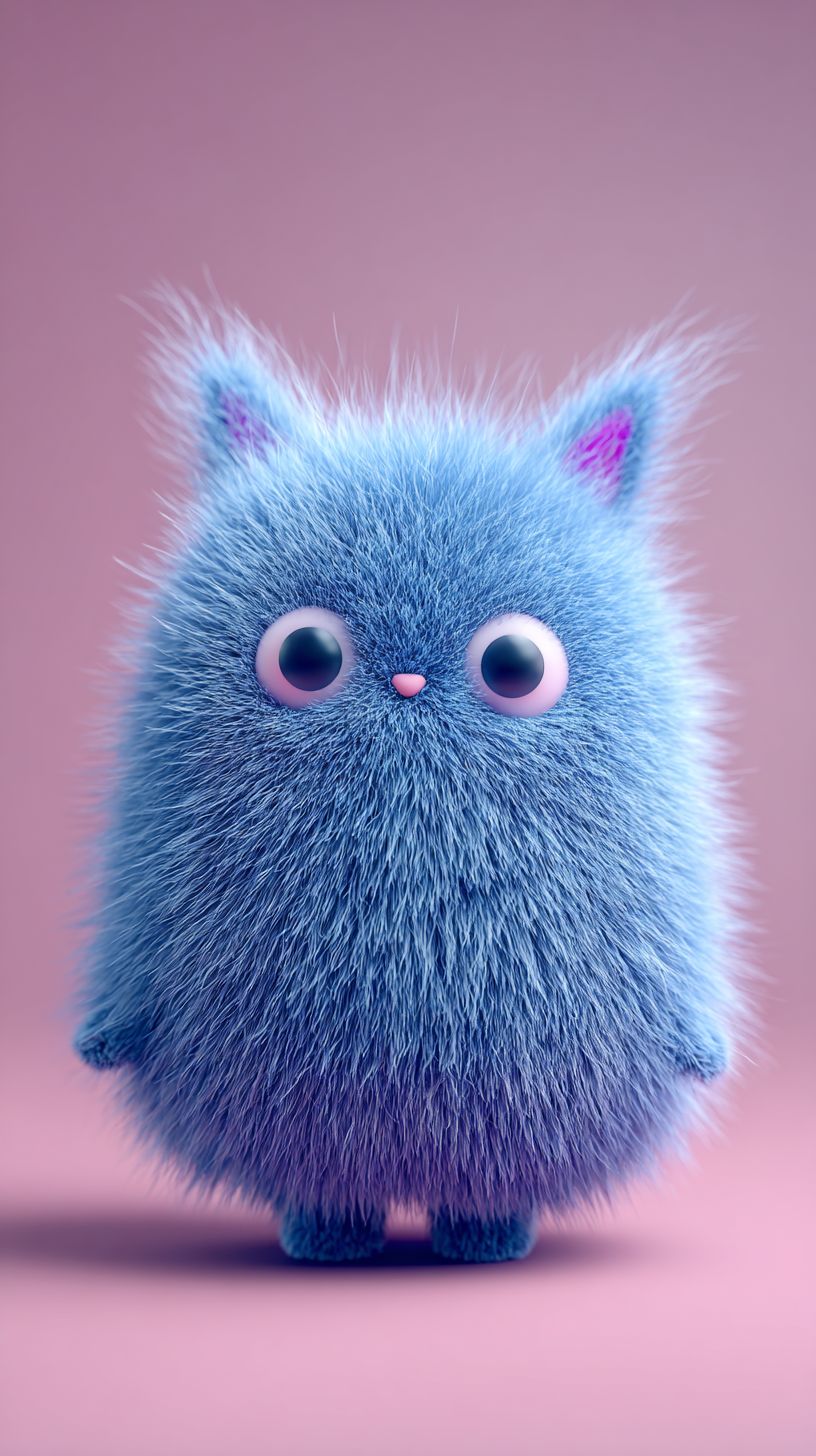 Cute blue monster cat, white background, cartoon style, cute pet wallpaper design, fluffy fur texture, adorable eyes, pink and purple color scheme, simple lines, soft lighting, high resolution, professional photography, sharp focus, intricate details. --ar 9:16 --raw --v 7.0
