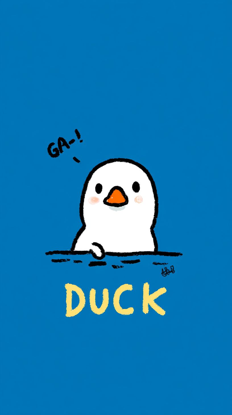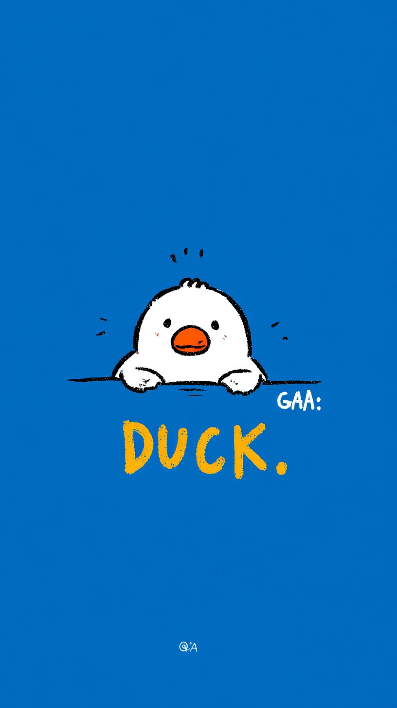 Minimalist cartoon illustration of a cute white duck (with an orange beak) peeking from the bottom, set against a solid bright blue background. Add playful hand-drawn yellow text "DUCK 不 必" and a tiny "GA~" detail. Use simple flat colors, clean outlines, and a cheerful, heartwarming mood. --ar 9:16 --raw