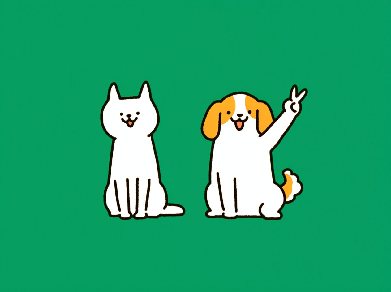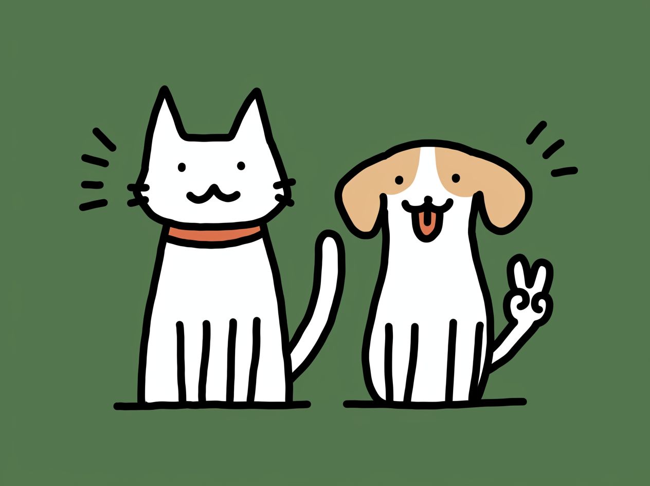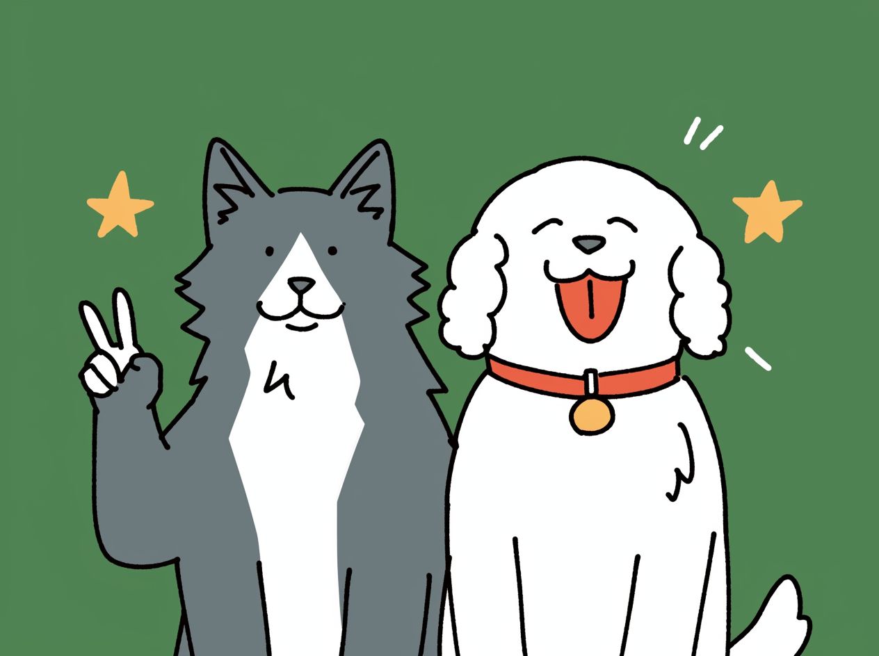 고양이와 개가 미소 지으며 평화의 손짓을 하고 있습니다
