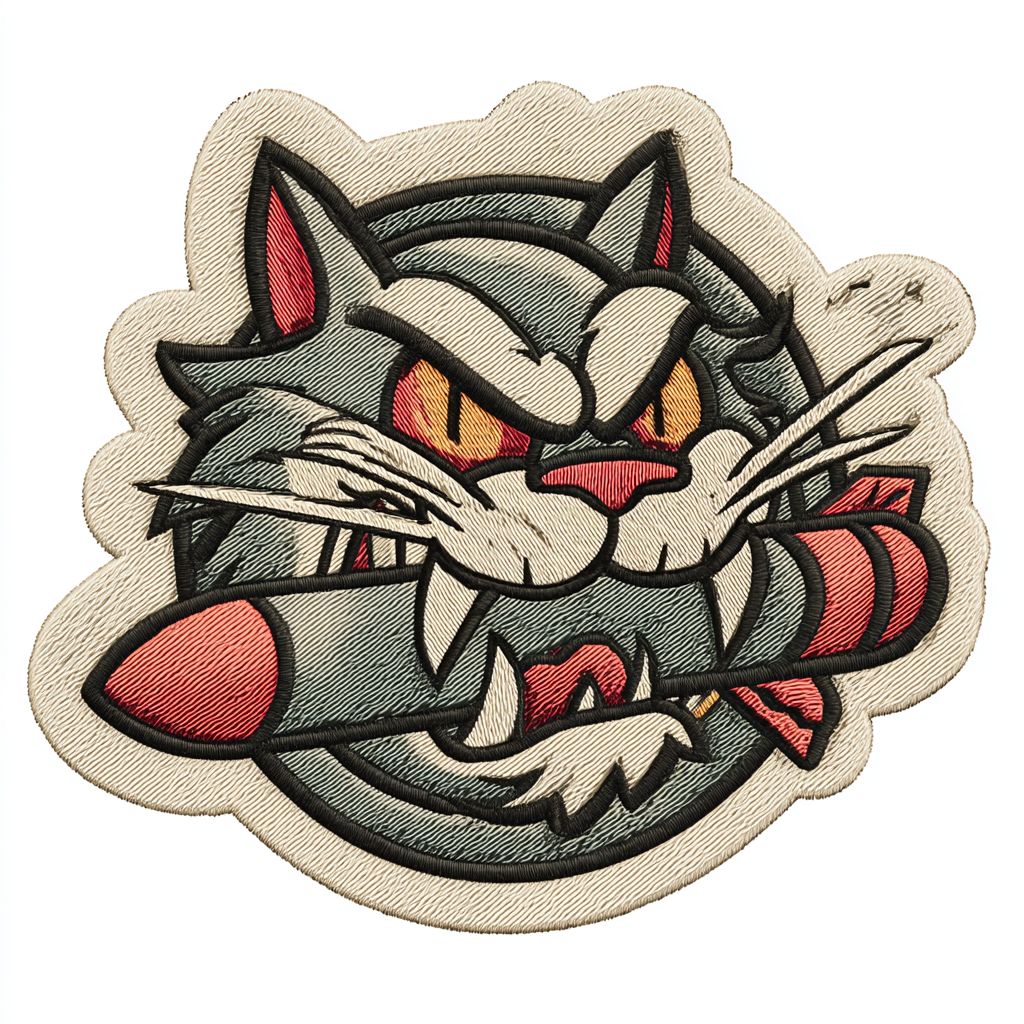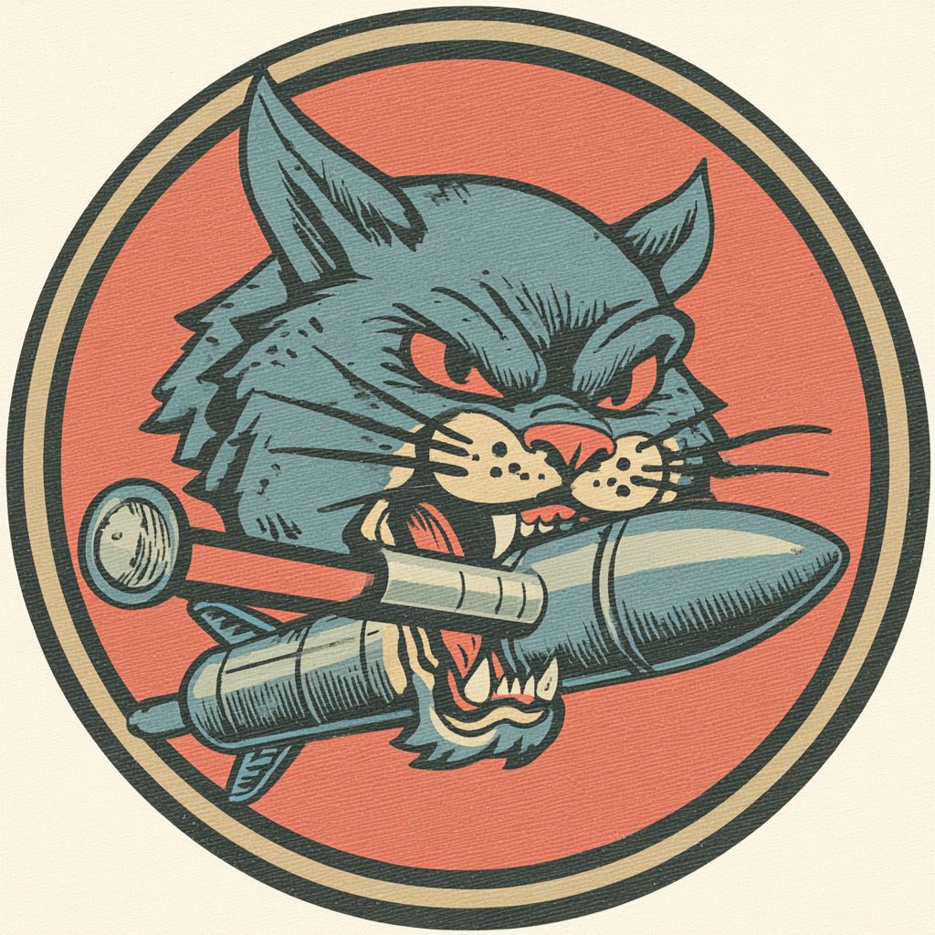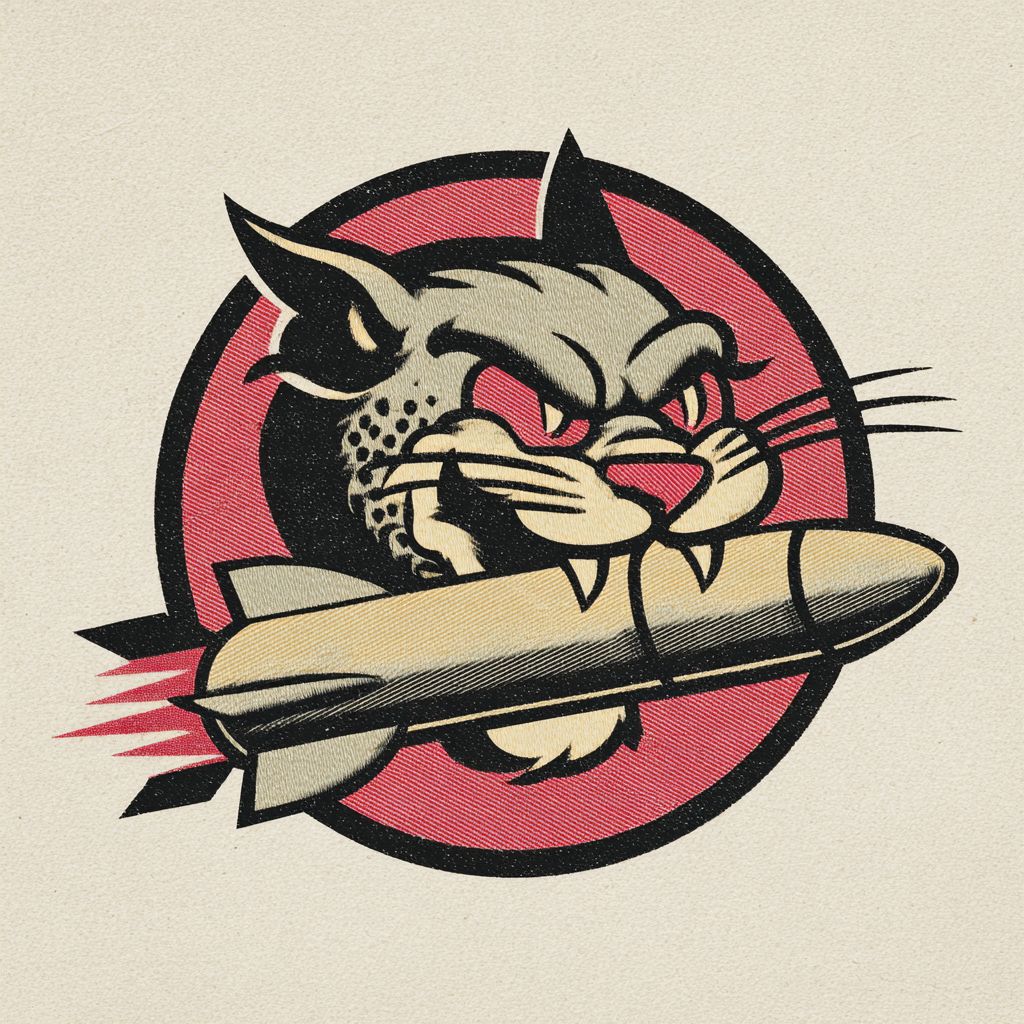 1940년대 미국 군대 비행대 엠블럼 일러스트레이션으로, 화난 만화 야생 고양이가 그려져 있으며, 붉은 눈으로 찡그린 표정을 짓고 큰 미사일을 가로로 물고 있습니다. 대담한 평면의 변 muted 색상, 최소한의 음영, 그라데이션 없음, 두꺼운 검은 윤곽선, 야생 고양이와 미사일의 실루엣을 따라 색이 변하지 않는 불규칙한 커스텀 형태의 추가 두꺼운 오버사이즈 테두리가 있는 엠블럼(완벽한 원형이 아님), 벡터 스타일, 질감 없음, 자수 없음, 스티치 질감 없음, 중앙 구도, 단조로운 배경이 특징입니다.