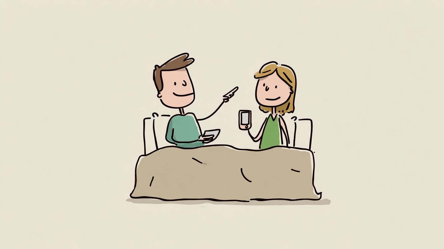 simple stick figure style drawing, a man and a woman sitting in bed, man pointing at woman's phone, woman holding the phone, very minimal lines, flat colors, no shading, cartoon doodle style, plain background --ar 16:9 --v 7.0