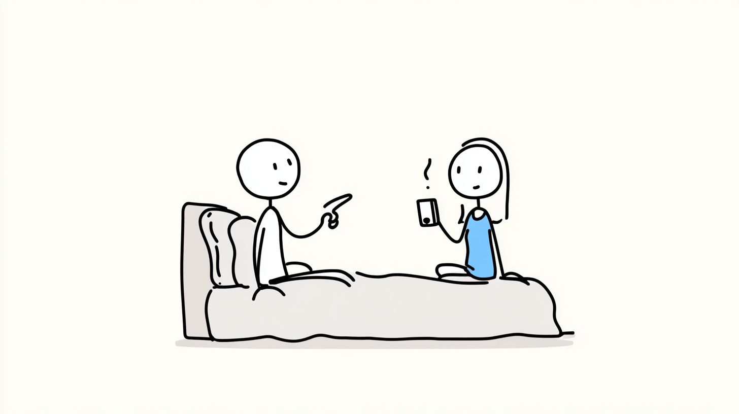 간단한 스틱 피겨 스타일의 그림, 남자와 여자가 침대에 앉아 있고, 남자가 여자의 휴대폰을 가리키고 있으며, 여자는 휴대폰을 들고 있다, 매우 미니멀한 선, 평면 색상, 음영 없음, 만화 낙서 스타일, 단순한 배경
