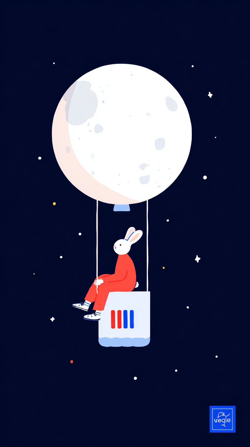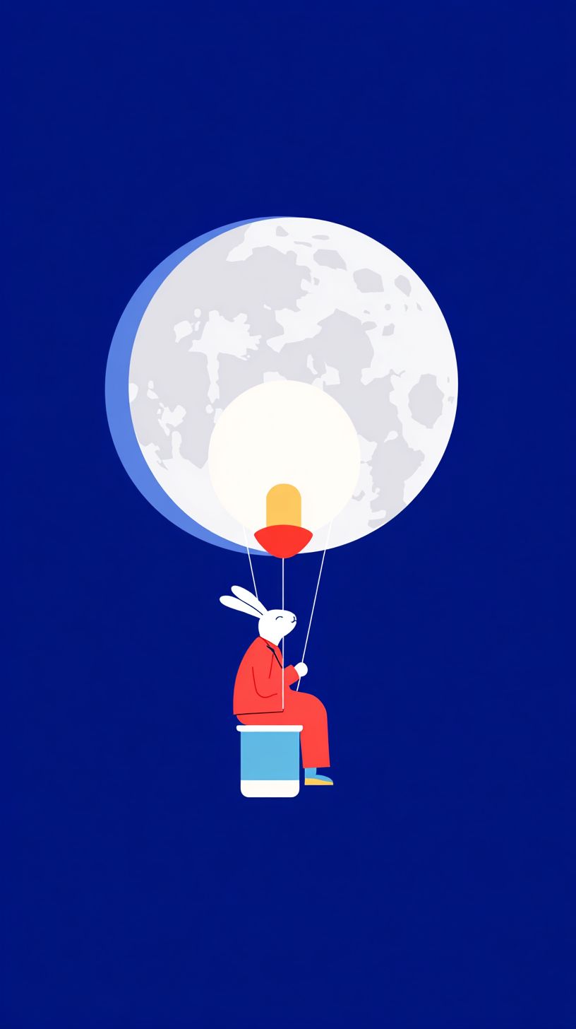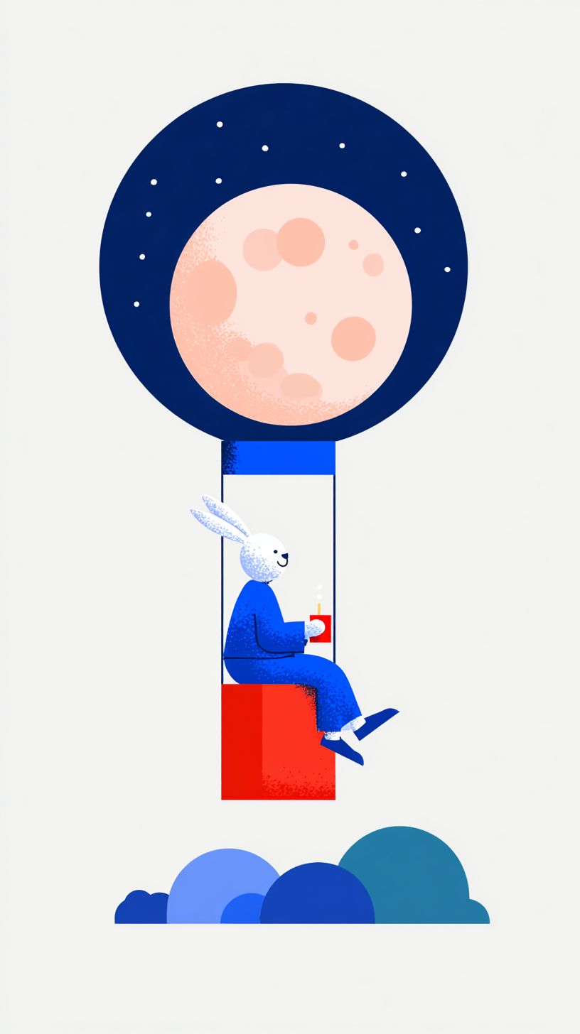 In a scene from an animated film at night, a rabbit is sitting on a water cup, which is being carried up into the sky by a hot air balloon transformed from the moon. The moon is round and bright. Relaxed and fashionable. This is an animated film style --ar 9:16 --sref 3649882589 --v 7.0