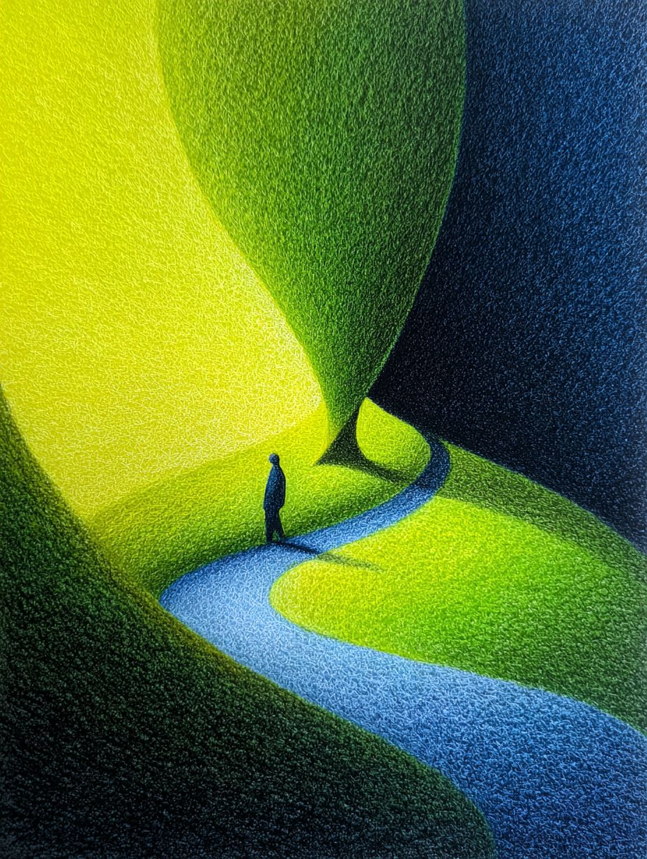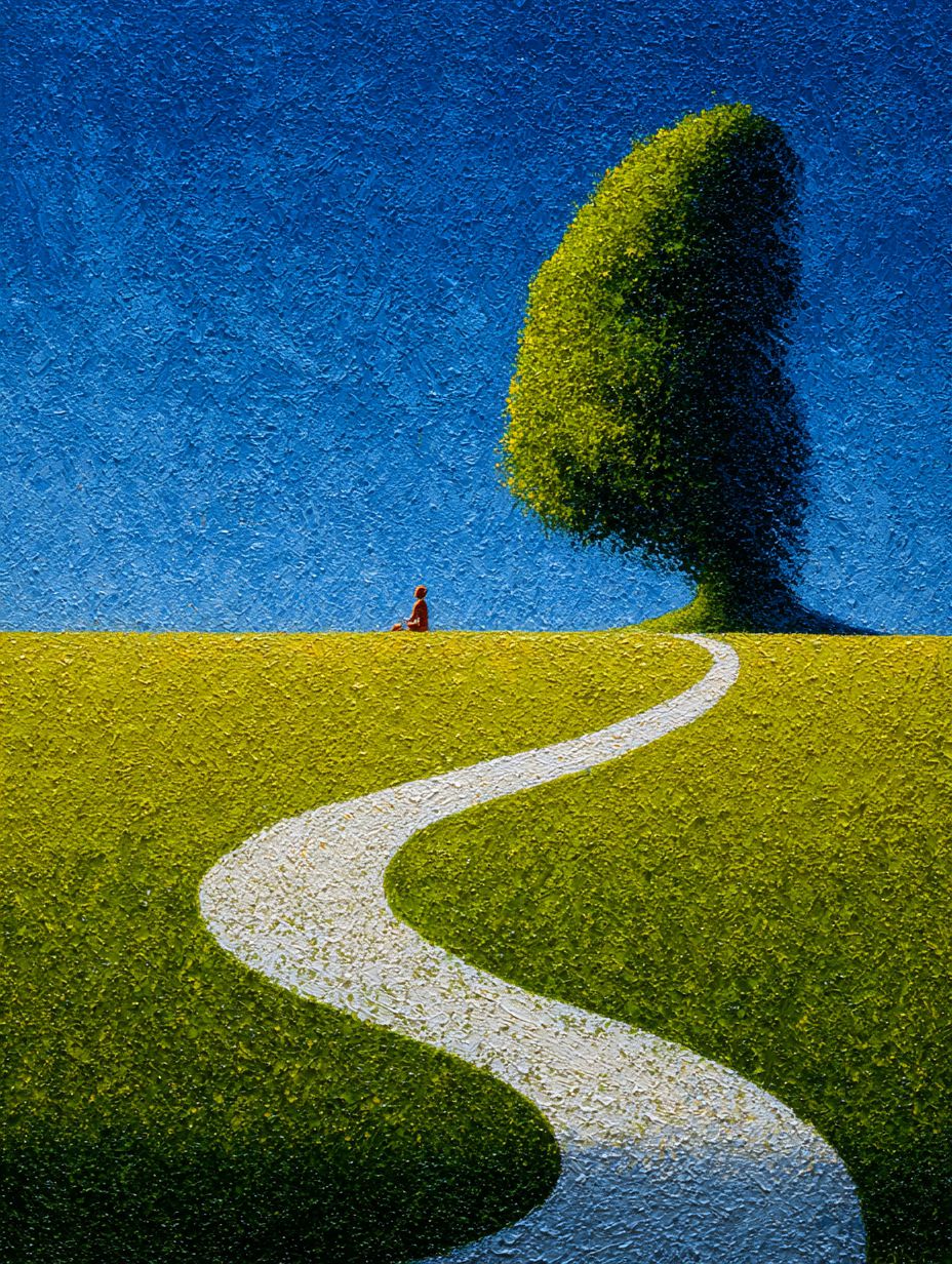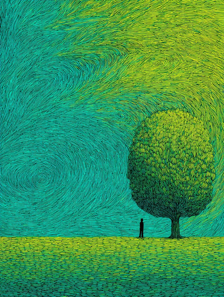 깔끔하게 그려진 짧은 곡선이 나무를 묘사하고 있으며, 아래쪽은 짙은 녹색, 위쪽은 연한 녹색으로 생기 넘치는 활력을 보여줍니다. 푸른 하늘과 어우러져 있습니다. 나무 아래에는 쌀알만 한 남자 아이가 있습니다.