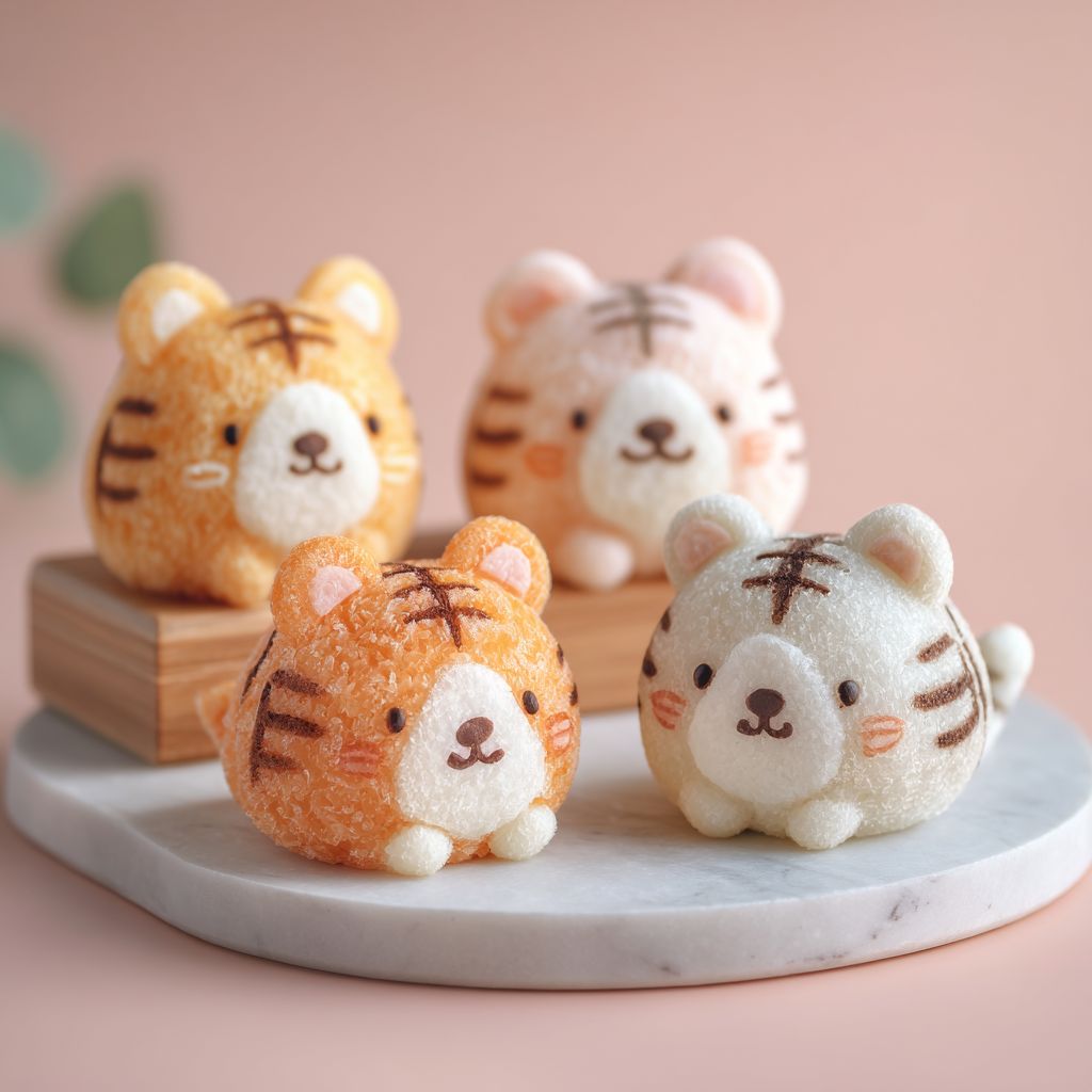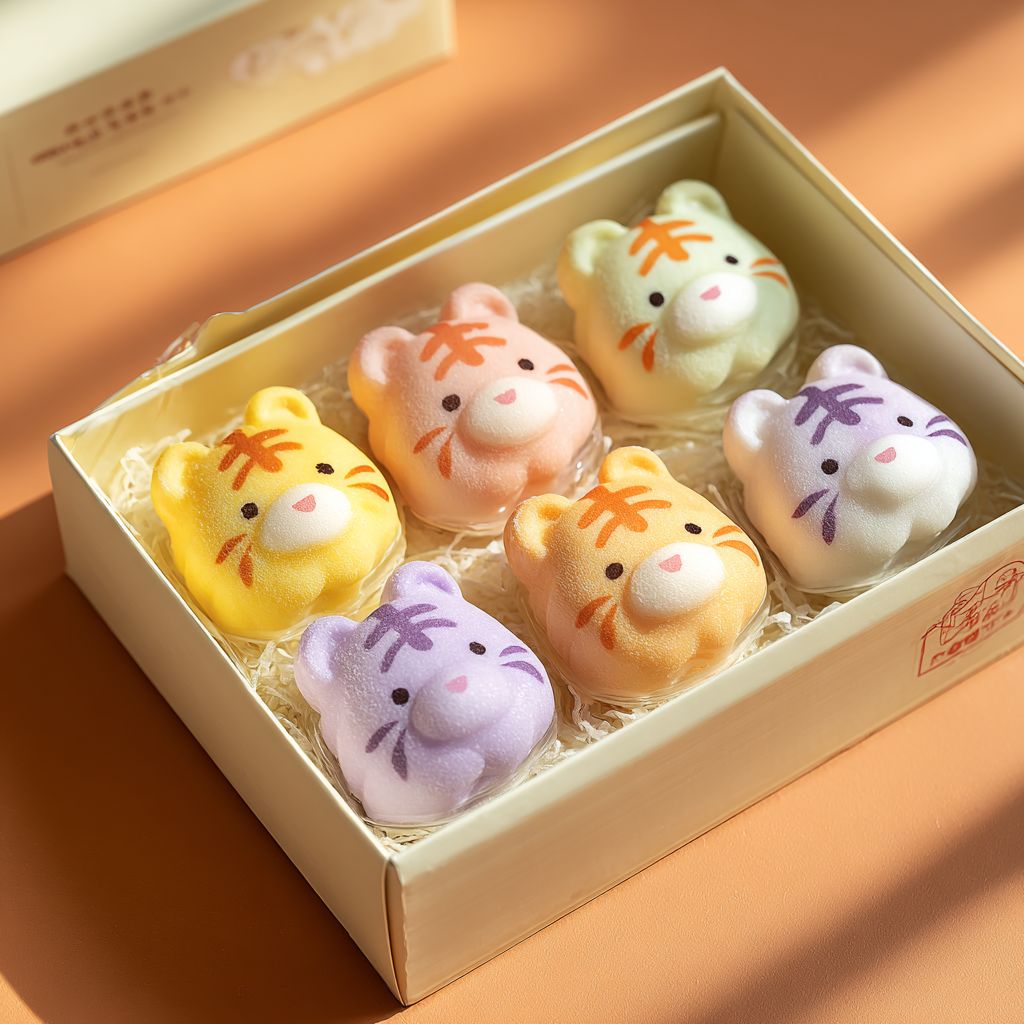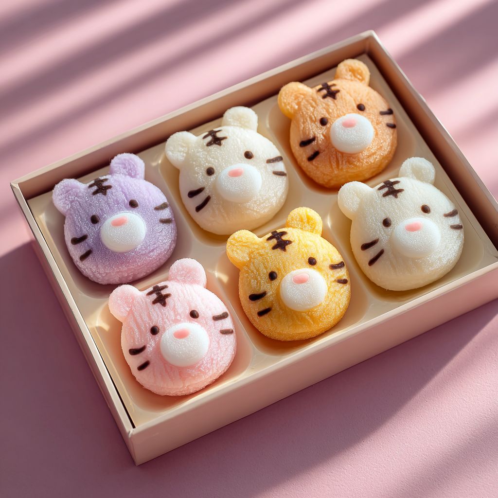 귀여운 호랑이 떡 선물 세트, 작은 호랑이 모양의 찹쌀떡, 프리미엄 포장, 부드러운 파스텔 색상, 현실감 있는 사진