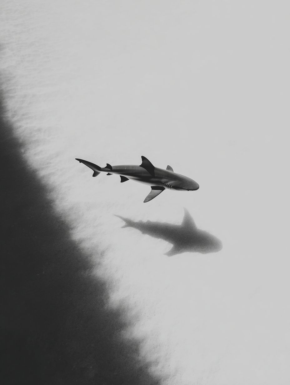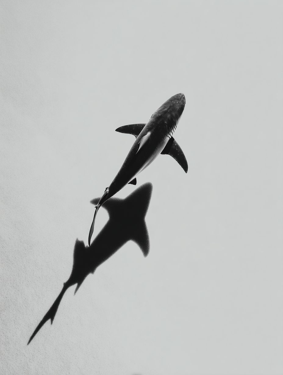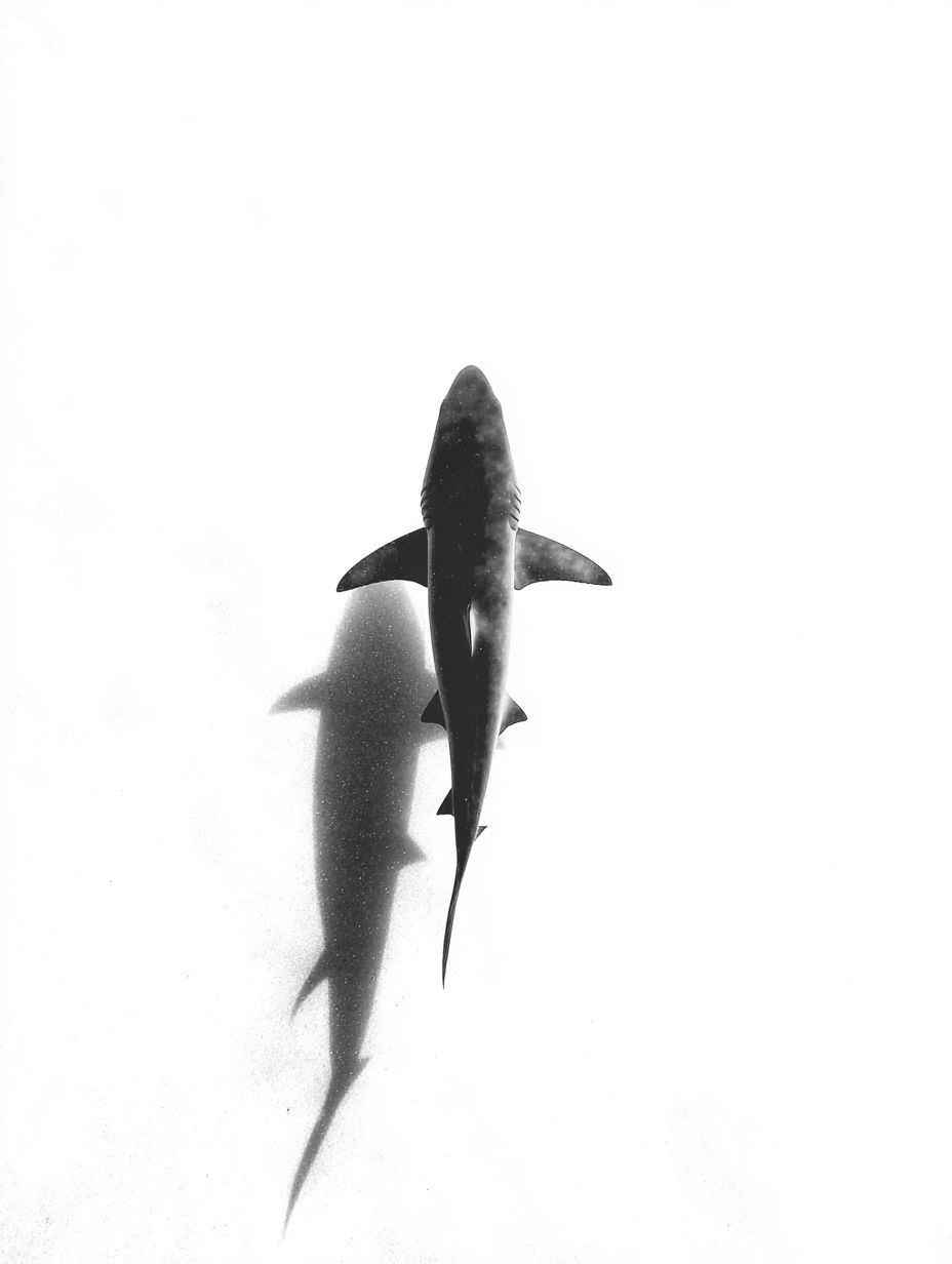 위에서 본 실제 같은 흑백 사진으로, 흰 배경 위에 공중에 떠 있는 상어를 보여줍니다.