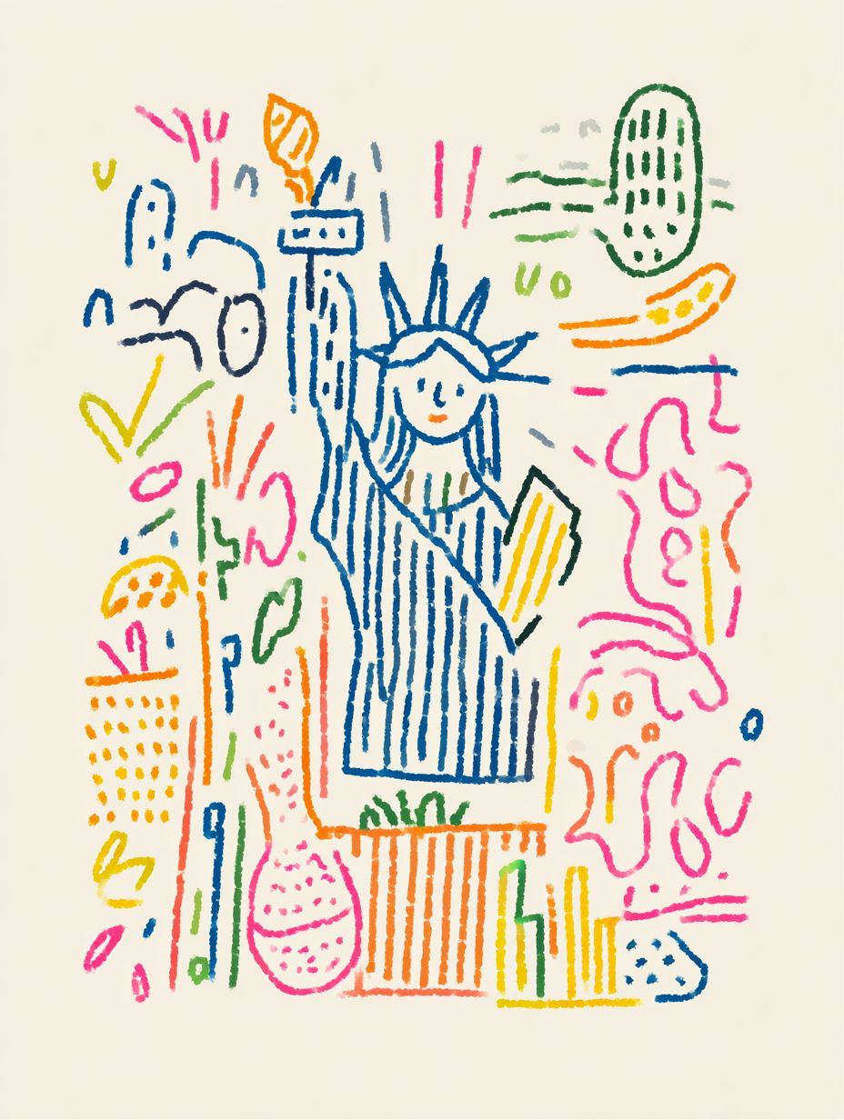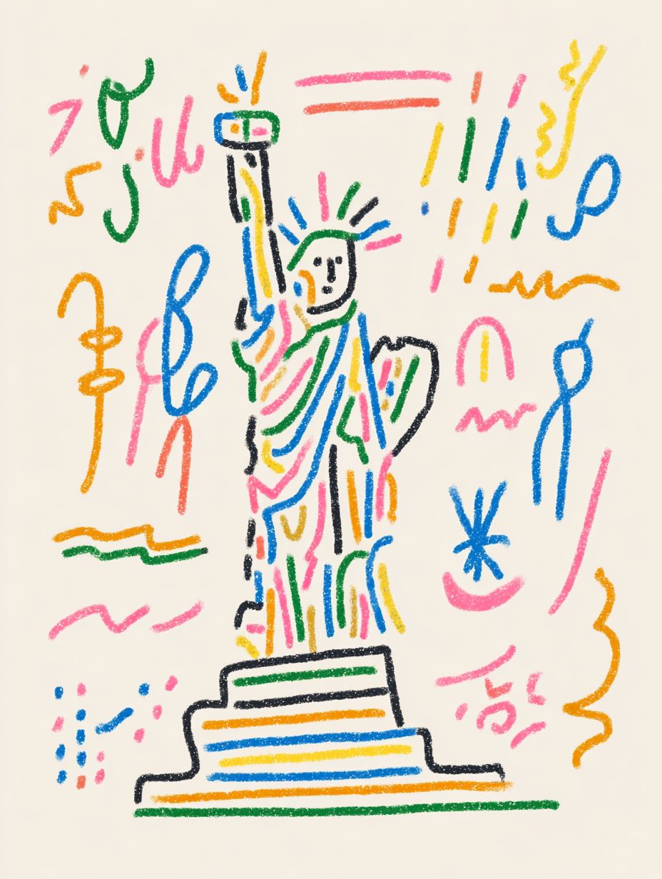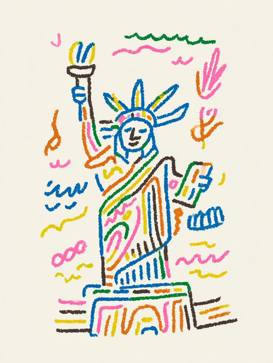multicolor doodle of Statue of Liberty --ar 3:4 --raw --sref 3868059321 --profile hceshpe --stylize 50