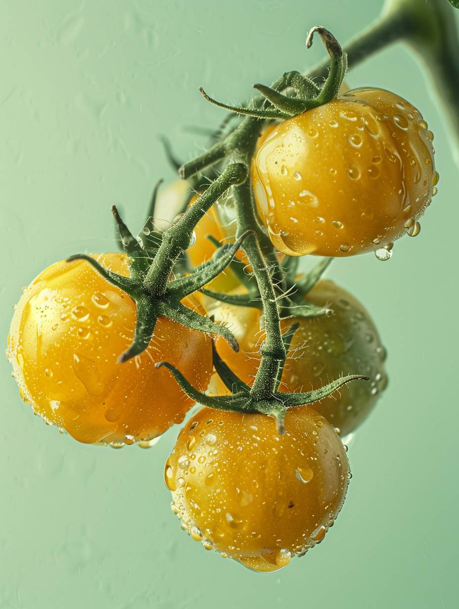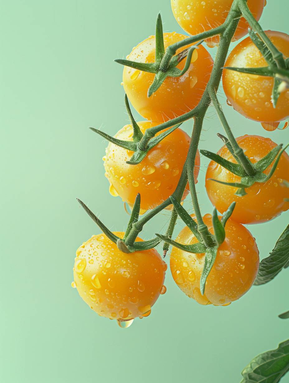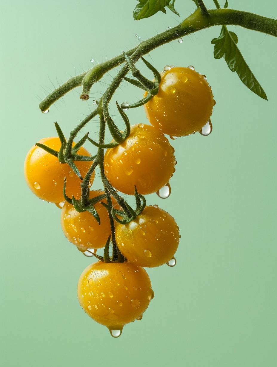 Tatsuya Tanaka, diagonal composition photography of yellow tomatoes hanging on the vine with water droplets against a light green background, presented in a dreamy, beautiful style. --ar 3:4 --v 6.0
