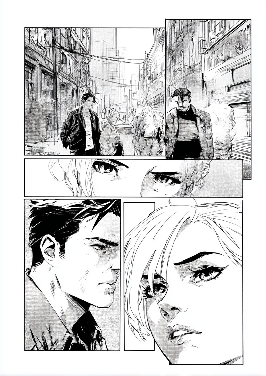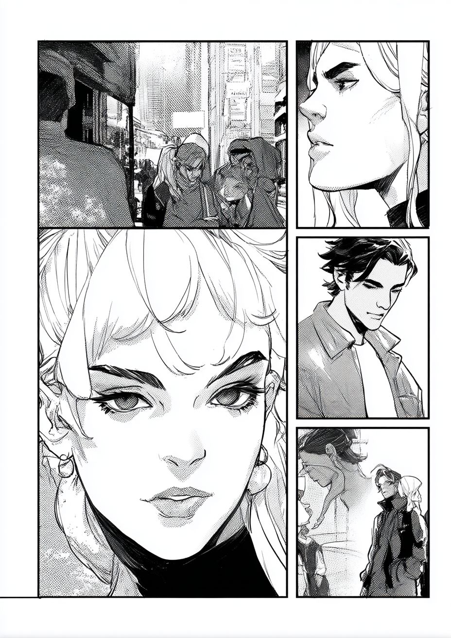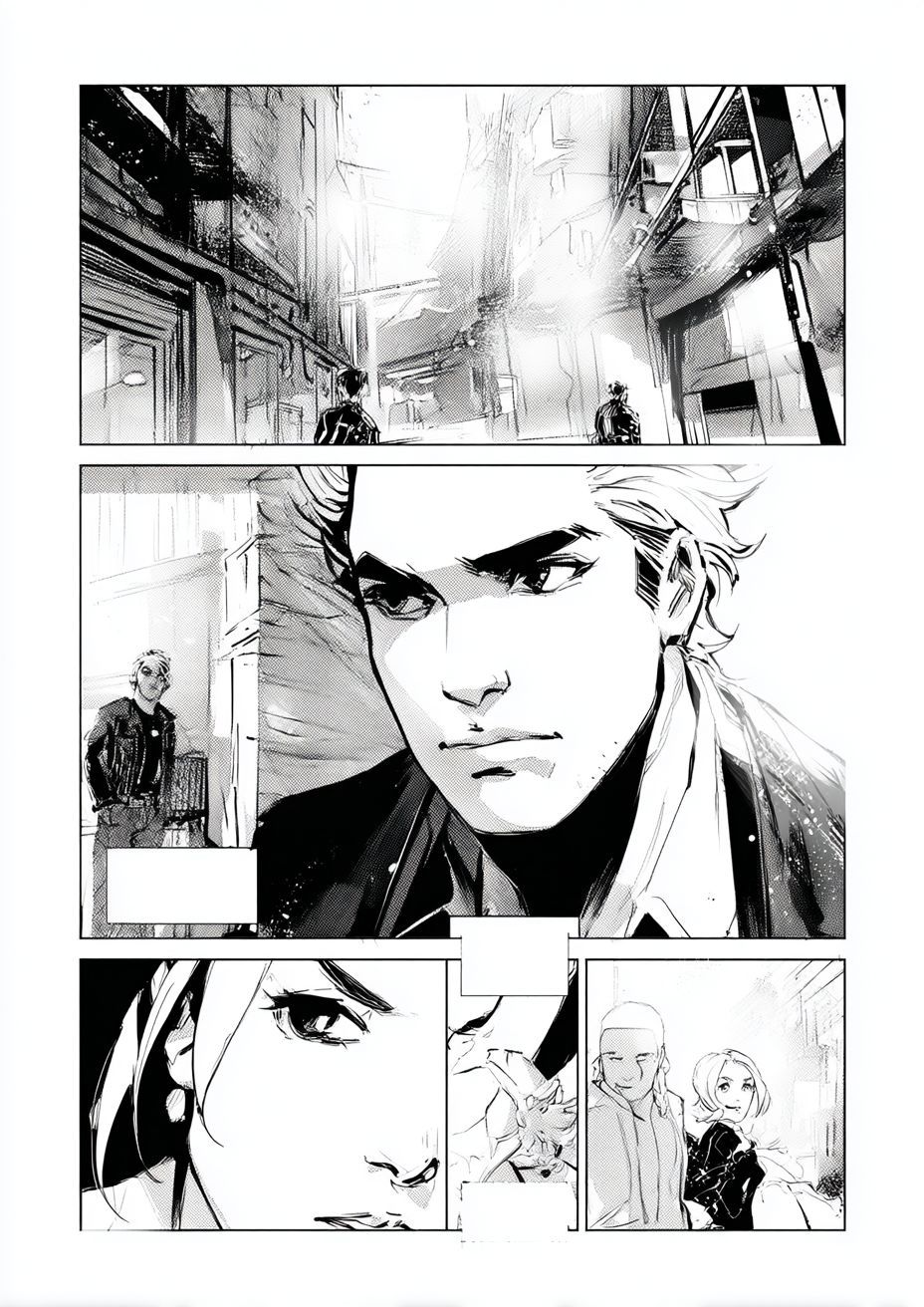 아티스트 카라 이와사키 스타일의 도시 모험 첫 번째 권 페이지, 세련된 선 작업과 만화에서 영감을 받은 역동성