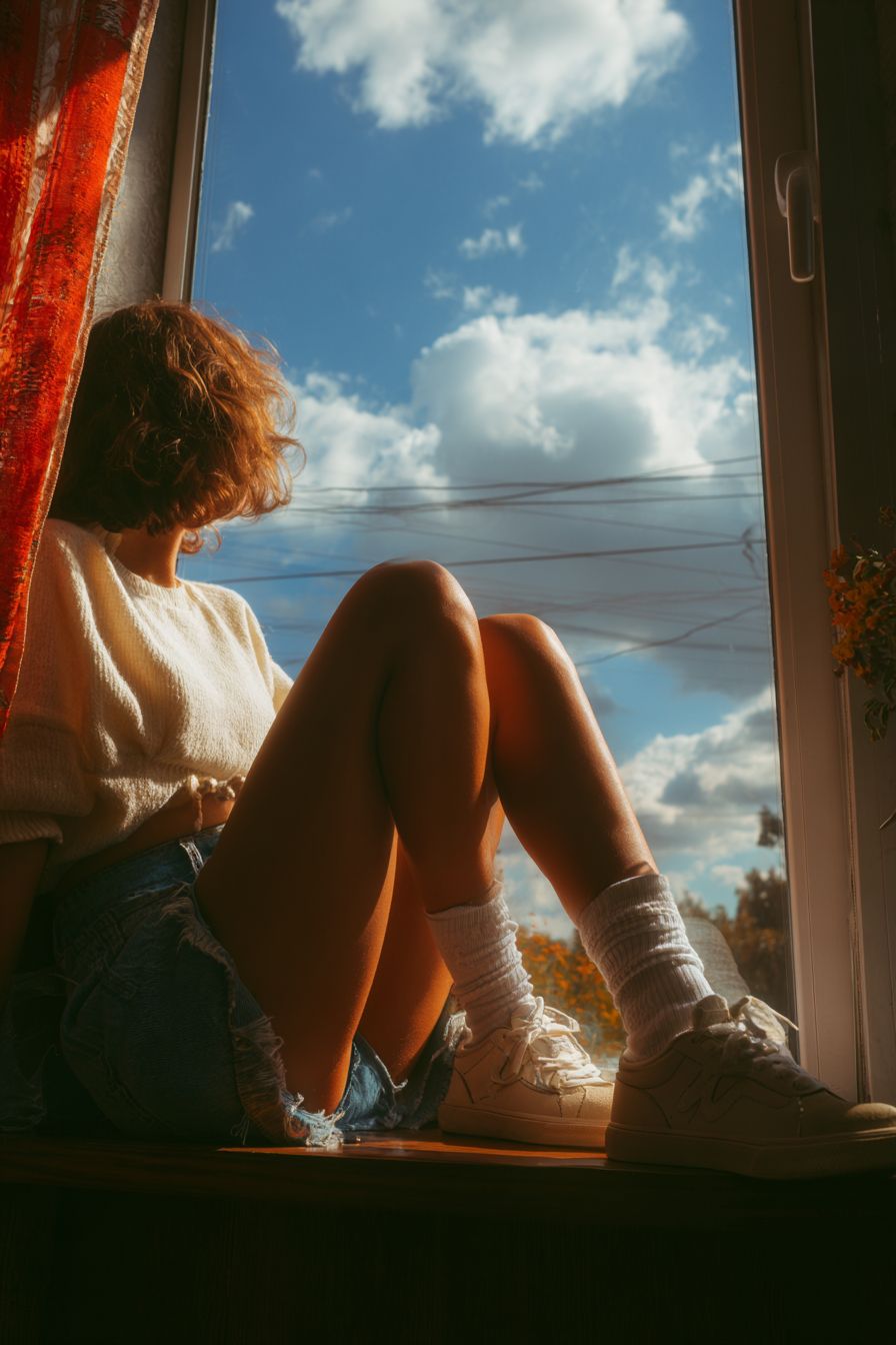 a woman is sitting with her legs hanging out the window. As if she's sitting by the window, enjoying putting her legs in the sunshine. --ar 2:3
