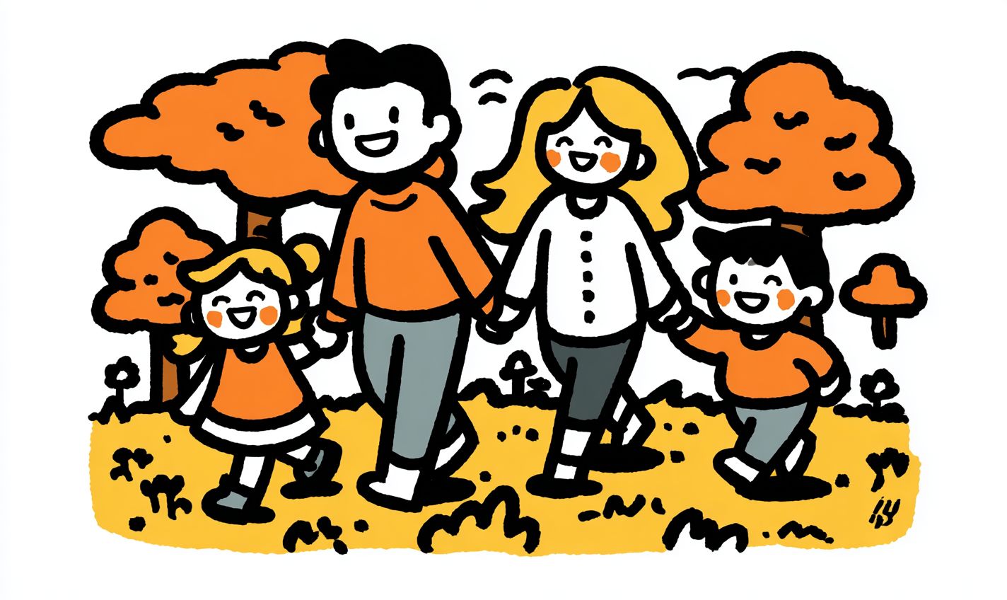 공원에서 함께 걷고 있는 행복한 가족의 만화 스타일 일러스트 어머니, 아버지, 어린 소녀, 어린 소년 모두 웃고 즐거워하며, 평면 벡터 디자인, 굵고 깨끗한 윤곽선, 밝고 단단한 색상, 최소한의 음영, 장난스럽고 간단한 모습, 하얀 배경, 프레임 없음.