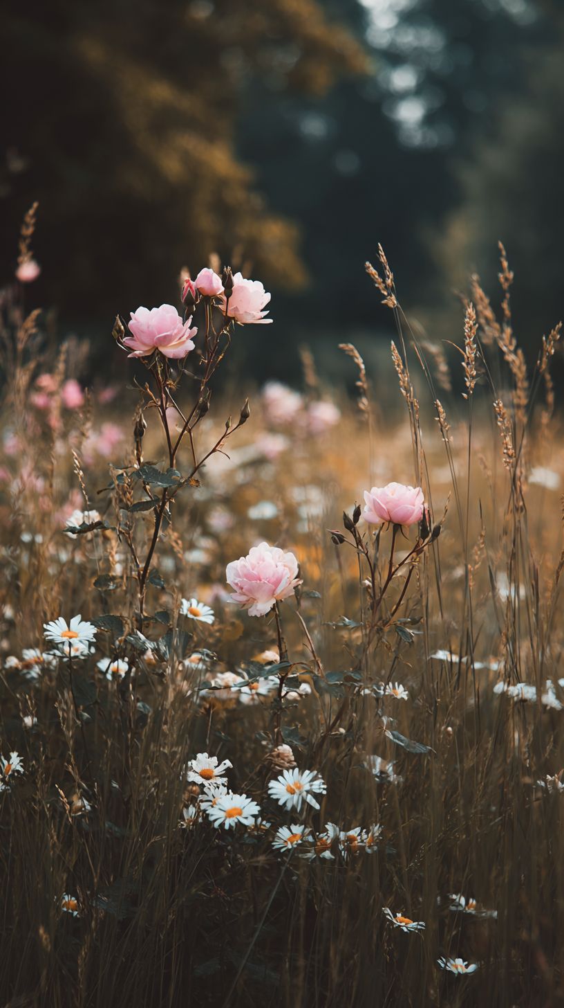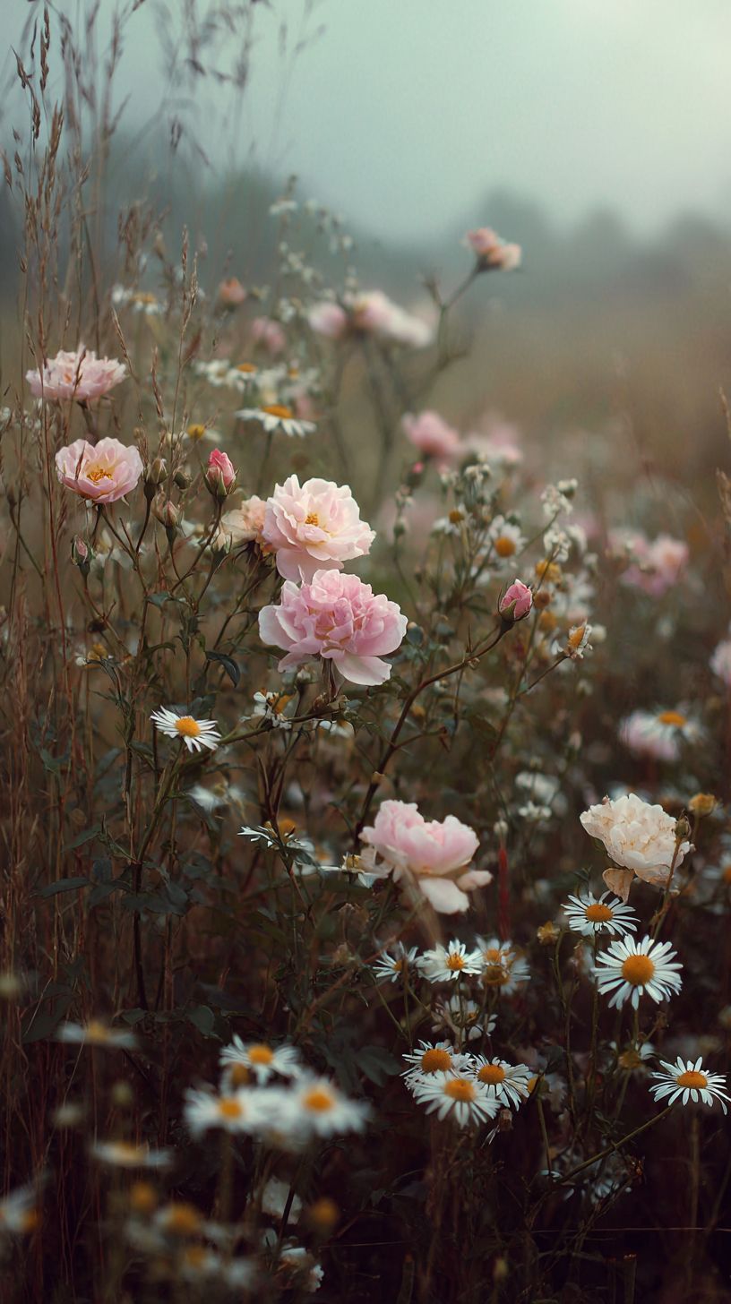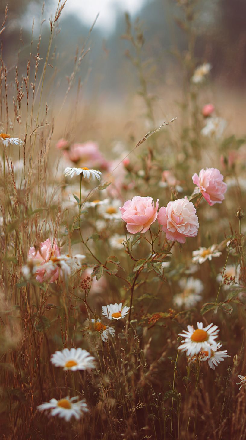 a field of wildflowers, captured in the soft light and ethereal style in the style of an iphone camera photo. the focus is on delicate pink roses and white daisies growing among tall grasses, with a blurred background that suggests a serene countryside setting. this scene evokes feelings of tranquility and nature's beauty. --ar 9:16 --v 7.0